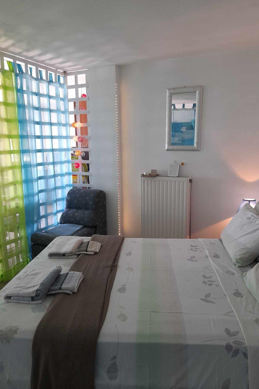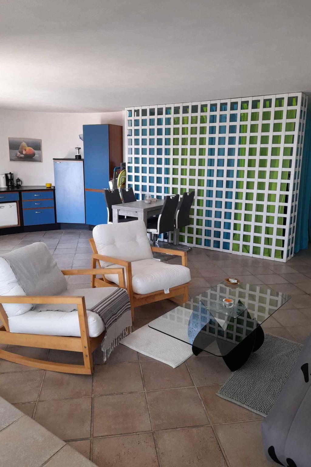 Ebenerdig für 4/5 Personen, Meerblick, offener Raum mit Küche mit Waschmaschine und Geschirrspüler/Wohnzimmer mit umwandelbarem Sofa/Esszimmer. Das Doppelbett befindet sich hinter einem hübsch dekorierten Claustra. In dem Zimmer mit zwei Einzelbetten (115 cm) kann ein Klappbett aufgestellt werden, wenn die Gäste das umbaubare Sofa nicht für eine eventuelle fünfte Person nutzen möchten. Das Badezimmer ist klein, aber gut gestaltet und verfügt über eine italienische Dusche. Es ist vollständig klimatisiert. Bettwäsche und Handtücher werden 1 Mal alle 7 Nächte gewechselt. Wenn Sie häufiger reisen möchten, können Sie Folgendes mieten