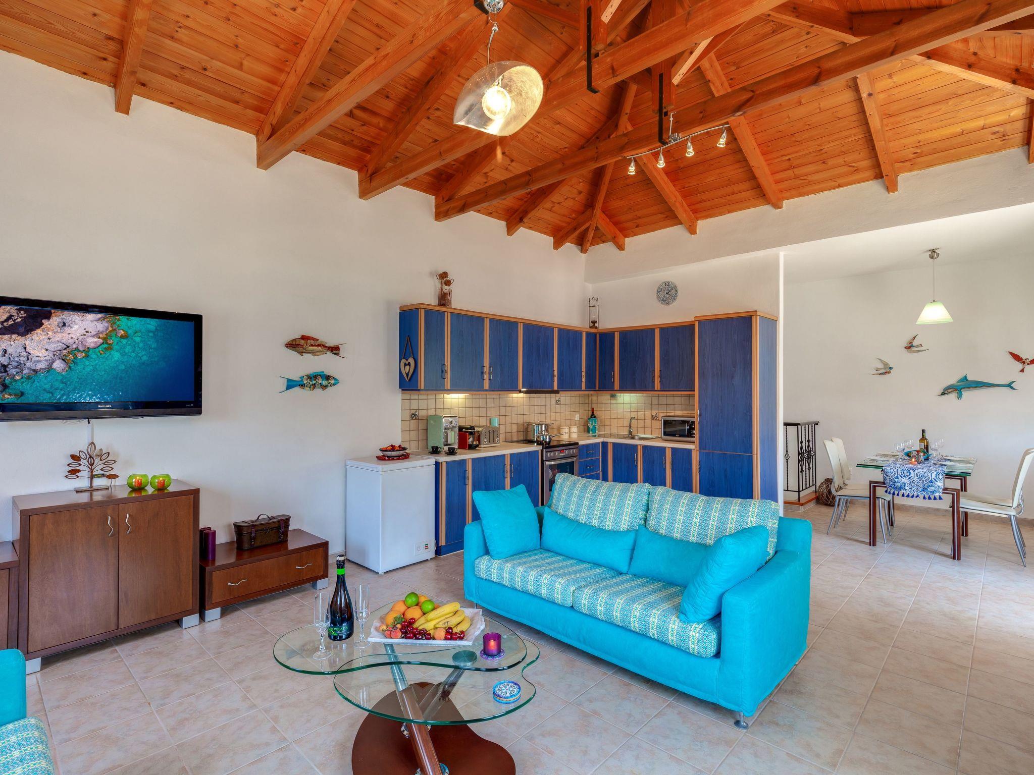 Im Inneren bietet die Villa Kallisti-Artemis eine nahtlose Mischung aus modernem Luxus und traditionellen Elementen. Das Dekor und die Farben sind eine Hommage an die minoische Epoche und sorgen für einen luxuriösen und komfortablen Aufenthalt. Im Erdgeschoss befinden sich zwei gemütliche Schlafzimmer, die jeweils mit geräumigen Schränken, Klimaanlage und Smart-TV ausgestattet sind, sowie ein gut ausgestattetes Badezimmer mit Badewanne, Waschmaschine und Haartrockner. Im Obergeschoss befinden sich ein geräumiger Wohn-/Essbereich und eine voll ausgestattete Küche, die das Engagement der Villa für absolute Entspannung und Lebensqualität unterstreichen.