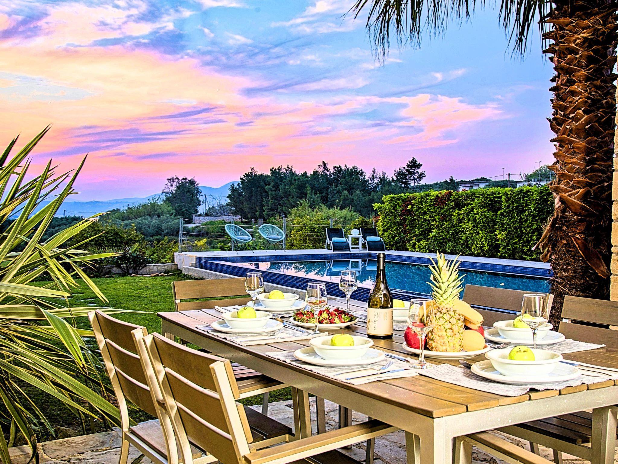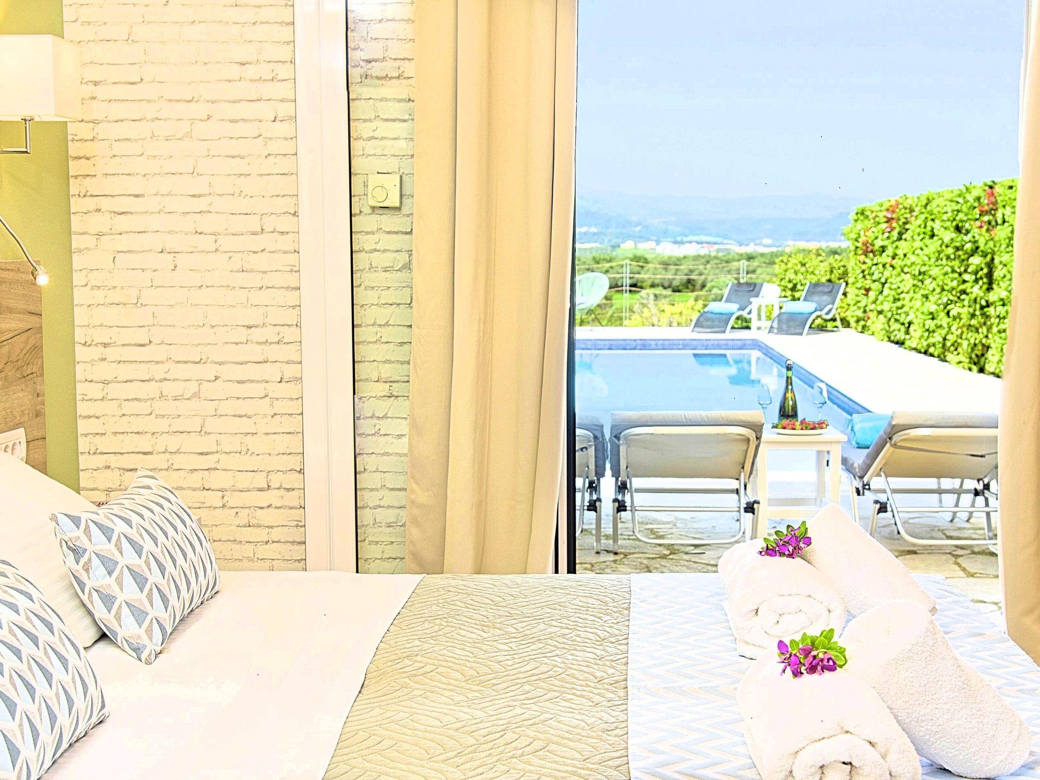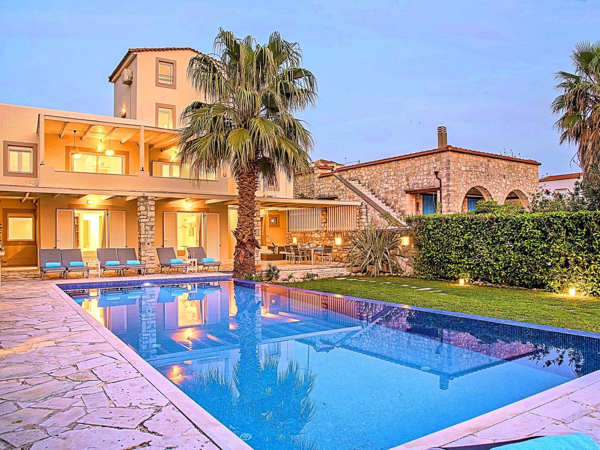 Das modern gestaltete Hotel bietet seinen Gästen alles, was sie für einen erholsamen und angenehmen Urlaub benötigen. Die Zimmer des Herrenhauses sind funktionell eingerichtet. Die 5 Schlafzimmer sind alle voll ausgestattet und geräumig, alle mit eigenem Bad. Die Aufenthaltsräume, Esszimmer und Küchen sind mit allem ausgestattet, was man für einen komfortablen Urlaub braucht. Die Gärten der Villa sind von handgefertigten Steinzäunen umgeben, die mit blühenden Sträuchern, Obstbäumen und weißem Oleander bepflanzt sind. Schwimmen Sie im privaten Pool. Genießen Sie Ihren Kaffee oder ein Getränk auf einer der Terrassen unserer Villa, mit Blick auf die Weißen Berge und den Sandstrand von Georgioupolis. Während Sie auf das Tal blicken, das das Dorf umgibt und von einem dichten Olivenhain bedeckt ist, entspannen Sie sich inmitten der Aromen von Rosmarin, Lavendel und Minze, die Sie in einen Traum vom natürlichen Duft des kretischen Landes versetzen.