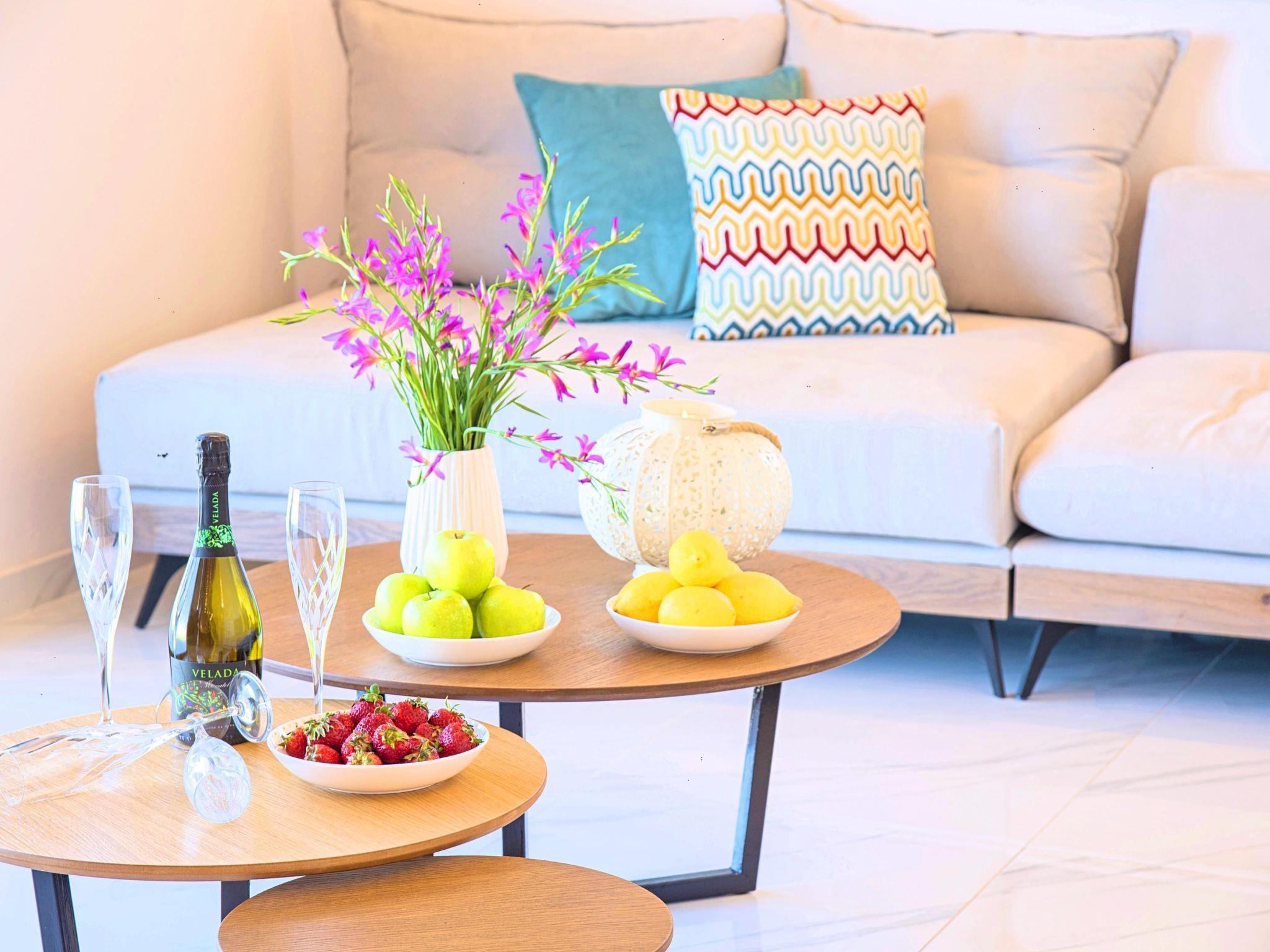 Ausstattung * Ein Wohnzimmer mit einem großen Ecksofa (bietet Platz für bis zu zwei Personen) mit direktem Zugang zur Terrasse und zum Poolbereich * Eine voll ausgestattete Küche mit Backofen, Mikrowelle, Geschirrspüler, Kühlschrank, Kaffeemaschine, Teekocher, Toaster, Wasserkocher und Essbereich. * Ein großes Badezimmer mit begehbarer separater Dusche. * Ein Schlafzimmer mit zwei zusammengeschobenen Einzelbetten, das einen herrlichen Blick auf die weißen Berge bietet. * Ein großes Badezimmer mit begehbarer separater Dusche. * Ein zweites Schlafzimmer mit einem Queen-Size-Doppelbett und direktem Zugang zum Garten und dem Sitzbereich im Freien. * Ein drittes Schlafzimmer mit einem Queen-Size-Doppelbett und direktem Zugang zum Garten und der Sitzecke im Freien. Allgemeine Ausstattung * Smart TV im Wohnzimmer. * Klimaanlage in allen Bereichen. * Waschmaschine / Trockner. * Bügeleisen und Bügelbrett. * Tresorfach. * Haartrockner in beiden Bädern. * Bettwäsche und Handtücher. * Toilettenartikel. * Handtücher für das Schwimmbad. * Babybett. * Hochstuhl für Kinder. * Handtücher und Bettwäsche werden alle 3 bis 4 Tage gewechselt und gereinigt.