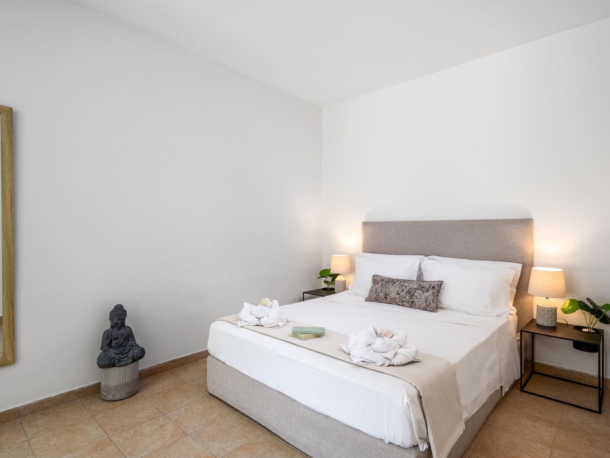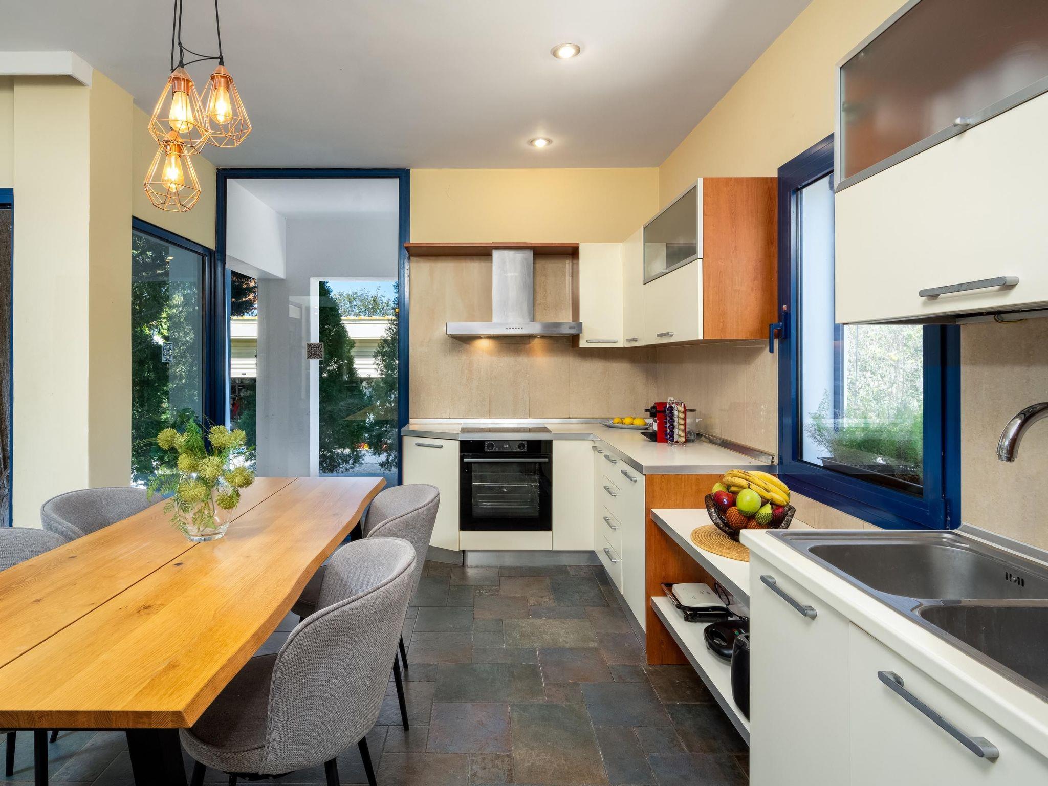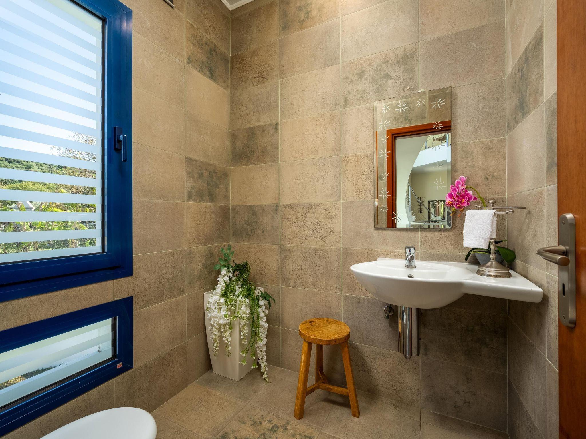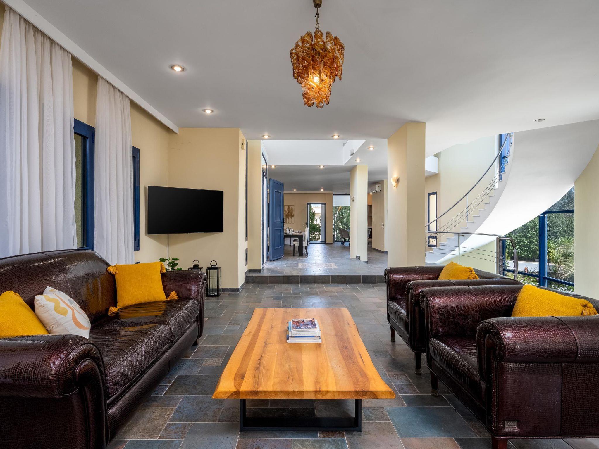 Alle Zimmer und Innenräume sind geräumig und sonnig und in einem modernen Stil mit warmen Farbtönen und kunstvollen Details eingerichtet. Die Themis Private Villa bietet Ihnen eine ruhige und private Unterkunft und verfügt über fünf moderne und gemütliche Schlafzimmer. Es gibt 2 Schlafzimmer mit Doppelbetten und Einzelschlafsofas. Jedes von ihnen verfügt über ein eigenes Badezimmer. Eines der Bäder verfügt über eine entspannende Badewanne mit Whirlpool und eine Dusche. Das andere Badezimmer verfügt über eine Dusche. Außerdem gibt es 2 Schlafzimmer mit Doppelbetten. Schließlich gibt es noch ein Schlafzimmer mit 3 Doppelbetten und einem eigenen Badezimmer mit Dusche. Außerdem gibt es noch ein Badezimmer mit Dusche und ein WC. Alle Schlafzimmer sind voll klimatisiert. Es gibt eine voll ausgestattete Küche für die Zubereitung von Mahlzeiten, die vom Sitzbereich aus begleitet werden. Außerdem gibt es ein gemütliches großes Wohnzimmer. Es gibt kostenlosen Wifi-Zugang im gesamten Haus. Die gesamte Atmosphäre der Villa strahlt Ruhe und Komfort aus, gebadet in reichlich Sonnenlicht, dekoriert mit schönen Blumen und griechischen Statuen, eine von ihnen, eine Miniaturnachbildung der außergewöhnlichen Nike von Samothrake. Im Außenbereich der Villa befindet sich ein privater Swimmingpool mit Sonnenliegen zum Entspannen in den heißen Sommertagen, während Sie an Ihrer Bräune arbeiten. Es gibt auch Grillmöglichkeiten, wo Sie ein tolles Essen für ein abendliches Beisammensein mit Familie und Freunden zubereiten können. Außerdem gibt es eine Tischtennisplatte und ein Laufband, damit Sie während Ihres Urlaubs in Form bleiben!