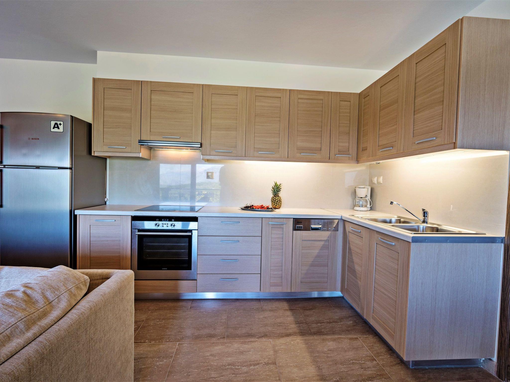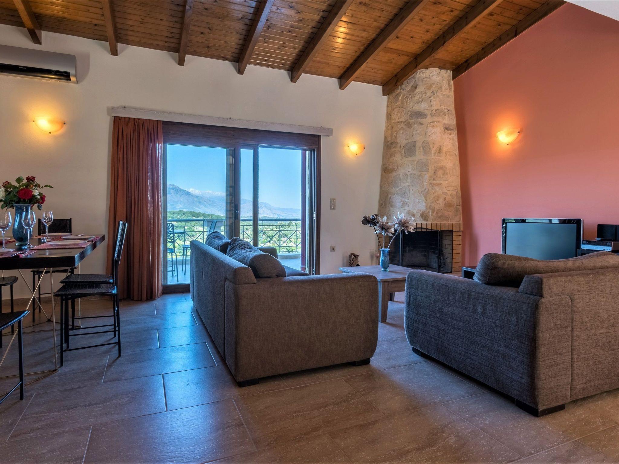 Zwei weitere Wohnungen befinden sich im zweiten Stock, die Häuser "Arethousa" und "Hestia", die identisch sind und sich über 2 Etagen erstrecken. Im Erdgeschoss befinden sich ein luftiges Wohnzimmer mit Küche, ein Doppelschlafzimmer und ein Badezimmer mit Regendusche, Toilette, Handwaschbecken und Haartrockner, während sich im Obergeschoss 2 weitere Doppelschlafzimmer sowie ein Badezimmer mit Hydromassage, Toilette, Handwaschbecken und Haartrockner befinden. Von den Balkonen aus hat man einen herrlichen Panoramablick auf das Meer und die Berge. In jedem dieser Häuser können bis zu 7 Personen übernachten, 6 in den Schlafzimmern und 1 im Wohnzimmer.