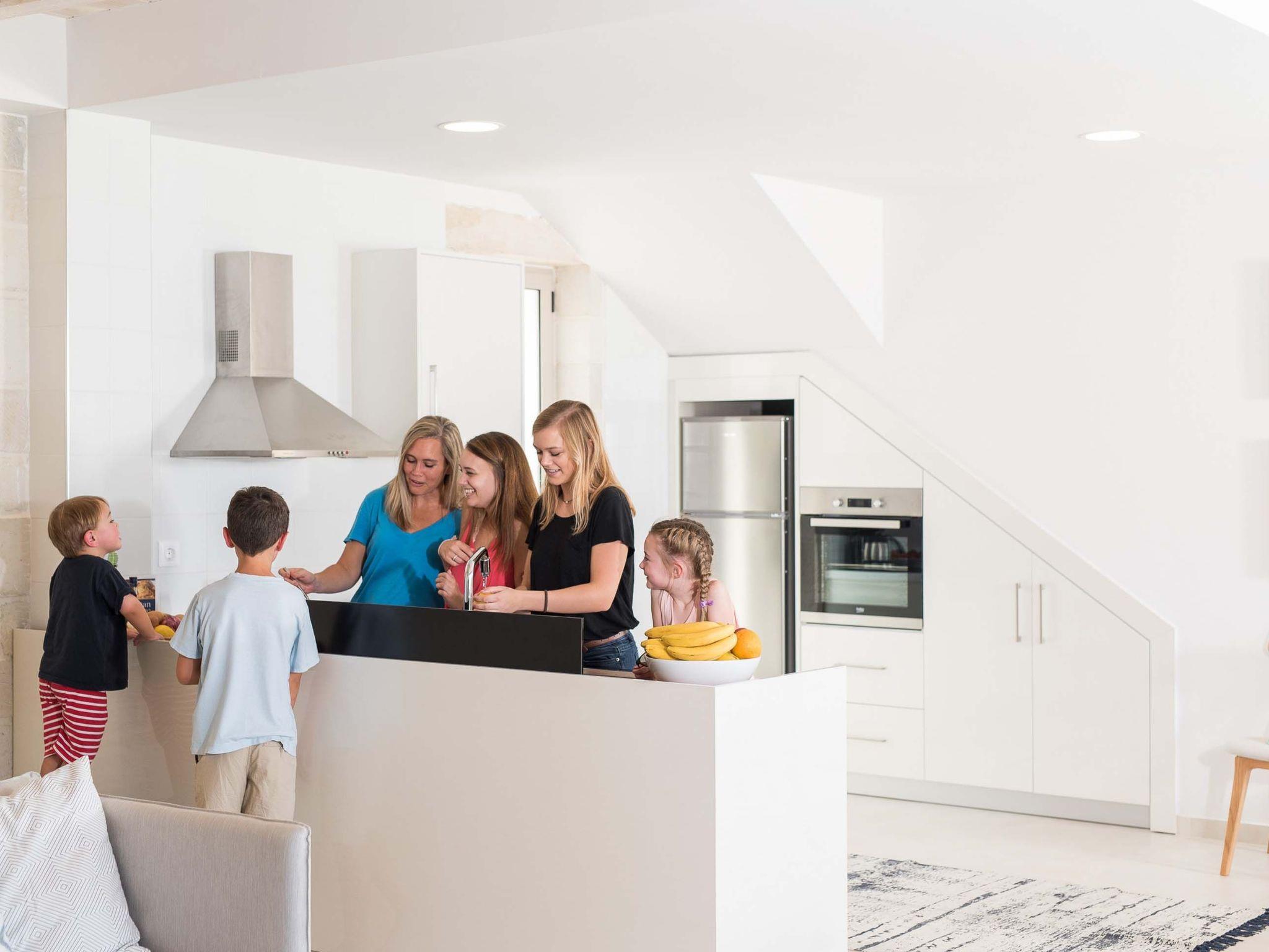 Offene, voll ausgestattete Küche mit einem Essbereich für 8 Personen und modernen Geräten