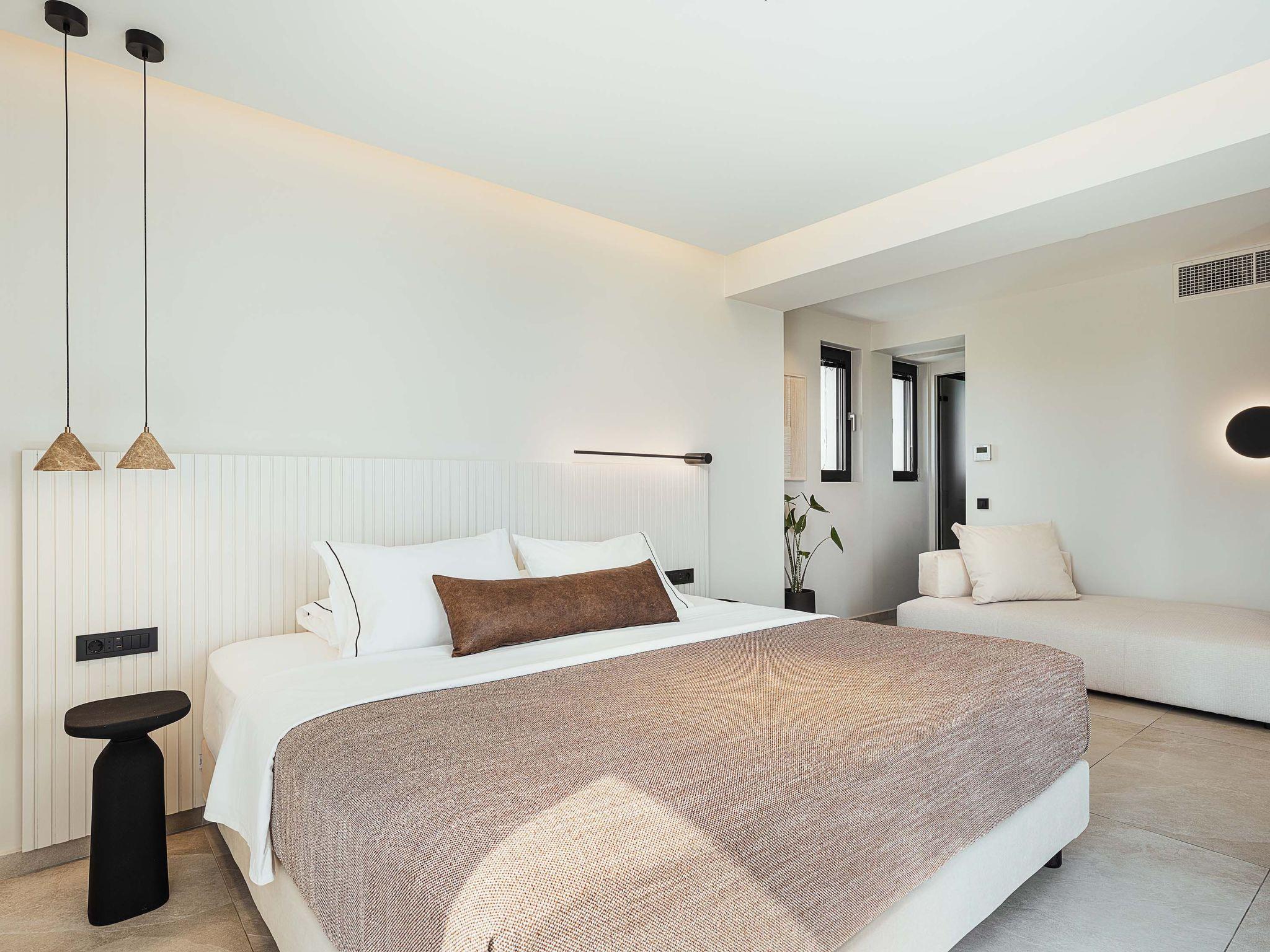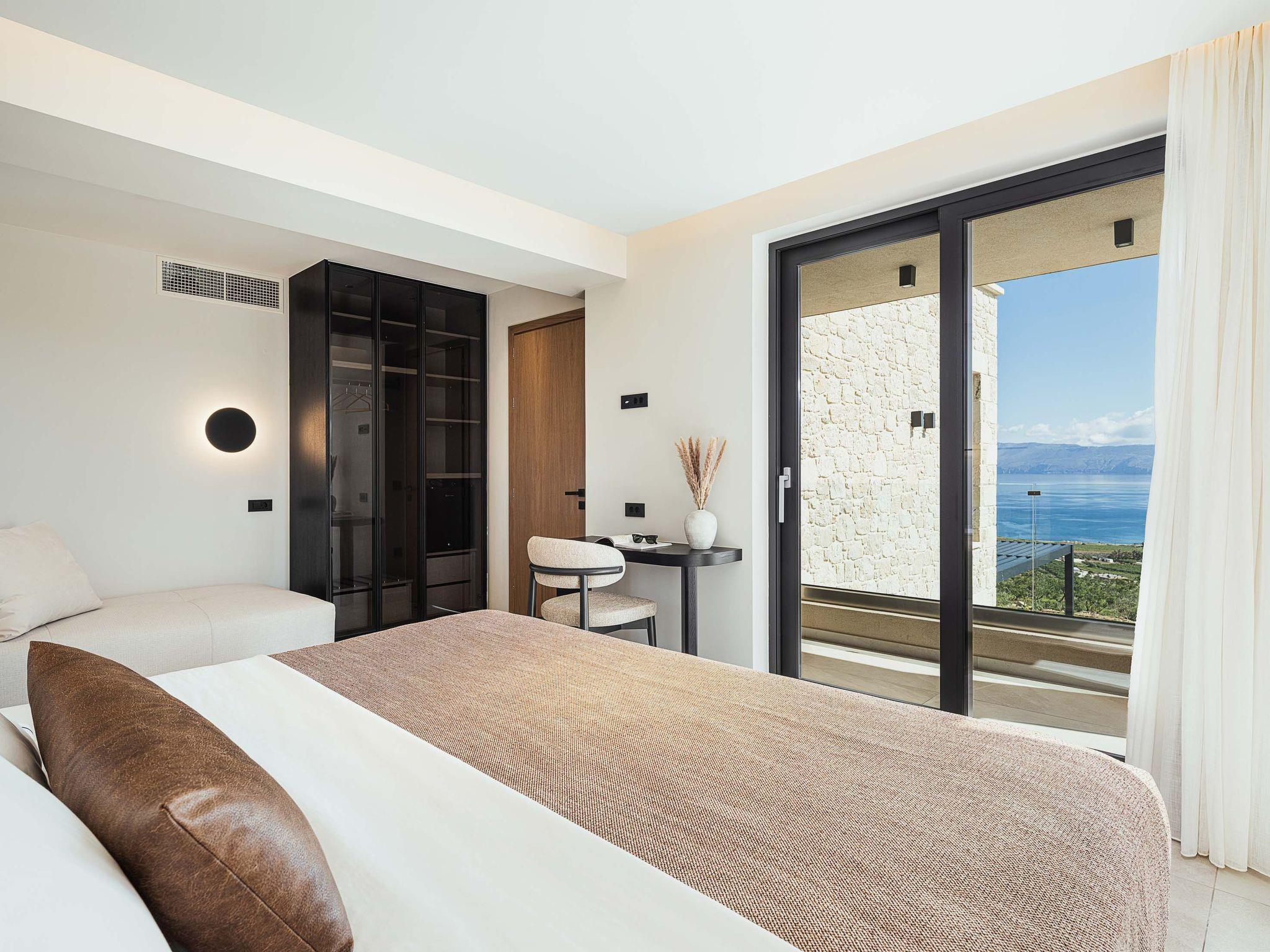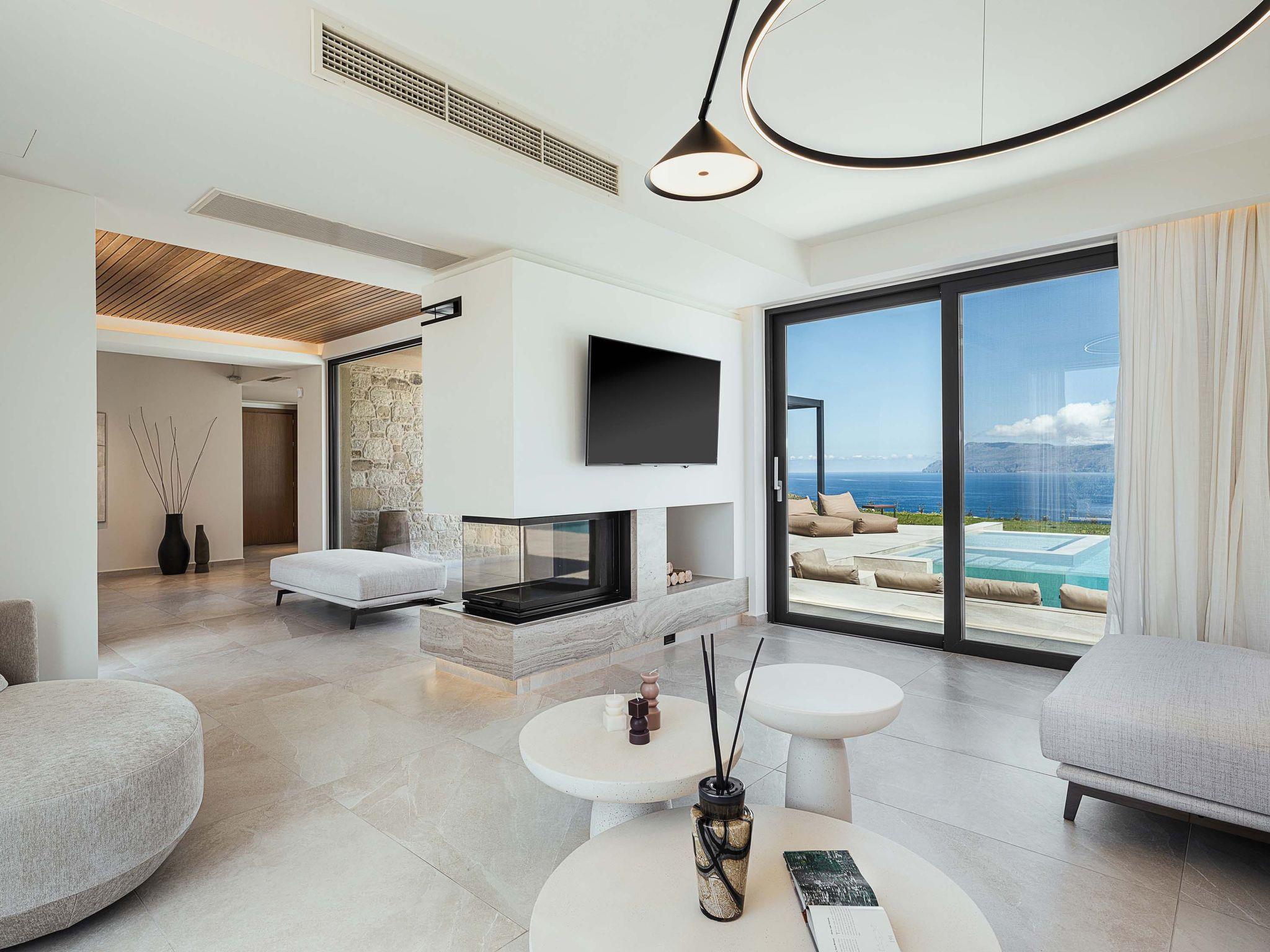 Wohnbereich mit Sofa, 55'' Satelliten-Smart-TV, Bluetooth-Lautsprecher, Brettspiele, Kamin, Zugang zur Poolterrasse, Meerblick