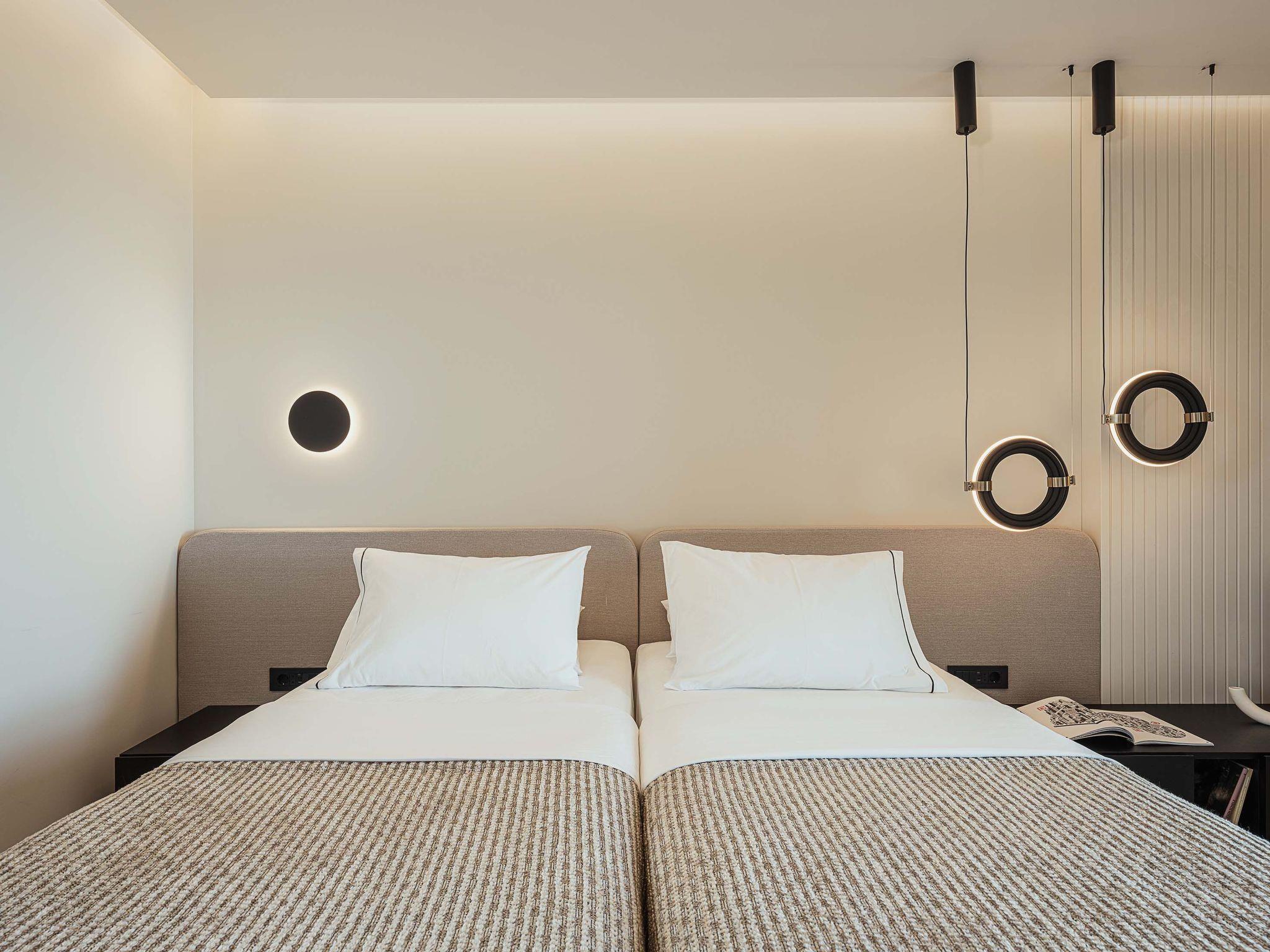 Schlafzimmer 1: Zwillingsbetten (0,90x2,00), die auf Wunsch in ein Kingsize-Bett umgewandelt werden können, Klimaanlage, Zugang zur Veranda, Meerblick, eigenes Bad (das Schlafzimmer und das Bad sind für Gäste mit Mobilitätsproblemen geeignet)