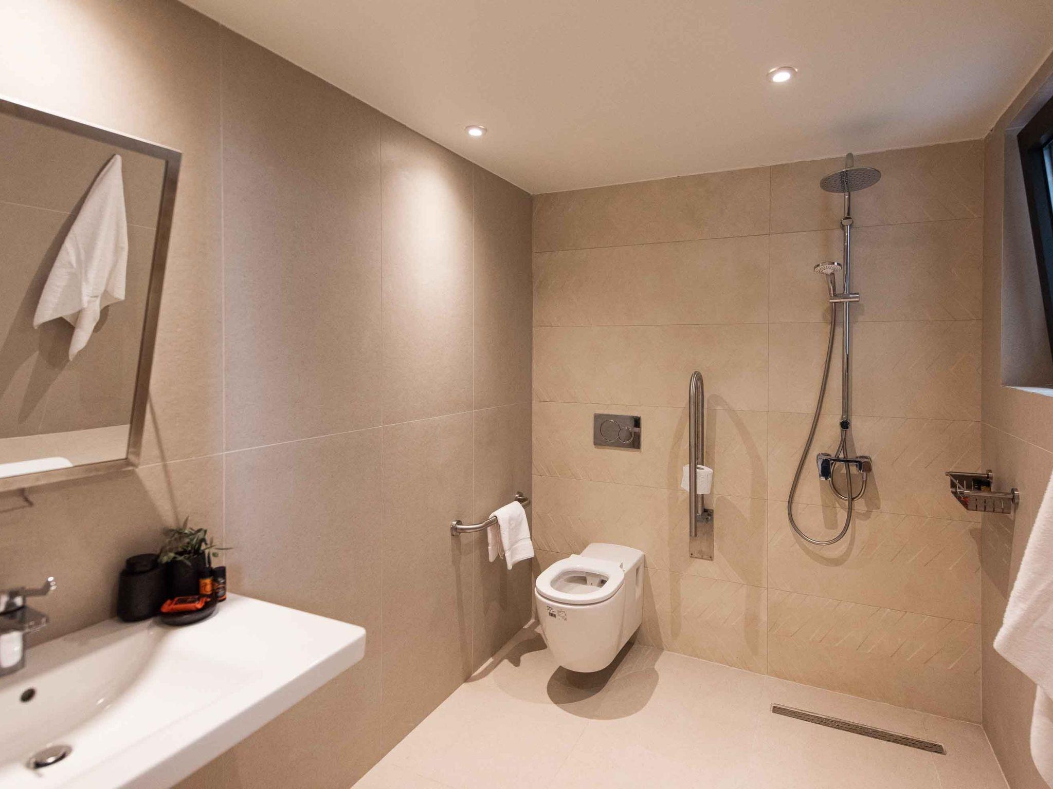Schlafzimmer 6 für Gäste mit eingeschränkter Mobilität: Kingsize-Bett (1,80×2,00), Klimaanlage, eigenes Bad mit Dusche, geeignet für Personen mit eingeschränkter Mobilität