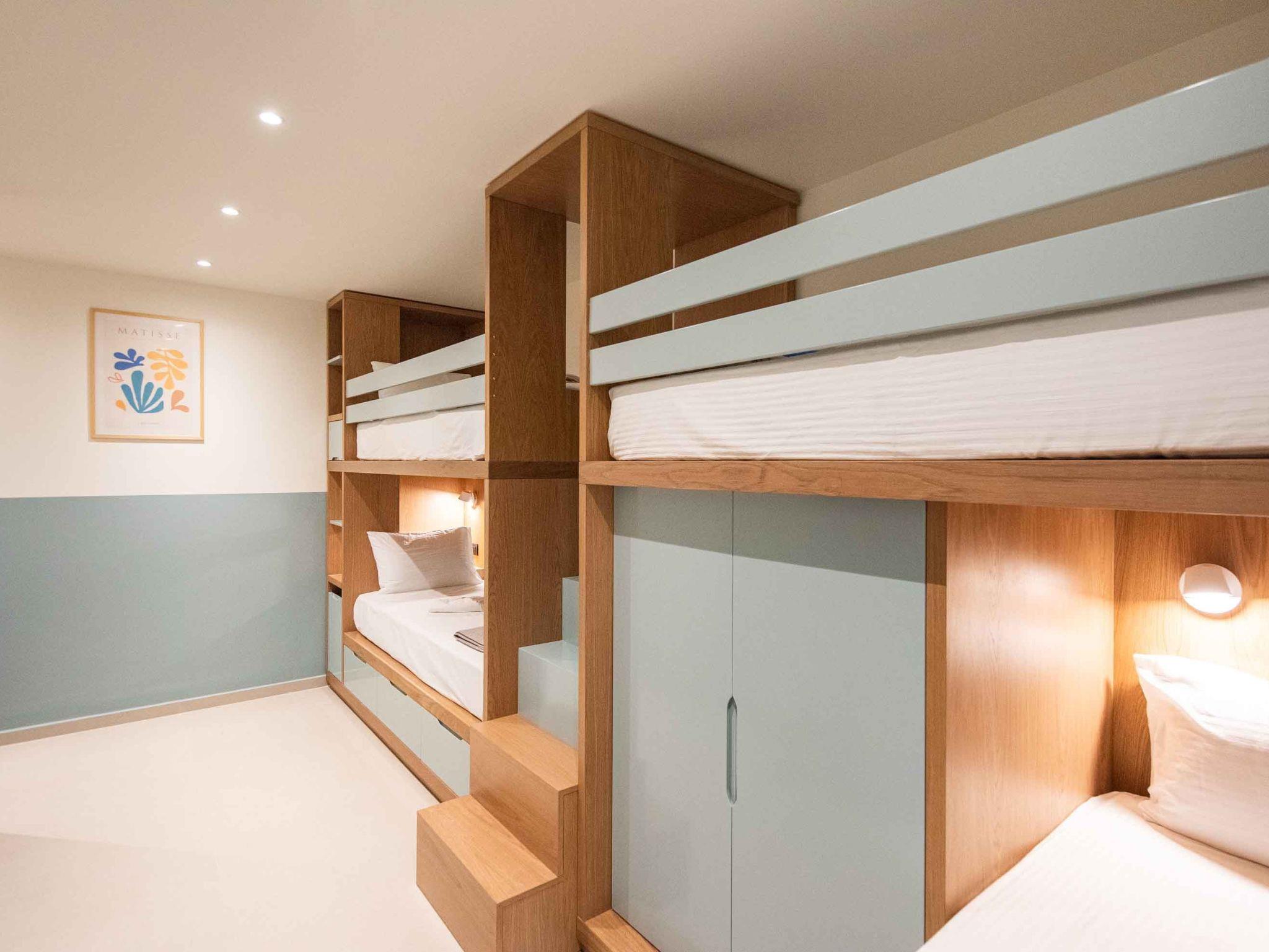 Schlafzimmer 7: Zwei Etagenbetten mit 4 Einzelbetten (0,90×2,00), die sowohl für Kinder als auch für Erwachsene geeignet sind, 40'' Smart Satellite TV