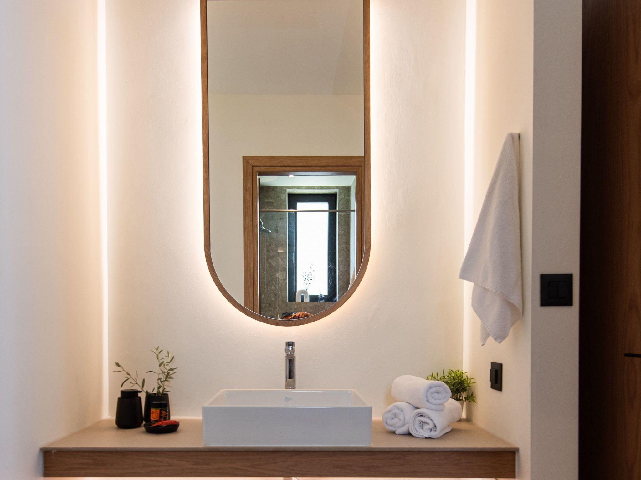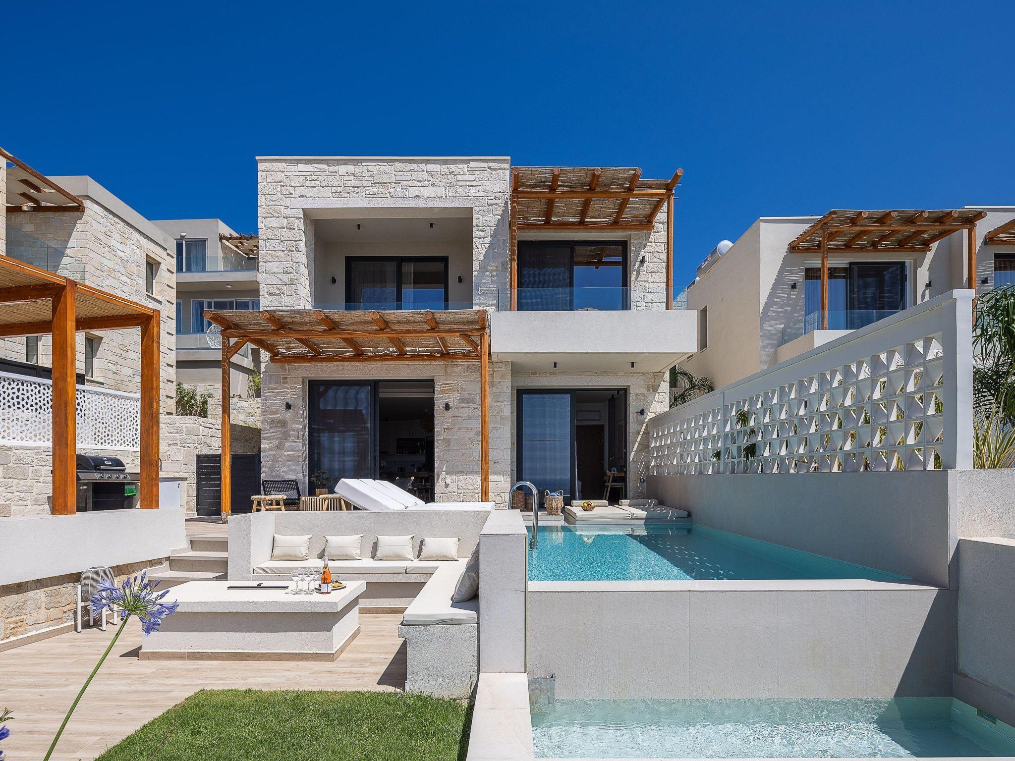 Sobald Sie einen Fuß vor die Villa setzen, werden Sie einen wunderschön gestalteten Swimmingpool sehen, und ganz in der Nähe befindet sich ein Lounge-Bereich mit einem Esstisch für 6 Personen unter einer geschützten Pergola und einem Außenkamin. Der Garten eignet sich für Drinks bei Sonnenuntergang, und der Swimmingpool und der Loungebereich mit Sofas sind der ideale Ort zum Entspannen. Werfen Sie den Grill an und versammeln Sie sich zu einer Mahlzeit im Freien unter der Pergola, während die Sterne herauskommen, eine nach der anderen Sonnenbank, um die kretische Sonne und die kleinen Dinge zu genießen, die Sie beeindrucken werden.