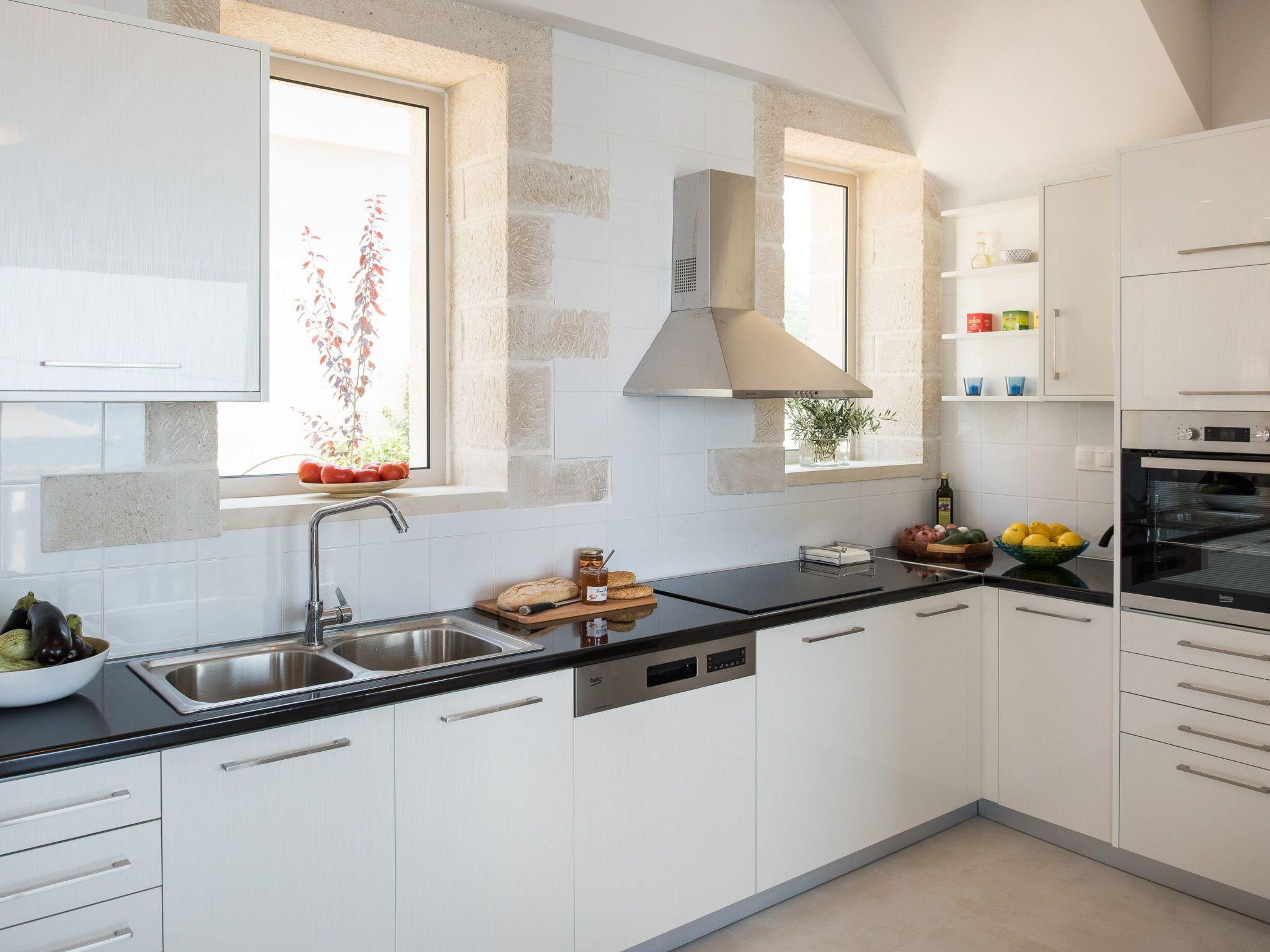 Offene, voll ausgestattete Küche mit einem Essbereich für 8 Personen und modernen Geräten