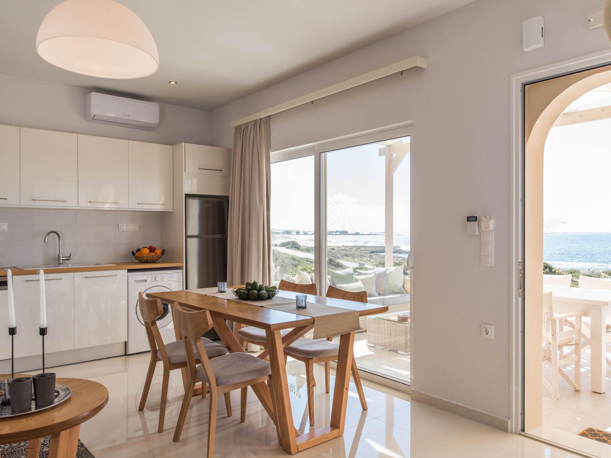 Die Villa Seafront, die auf einer Etage gebaut ist, ist nahe an der Perfektion und dem Komfort. Die Inneneinrichtung und die Möblierung sind mit modernem Stein kombiniert und schaffen eine elegante und gemütliche Atmosphäre. Beim Betreten der Villa empfängt Sie ein offener Raum mit einer voll ausgestatteten Küche, einem Wohnzimmer und einem Essbereich. Große Fenster lassen viel Sonnenlicht herein. Außerdem gibt es zwei Schlafzimmer und zwei eigene Bäder. Ein Schlafzimmer verfügt über ein Doppelbett, das andere über zwei Einzelbetten, die zu einem Doppelbett zusammengestellt werden können, und ein eigenes Bad. Individuelle Klimaanlagen sind vorhanden.