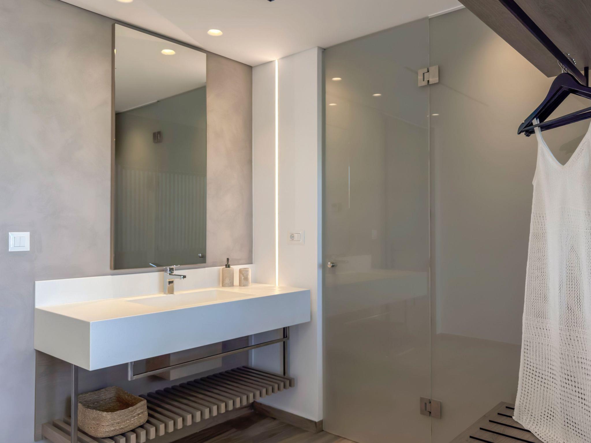 Das Innere von Utopia strahlt zeitgenössische Eleganz aus, mit einer großen offenen Küche, die mit praktischen Geräten und reichlich Arbeitsflächen ausgestattet ist und an einen Essbereich und ein Wohnzimmer grenzt, das sich um einen umweltfreundlichen Kamin gruppiert. Jeder der bis zu 10 Gäste der Villa wird mit erhabenem Komfort verwöhnt, denn jedes Schlafzimmer verfügt über ein eigenes Bad mit Dusche. Die Zimmer sind so gestaltet, dass sie den atemberaubenden Blick auf das Meer und die Berge maximieren. Jedes Zimmer verfügt über eine Terrasse mit Blick auf die Ägäis, die die Schönheit des Innenraums mit dem bezaubernden Blick nach draußen verbindet.