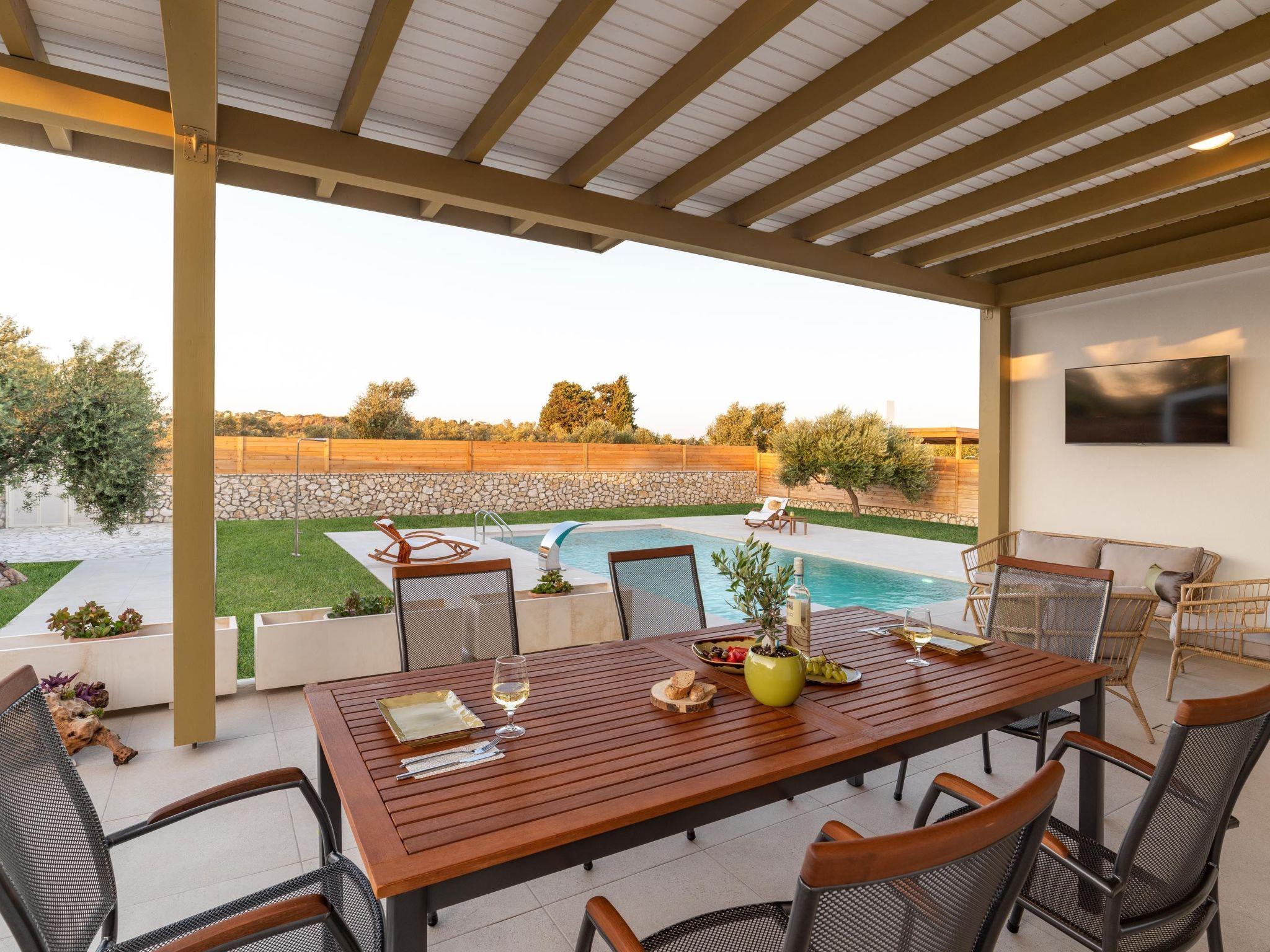 Die Villa Elia verfügt über zwei vollklimatisierte Schlafzimmer mit eigenem Bad mit Dusche und ein bequemes Doppelschlafsofa im Wohnzimmer, wobei eines der Schlafzimmer einen separaten Eingang hat und nicht im Hauptgebäude liegt. Es gibt auch ein Badezimmer mit Dusche neben dem Wohnzimmer. Die Küche ist voll ausgestattet und eignet sich für die Zubereitung von Mahlzeiten, die von der Sitzecke begleitet werden. Das Innendesign ist absolut unglaublich mit einer geschmackvollen Dekoration. Die Gäste finden Flachbildfernseher und kostenlosen Wi-Fi-Zugang im gesamten Haus. Im Außenbereich gibt es einen herrlichen privaten Swimmingpool und Sitzgelegenheiten zum Entspannen unter der Sonne der Ägäis. Der Grillplatz und die Grillgeräte bieten Ihnen die Möglichkeit, im Freien am Pool zu speisen.
