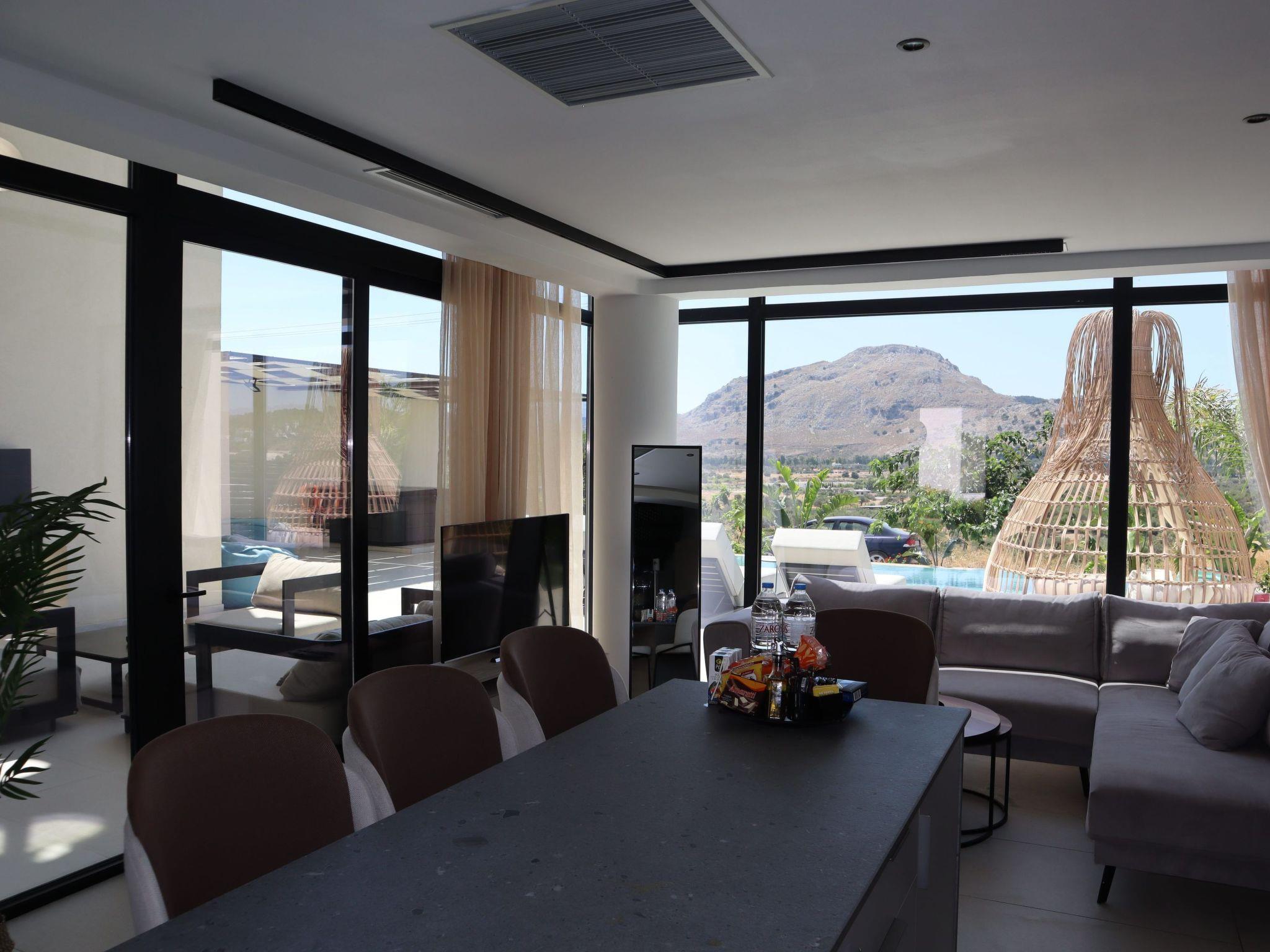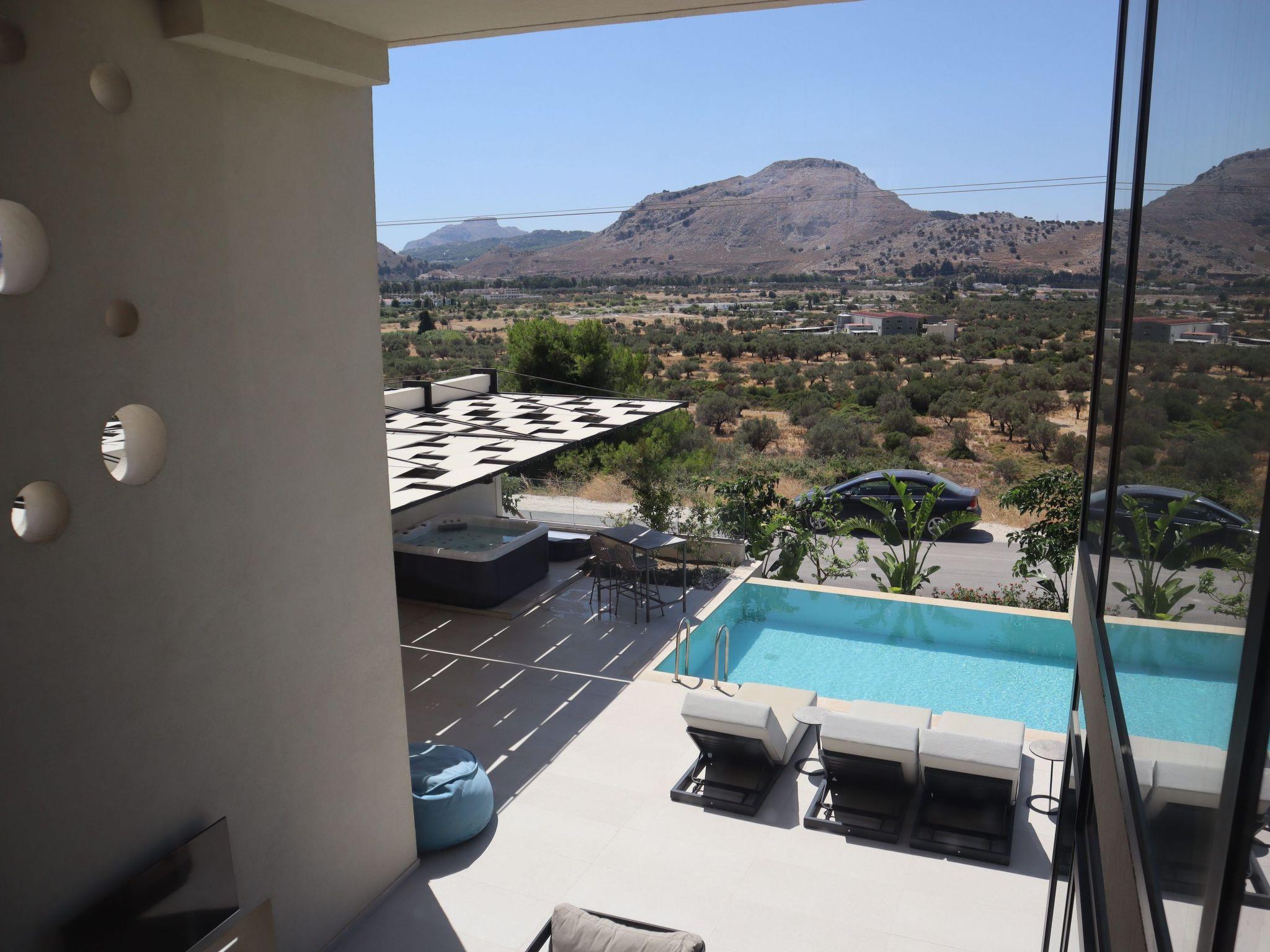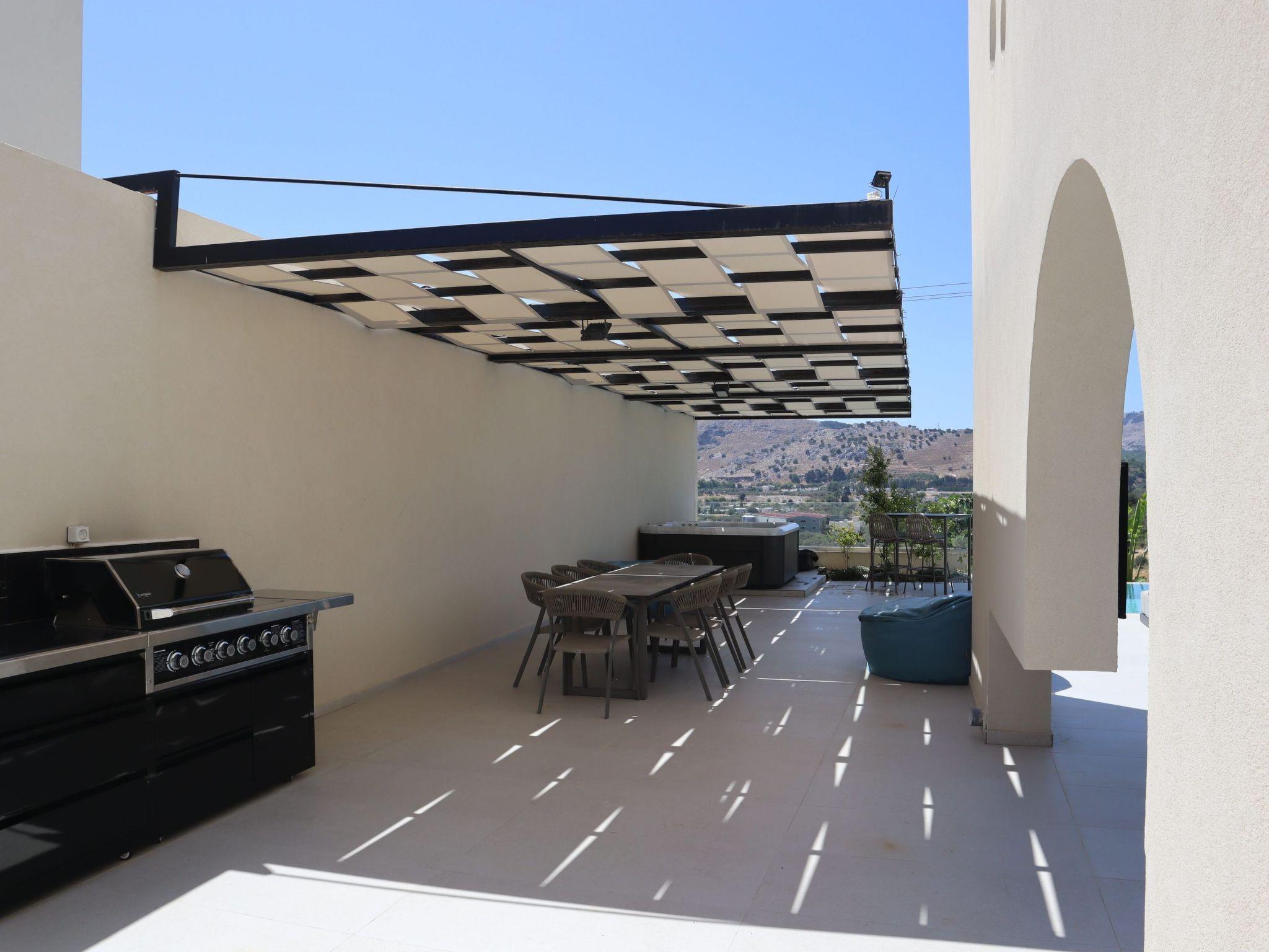 Willkommen im magischen Luxusleben von Trapezia Villas. Trapezia Luxury Living besticht durch ein atemberaubendes Design, das moderne Ästhetik mit zeitloser Eleganz verbindet. Jedes Detail wurde sorgfältig ausgearbeitet, um eine anspruchsvolle und luxuriöse Atmosphäre zu schaffen. Sie bieten weitläufige Wohnbereiche, darunter große Wohnzimmer, Essbereiche und drei voll ausgestattete Schlafzimmer mit eigenem Bad. Die hohen Decken und der offene Grundriss verstärken das Gefühl von Erhabenheit und bieten viel Platz für Entspannung und Unterhaltung. Alle Villen von Trapezia sind mit erstklassigen Annehmlichkeiten ausgestattet, um ein unvergleichliches Luxus-Erlebnis zu gewährleisten. Von einer voll ausgestatteten Gourmetküche im Freien bis hin zu einem privaten Swimmingpool und einem Spa ist für jeden Aspekt des Komforts und des Genusses gesorgt. Trapezia Luxury Living ist der Inbegriff von Opulenz und Raffinesse und bietet ein wahrhaft außergewöhnliches Wohnerlebnis für diejenigen, die eine Unterkunft vom Feinsten suchen. Die Villen vom Typ A sind zweistöckige, freistehende Luxusvillen, die bis zu 6 Gäste beherbergen können und über 3 vollklimatisierte Schlafzimmer mit einzigartiger Dekoration verfügen. Alle Schlafzimmer verfügen über ein eigenes Bad mit Dusche. Es gibt eine voll ausgestattete Küche in warmen Farben, geeignet für jede Mahlzeit Vorbereitung begleitet von der Sitzecke und das Wohnzimmer. Es gibt einen Smart-TV und kostenlosen WIFI-Zugang im gesamten Haus. Im Außenbereich befinden sich ein privater Swimmingpool und ein Whirlpool mit Sonnenliegen und einer Sitzecke, wo Sie sich unter den Strahlen der ägäischen Sonne entspannen können. Die fantastische Außenküche mit dem Essbereich verspricht unvergessliche Abendessen unter dem griechischen Himmel. Sie können Ihre Zeit an Ihrem privaten Swimmingpool verbringen oder eine frisch zubereitete Mahlzeit auf der Grillanlage genießen. Dieses erstaunliche Anwesen und die schöne Lage sind die perfekte Kombination für einen unvergesslichen Aufenthalt und unvergessliche Ferien auf Rhodos!