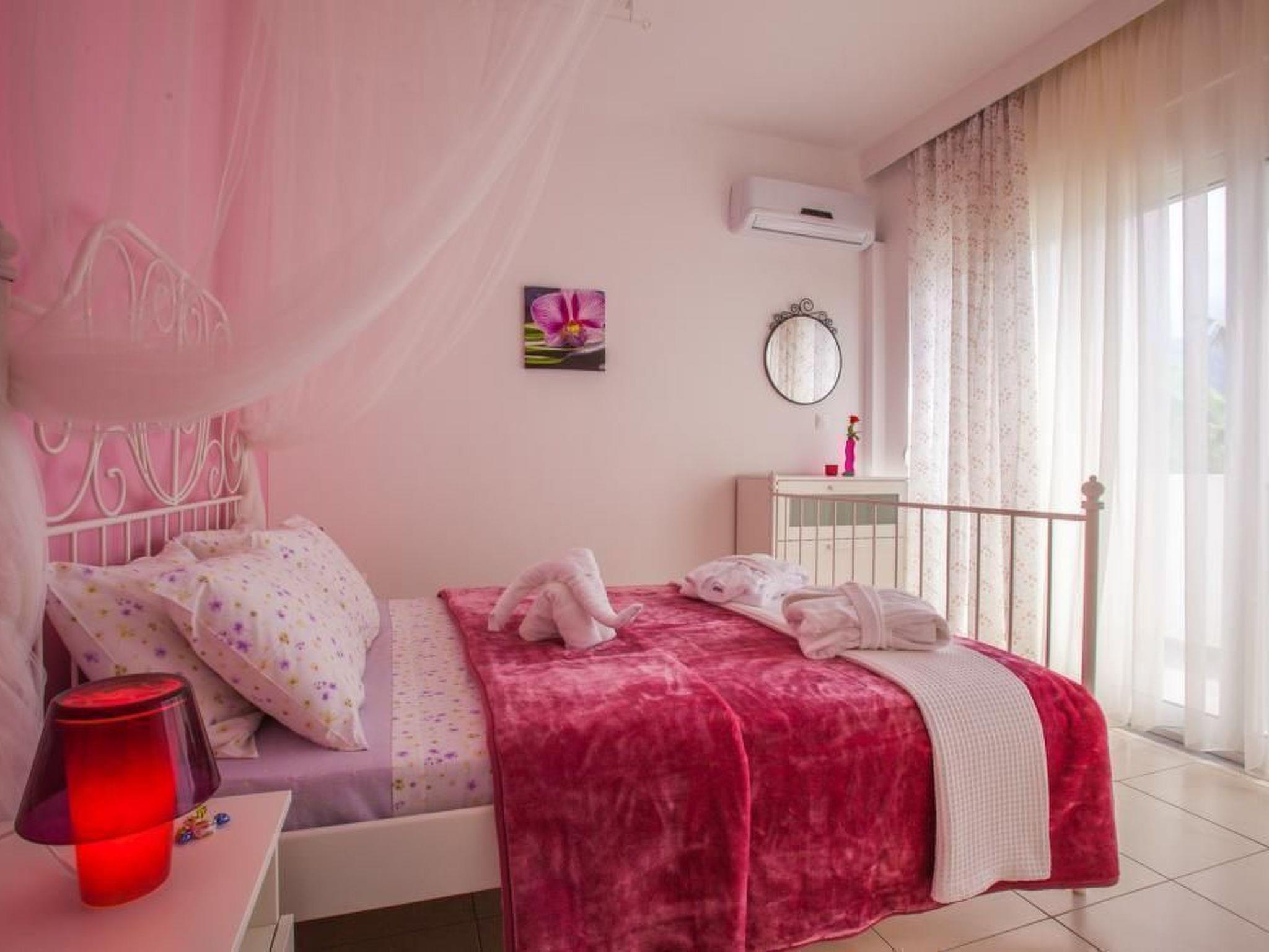 Die sehr luxuriös eingerichtete Villa erstreckt sich über drei Etagen, bietet rund 200m² Wohnfläche und kann bis zu zehn Personen beherbergen. Das Erdgeschoss verfügt über einen sehr geräumigen Bereich von 55 m², der auch einige Fitnessgeräte, ein Schlafzimmer mit Doppelbett und ein Schlafsofa für zwei Personen sowie eine Dampfkabine, Hydromassage und ein kleines Badezimmer mit Waschbecken und Toilette bietet. Es gibt auch eine Waschmaschine. Im ersten Stock befinden sich drei Schlafzimmer mit je 12 m². Zwei Schlafzimmer haben ein Doppelbett und das zweite hat zwei Einzelbetten, beide mit direktem Meerblick. Das dritte Schlafzimmer mit einem Doppelbett hat Garten- und Bergblick. Auf dieser Etage befinden sich auch zwei Bäder. Eines davon hat eine Dusche, das andere eine Badewanne.