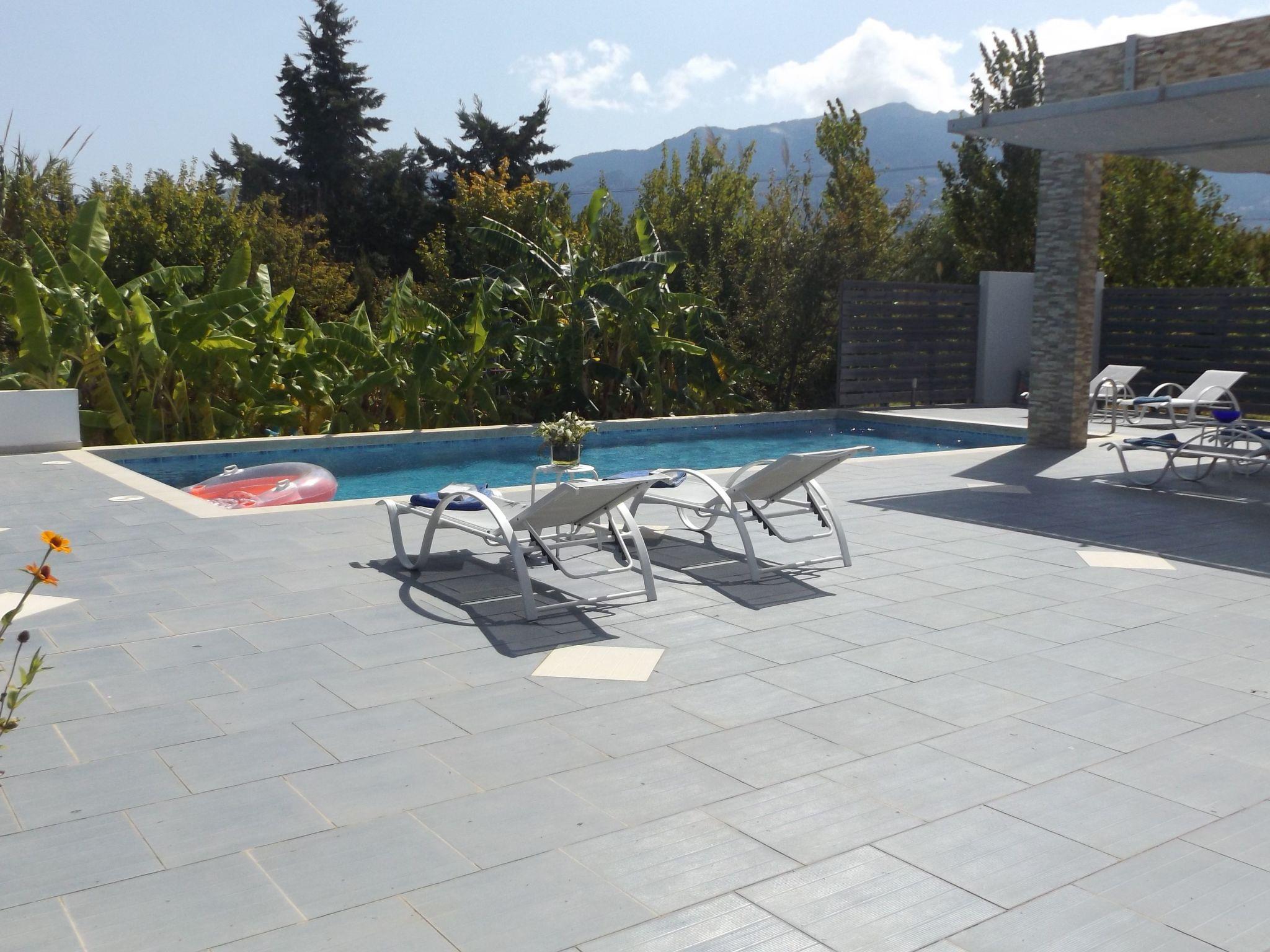 Die große Terrasse ist sowohl vom Wohnzimmer als auch von der Küche aus zugänglich. Sie bietet einen atemberaubenden Blick und lädt zu gemütlichen Mahlzeiten ein. Ausreichend Terrassenmöbel sind vorhanden. Der Außenpool (9,5 x 5 m) befindet sich direkt am Haus und hat einen angrenzenden Garten von 1500 m². Im Garten wurden Bananenstauden und Aprikosenbäume gepflanzt.