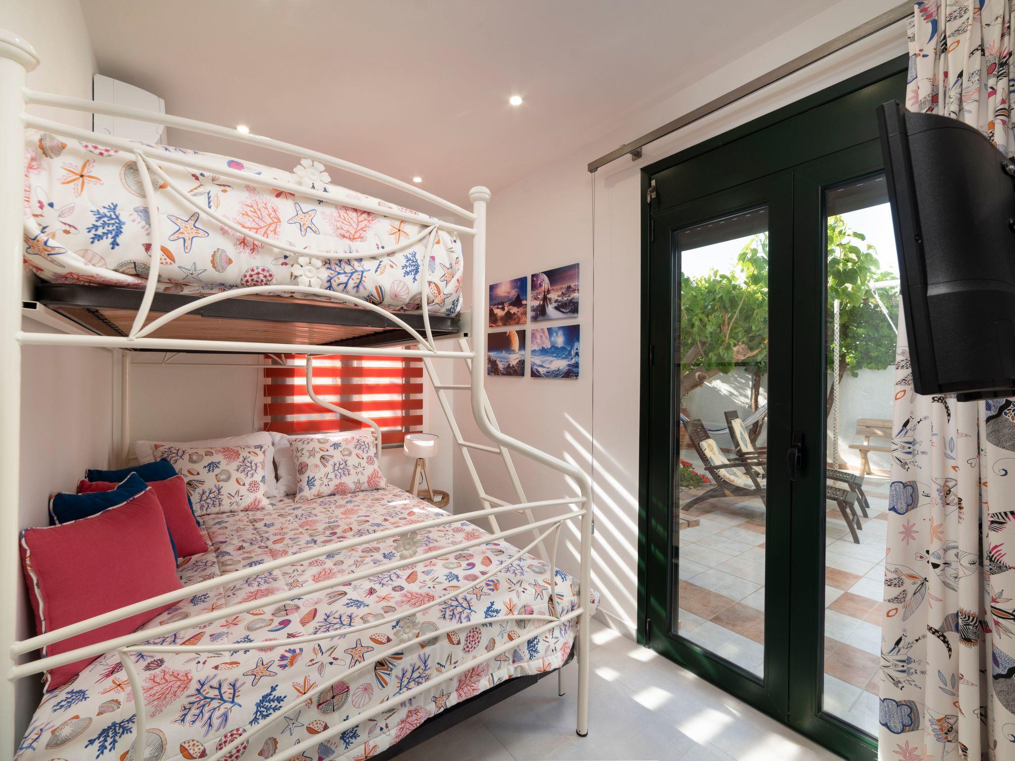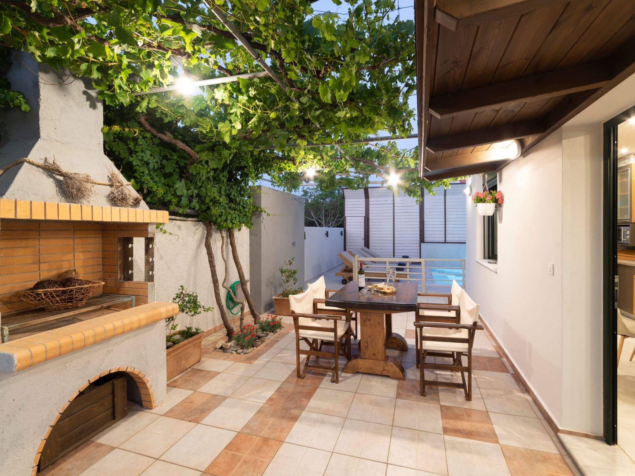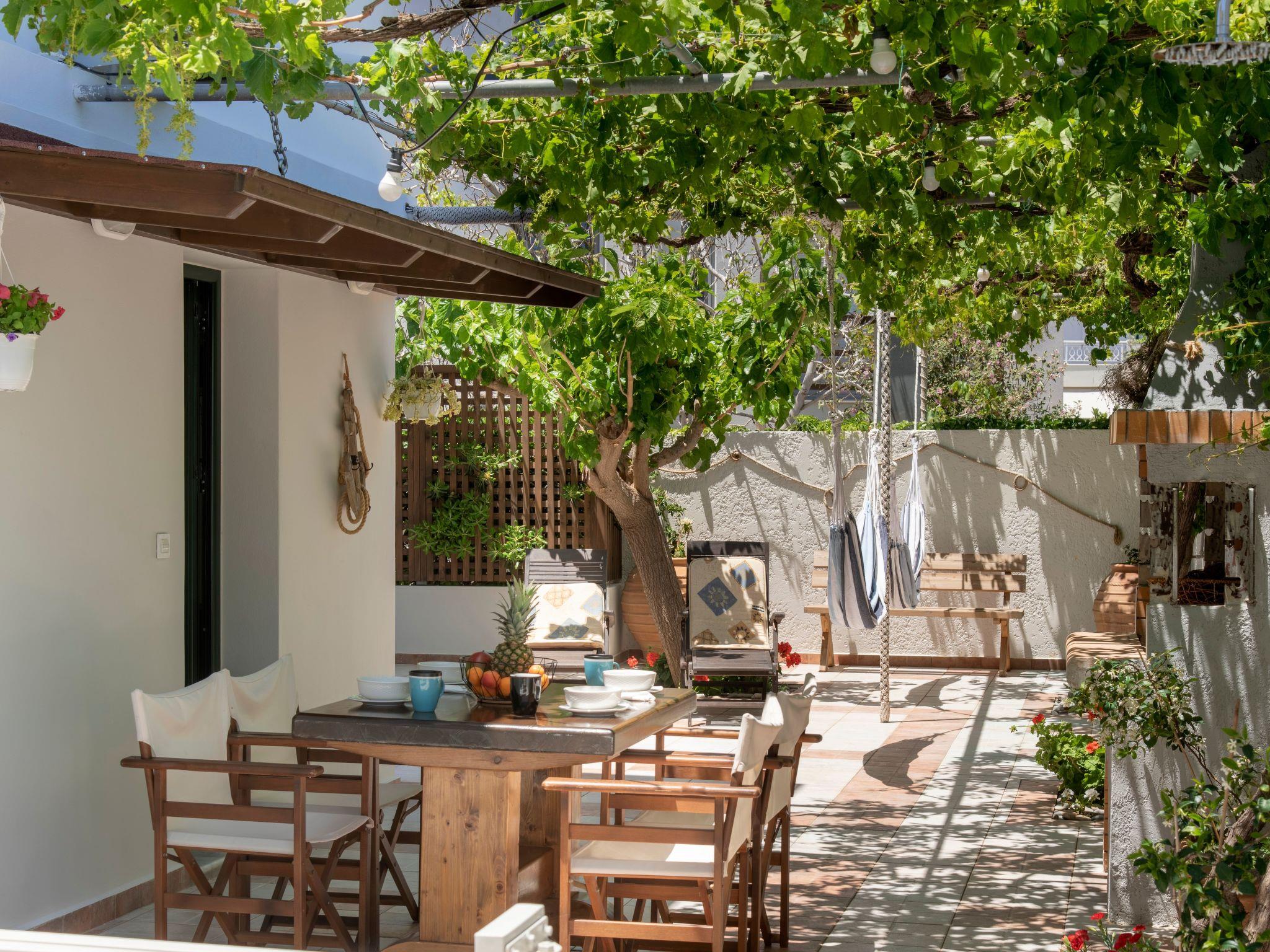 Krevatinas zwei Schlafzimmer mit eigenem Bad sind ideal für eine alleinstehende Familie mit bis zu 5 Kindern oder zwei kleinere Familien, die Zeit miteinander verbringen. Einzigartig ist der große private Innenhof mit Grill und Swimmingpool, Schaukeln und Hängematten. Essen im Freien und drinnen. Parken ist innerhalb der bewachten Gärten möglich. Jede Paradisos-Villa ist von den Reisen des Eigentümers inspiriert. Vineyard hat einen orientalischen Touch, mit Dekorationen aus dem Fernen Osten.