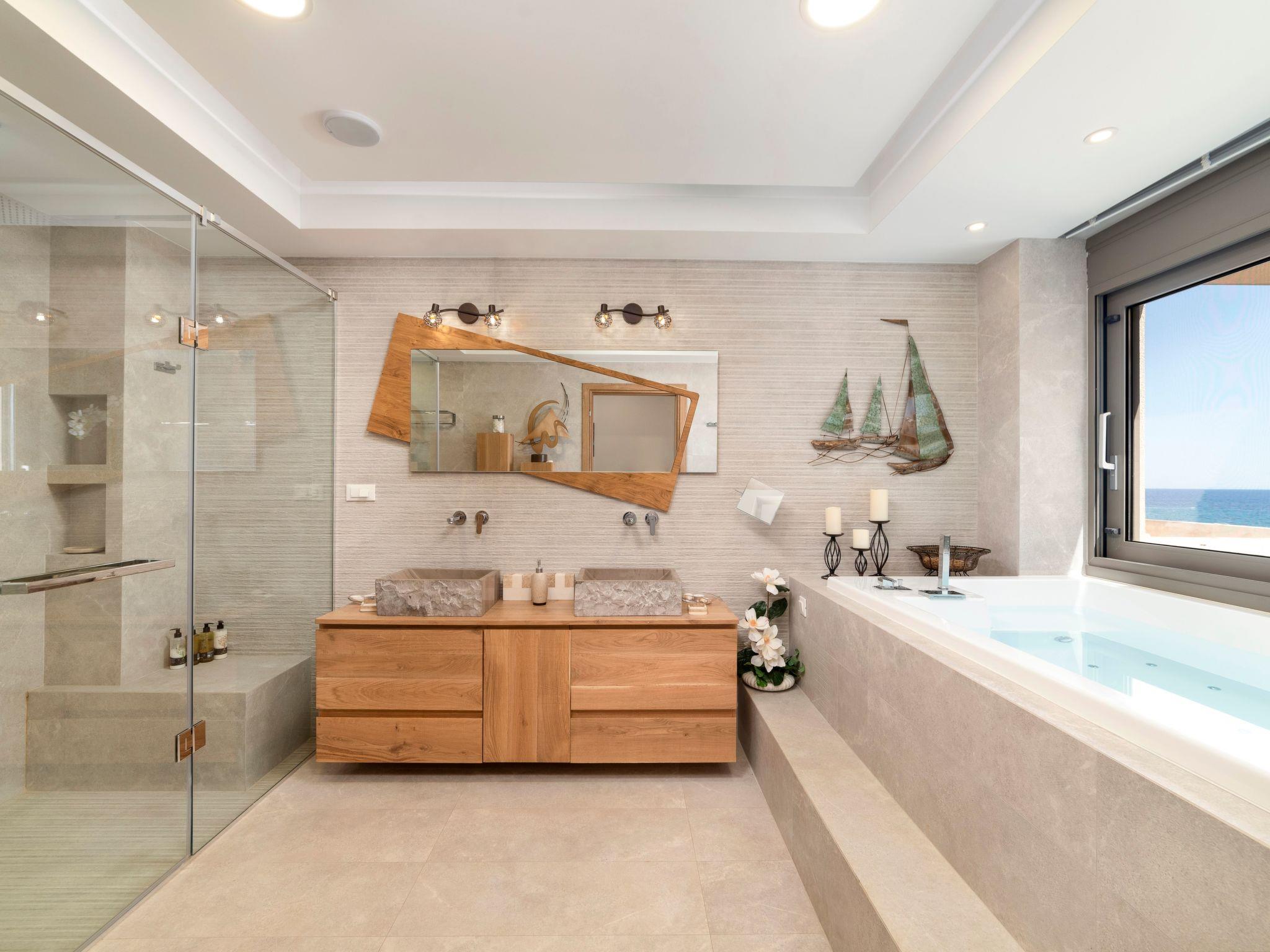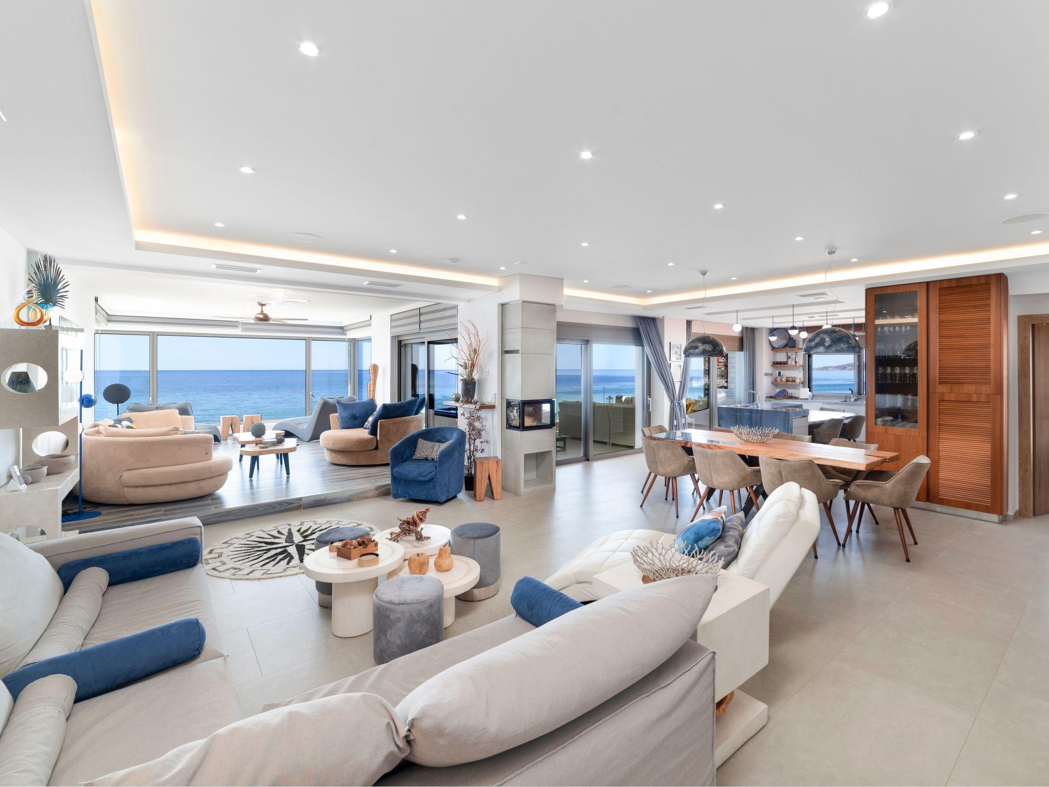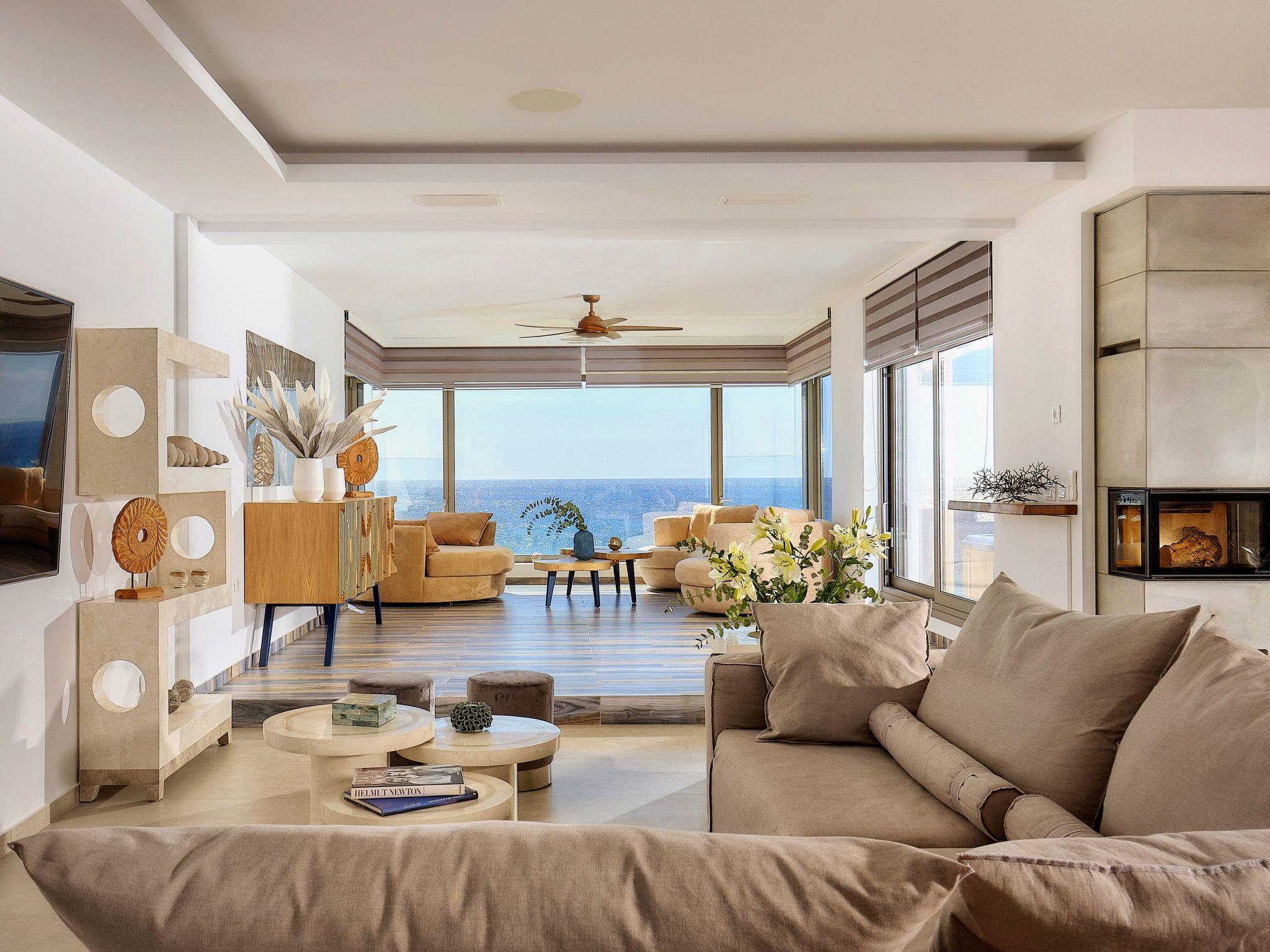 Das Penthouse in der obersten Etage der neu erbauten (2019) Designer-Villa Moonlight am Wasser – Eleganz und Abgeschiedenheit. In einem ruhigen, landwirtschaftlich geprägten Dorf im Südosten Kretas bietet dieses Penthouse mit 5 Schlafzimmern und 5 Bädern abgeschiedene Ruhe, als ob der Rest der Welt nicht mehr existierte. Atemberaubender Panoramablick auf das Meer, den Mond auf dem Wasser und den Sonnenuntergang. Genießen Sie ein privates Hot-Spa auf dem Balkon, einen Grill, Spiele, Fahrräder und einen Radweg. Weniger als 5 Gehminuten vom Kiesstrand mit Bars und Restaurants entfernt. Für den Zugriff auf die Umfrage wenden Sie sich bitte an den Eigentümer. Diese exklusive Designervilla überblickt das kristallklare, blaue Wasser des Mittelmeers – ein wunderschöner Felshorizont, ideal zum Schwimmen, Sonnenbaden, Surfen und für andere Wassersportarten. Es liegt in Koutsourás, einem ruhigen, landwirtschaftlich geprägten Dorf im Südosten Kretas. Es liegt weniger als 2 km westlich der Touristenstadt Makry Gialos, 23 km östlich von Ierapetra und 33 km von Sitia entfernt. Die luxuriöse Unterkunft bietet einen spektakulären Blick auf die Landschaft Südkretas, den Mond und den Sonnenuntergang. Die Villa liegt nur wenige Gehminuten von einem örtlichen Kiesstrand, Bäckereien und Cafés, Konditoreien, Supermärkten, Bars, Restaurants und einer Apotheke entfernt und verbindet romantische Abgeschiedenheit mit der Nähe zu modernem Komfort.
