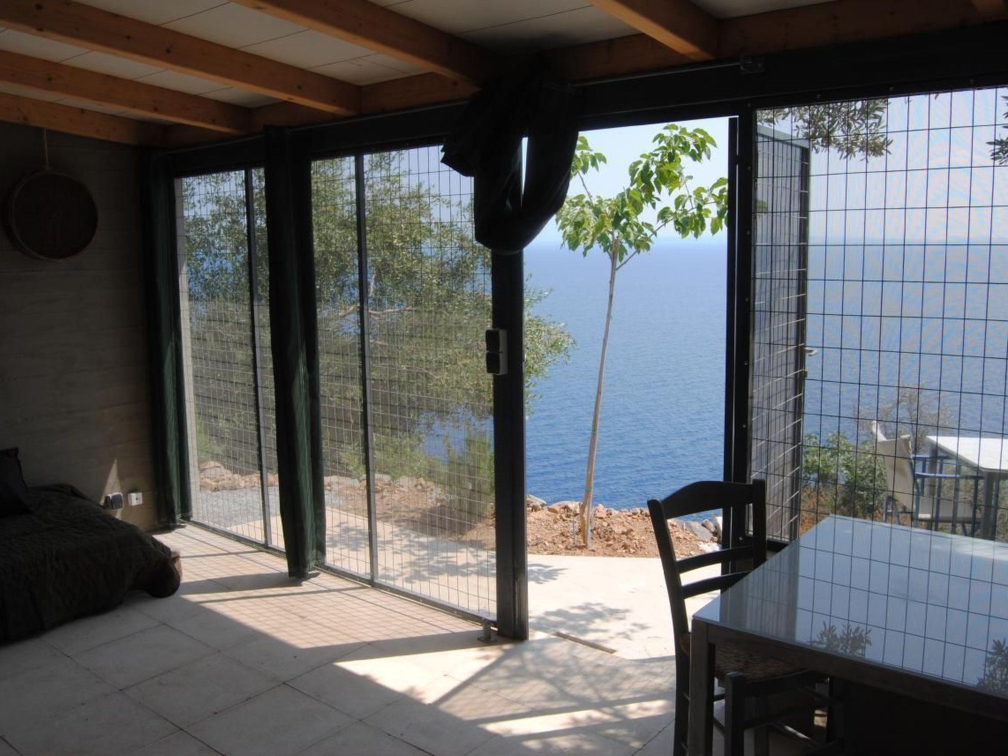 Der “Kleine Bungalow” besteht aus einem Raum. Er ist einfach eingerichtet, hat aber allen nötigen Komfort wie Warmwasser, Dusche, WC, Kochnische mit Kühlschrank, Herd und Elektrogrill. Er ist für bis zu 3 Personen ausgelegt. Der Bungalow ist so beschattet, dass man ohne Klimaanlage immer eine angenehme Raumtemperatur hat. Bei Bedarf kann aber ein Ventilator zusätzliche Kühlung verschaffen. Die Ostseite ist zum Meer hin geöffnet und ein Teil dieser Seite ist mit Fenstern und der andere mit Fliegengittern geschlossen. In diesem Haus, das unter Olivenbäumen versteckt ist und in völliger Harmonie mit seiner Umgebung erbaut wurde, wohnt man im völligen Einklang mit der Natur ohne auf einen gewissen Komfort verzichten zu müssen.