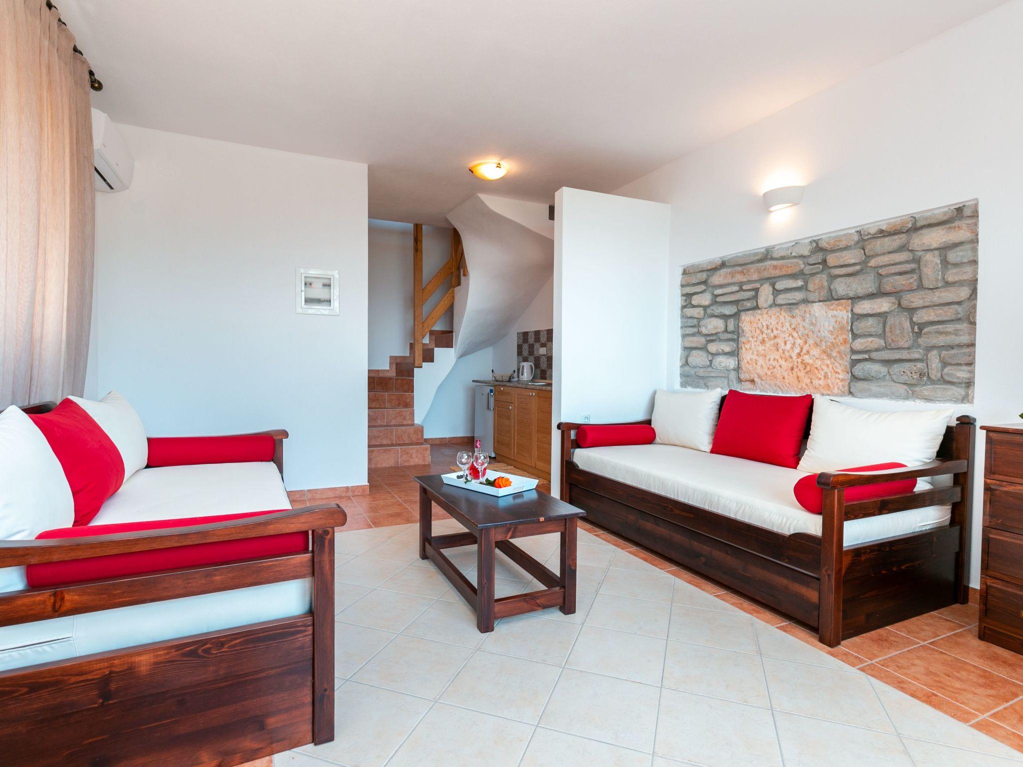 Die Maisonette hat ein traditionelles Design und ist ideal für Familien oder Gruppen, da sie Platz für bis zu sechs Personen bietet, zwei Personen können im Doppelbett des Hauptschlafzimmers untergebracht werden, während vier Personen die beiden Doppelschlafsofas im Wohnzimmer nutzen können . Das Layout ist in zwei Etagen aufgeteilt, im Erdgeschoss finden unsere Gäste das Wohnzimmer, eine Küchenzeile und das private Badezimmer, im Obergeschoss befindet sich das Hauptschlafzimmer.Die Küche ist mit einer Küchenzeile und diversen Küchenutensilien ausgestattet. Schließlich hat die Maisonette direkten Zugang zu einem möblierten Balkon mit herrlicher Aussicht, auf dem Sie mit Familie oder Freunden entspannen können.