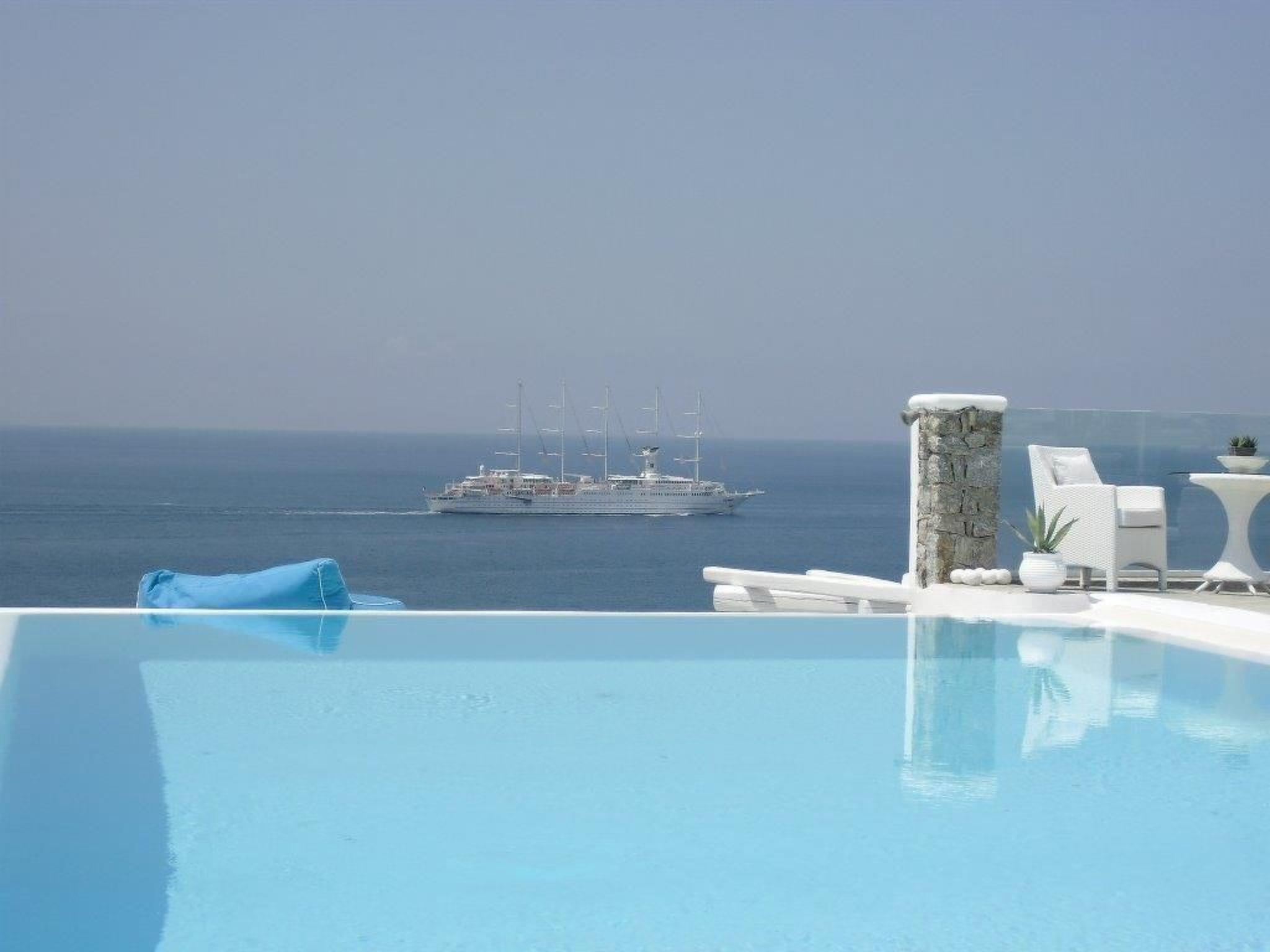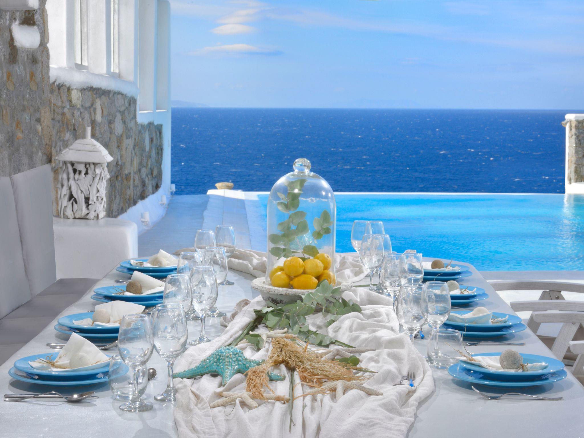 Der Infinity-Pool mit direktem Blick auf das Ägäische Meer und die Inseln Delos und Tinos ist das Highlight der Villa. Das Anwesen hat das Privileg, den besten Blick auf den Sonnenuntergang von Mykonos zu bieten. Rund um den Poolbereich befinden sich 3 Loungebereiche, die ideal für entspannte Momente oder Cocktailpartys sind, sowie ein großer Esstisch für bis zu 20 Personen.