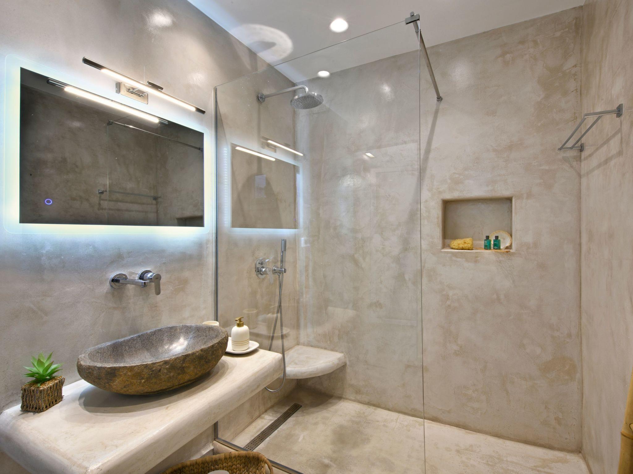 Der Außenbereich bietet einen 180°-Rundumblick und mehrere möblierte Terrassen, einen Infinity-Pool mit bequemen Sonnenliegen und einem überdachten Essplatz, einem großen steinernen Esstisch für 20 Personen und zwei großen Sitzbereichen. Vor dem Haus gibt es einen kleinen Garten mit einem Grill und einem Sofa, von dem aus man einen herrlichen Blick auf das Meer hat. Hier befindet sich auch der Parkplatz.