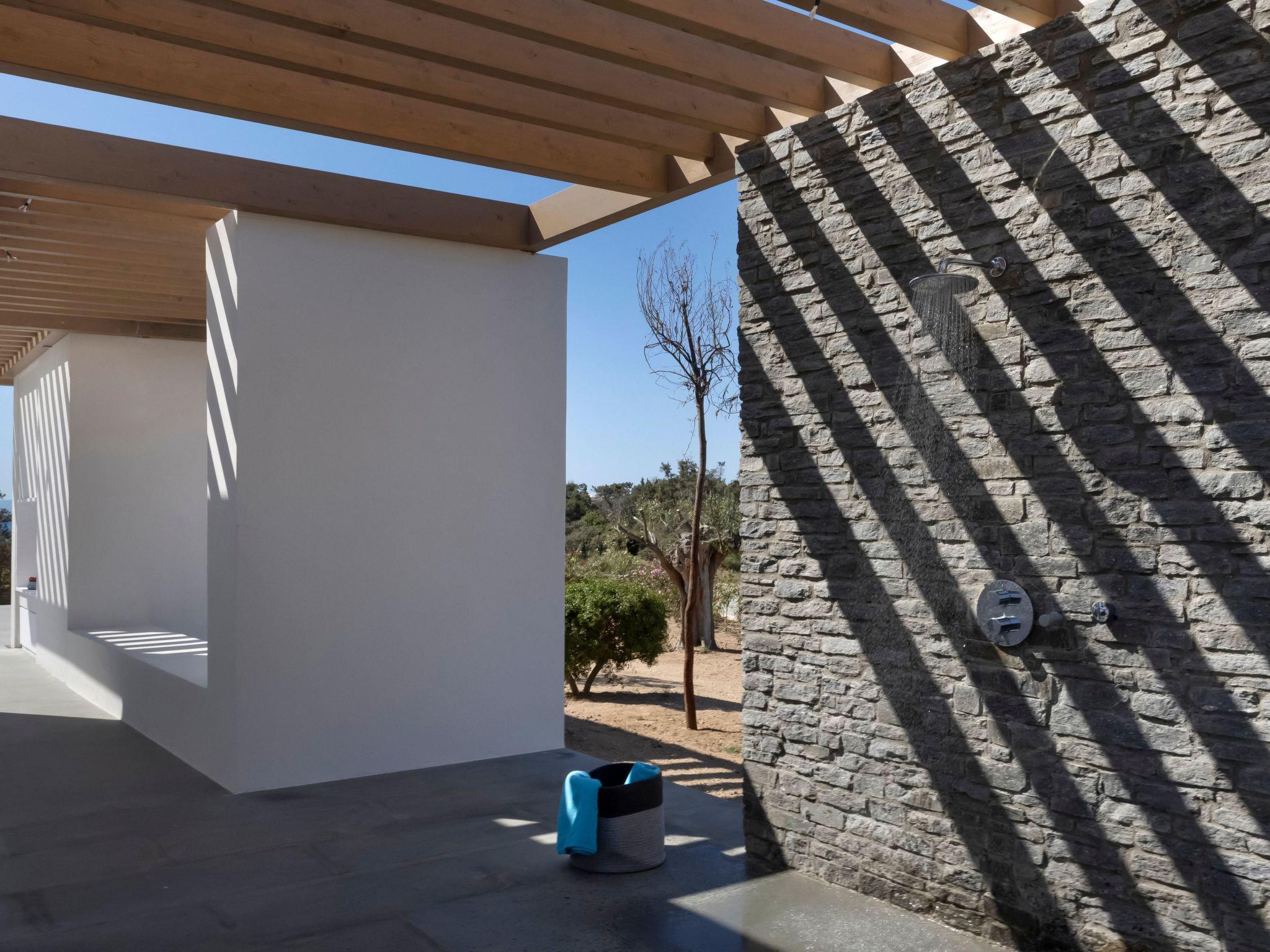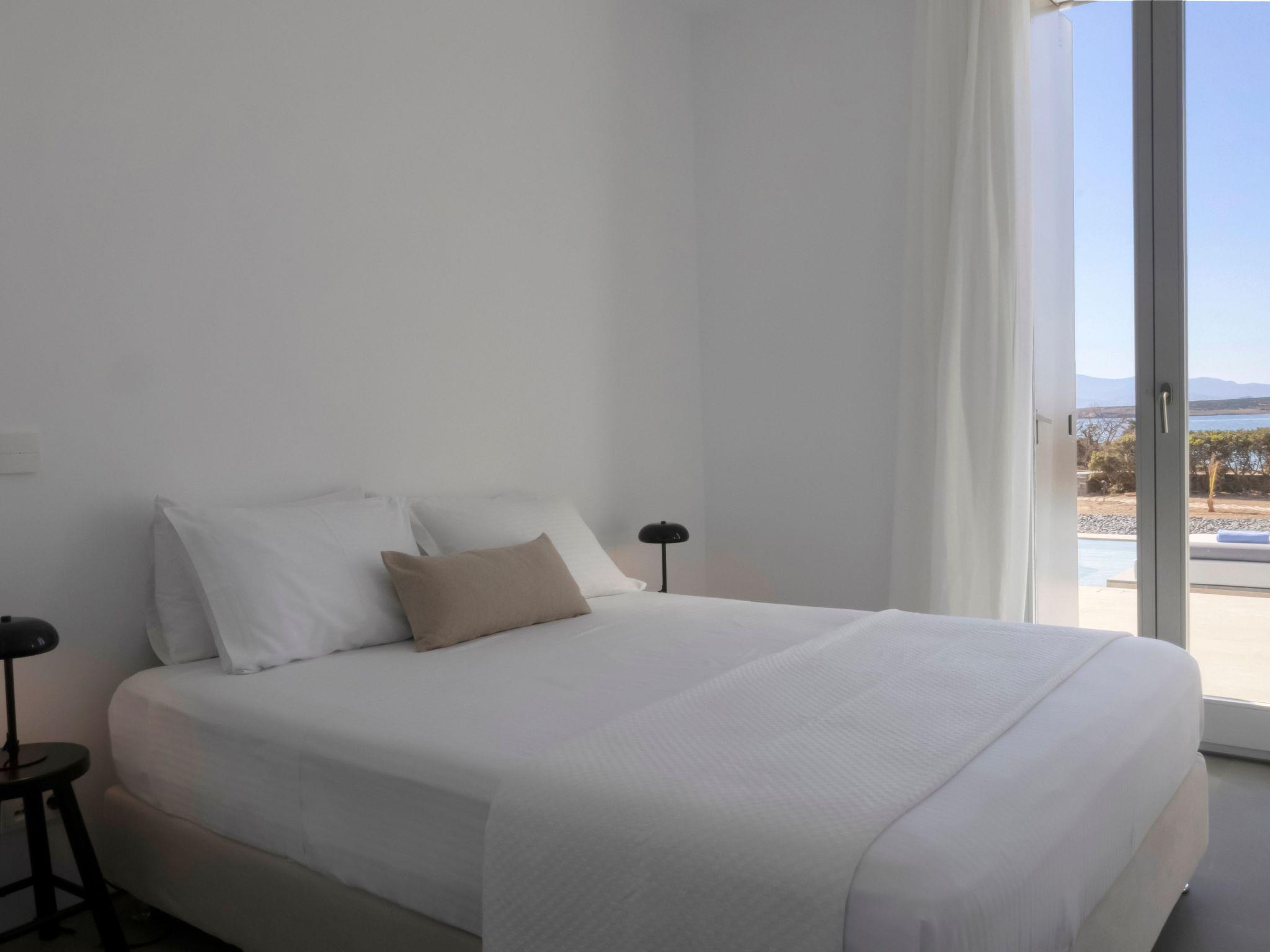 Die Villa Elesia II verfügt über ein elegantes Interieur mit vier Doppelzimmern, davon zwei mit eigenem Bad und zwei, die sich ein geräumiges Bad teilen, so dass bis zu 9 Personen bequem Platz finden. Die Villa ist durchdacht in zwei verschiedene Bereiche unterteilt: Das Erdgeschoss ist offen gestaltet und fügt sich dank der raumhohen Fenster, die auf eine private Veranda führen, nahtlos in die atemberaubende Landschaft von Paros ein. Im ersten Stock bietet ein charmantes Studio-Apartment eine gemütliche und einladende Atmosphäre, perfekt für Entspannung und Privatsphäre.