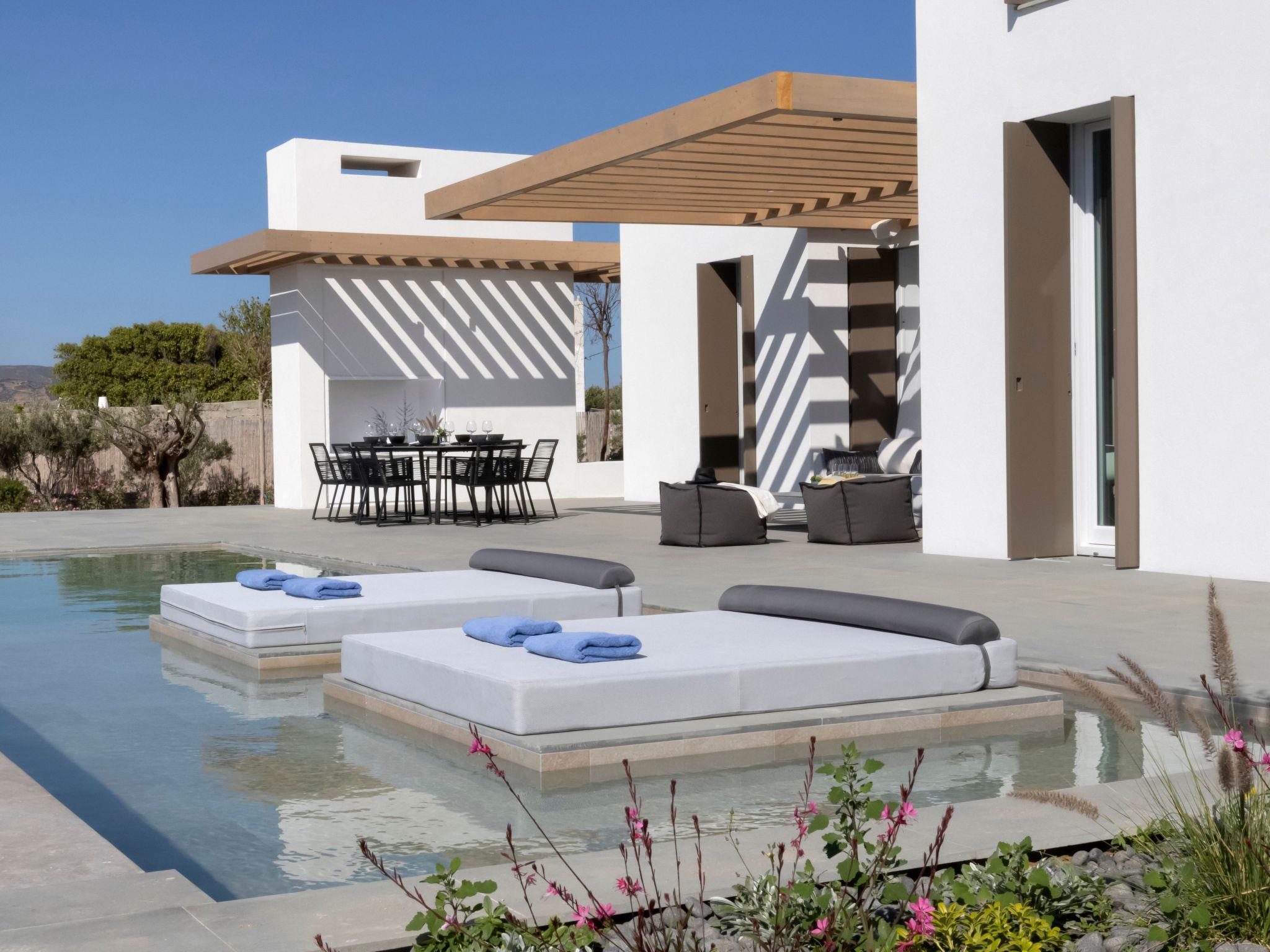 Der Außenbereich der Villa ist ebenso beeindruckend, mit einem atemberaubenden Infinity-Pool als Herzstück. Eine private Treppe führt die Gäste zu einer exklusiven Outdoor-Lounge im Obergeschoss, die mit Sonnenliegen ausgestattet ist, die höchste Privatsphäre und Entspannung bieten. Hier können die Gäste den Panoramablick auf den Strand von Santa Maria und seine Umgebung genießen, sich sonnen oder die ruhige Atmosphäre unter dem Sternenhimmel genießen.