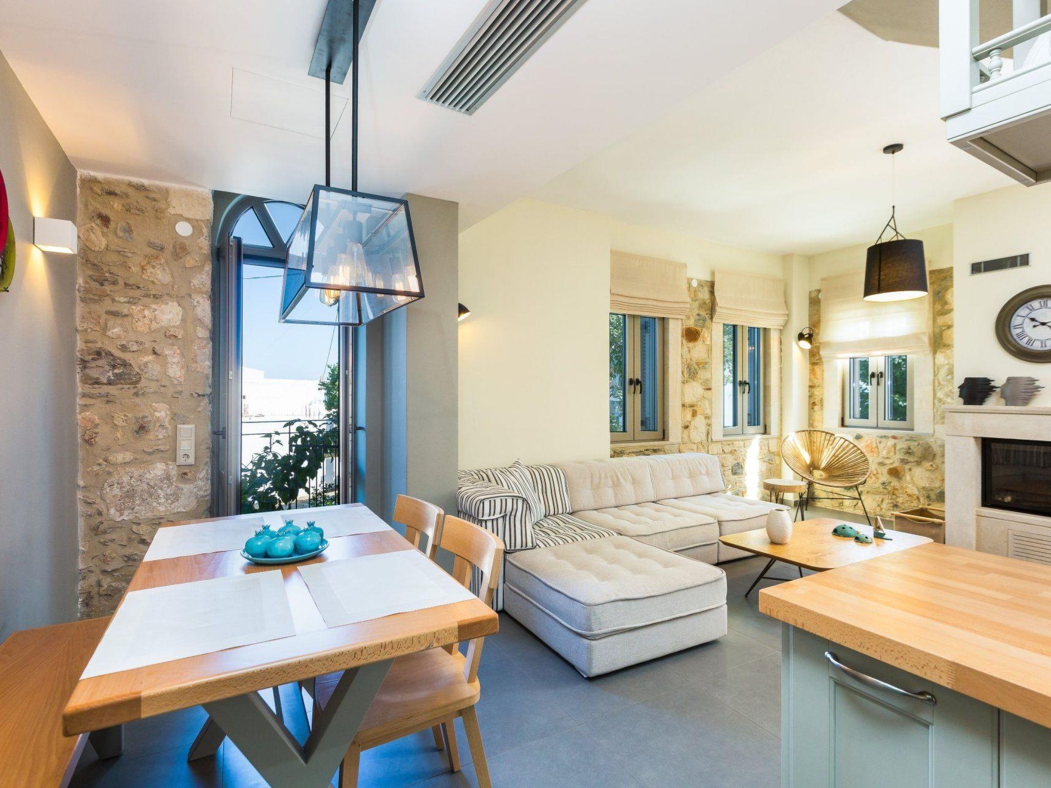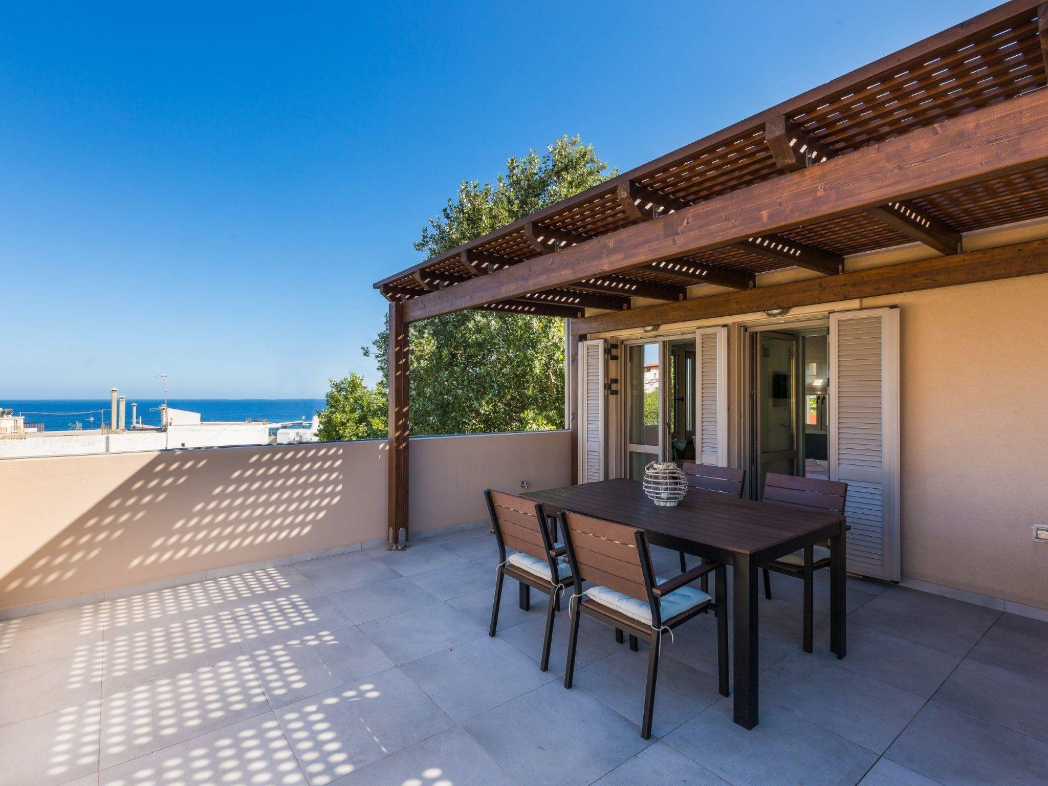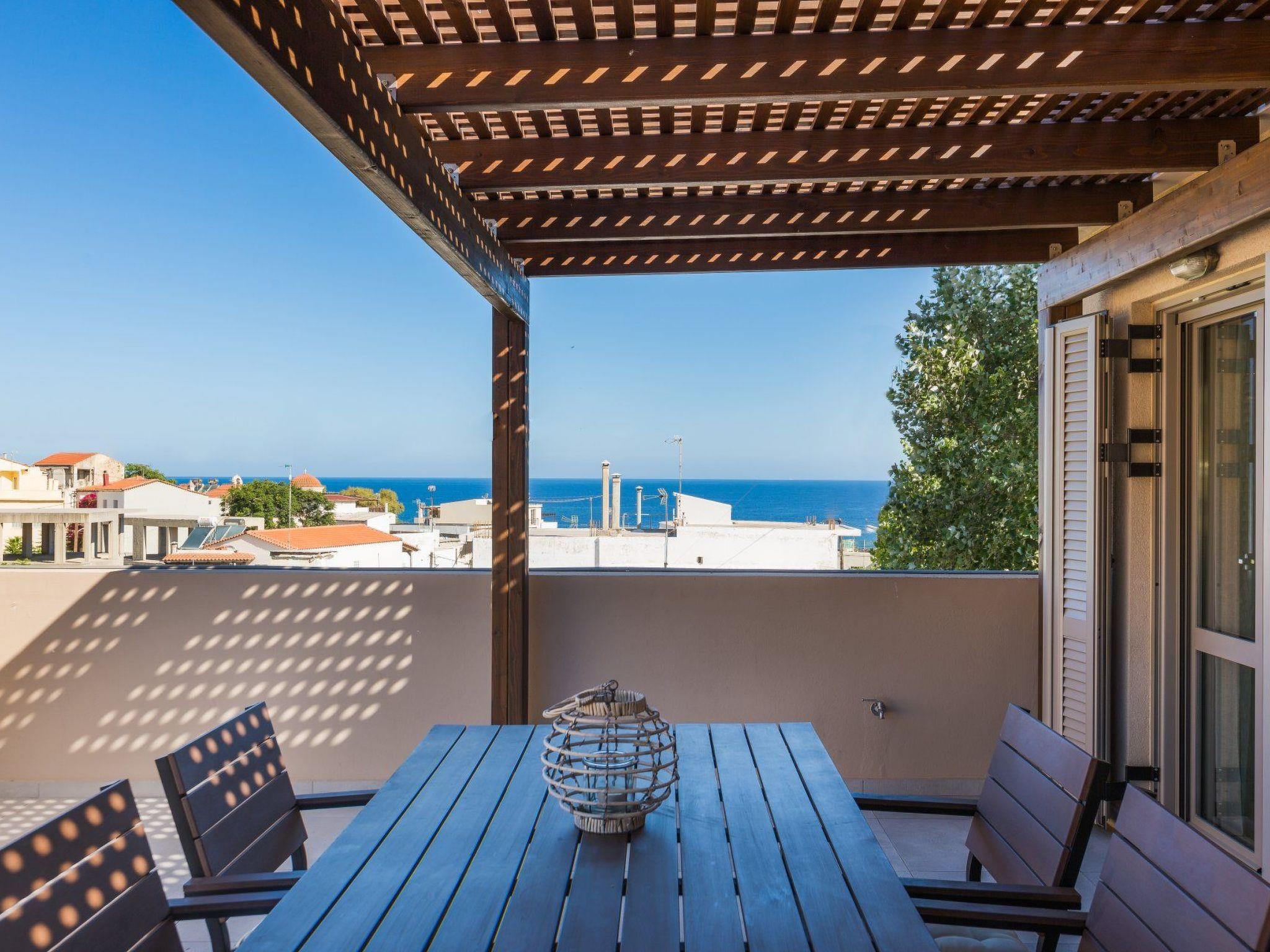 Im oberen Stockwerk befindet sich ein Schlafzimmer mit einem großen Doppelbett und ein weiteres Badezimmer mit Badewanne. Von der oberen Etage aus haben Sie Zugang zu einer schönen Terrasse mit herrlichem Meerblick. Die Terrasse ist mit einem großen Esstisch mit Stühlen ausgestattet und eine hölzerne Pergola bietet entspannende Momente unter dem kretischen Himmel.