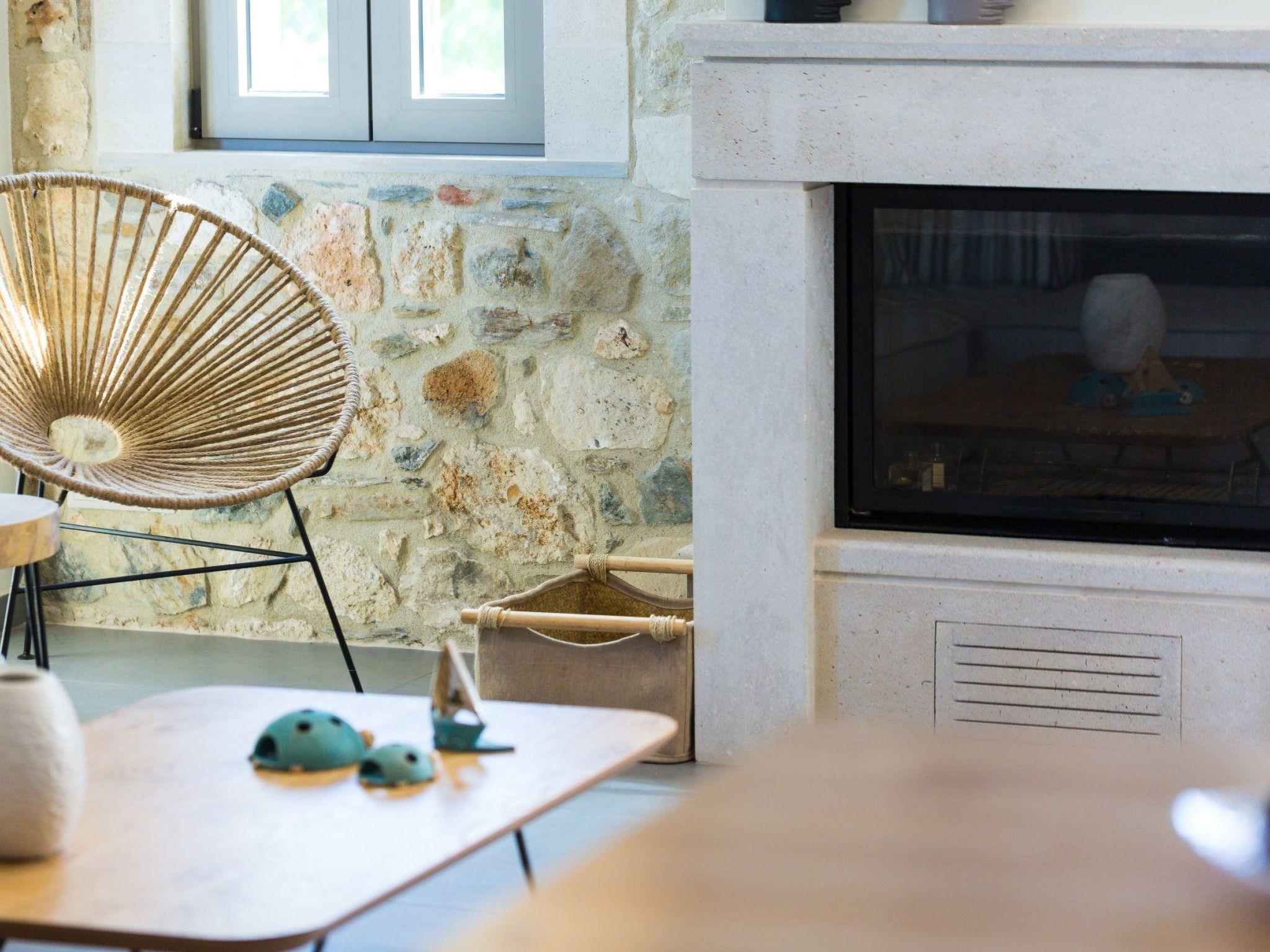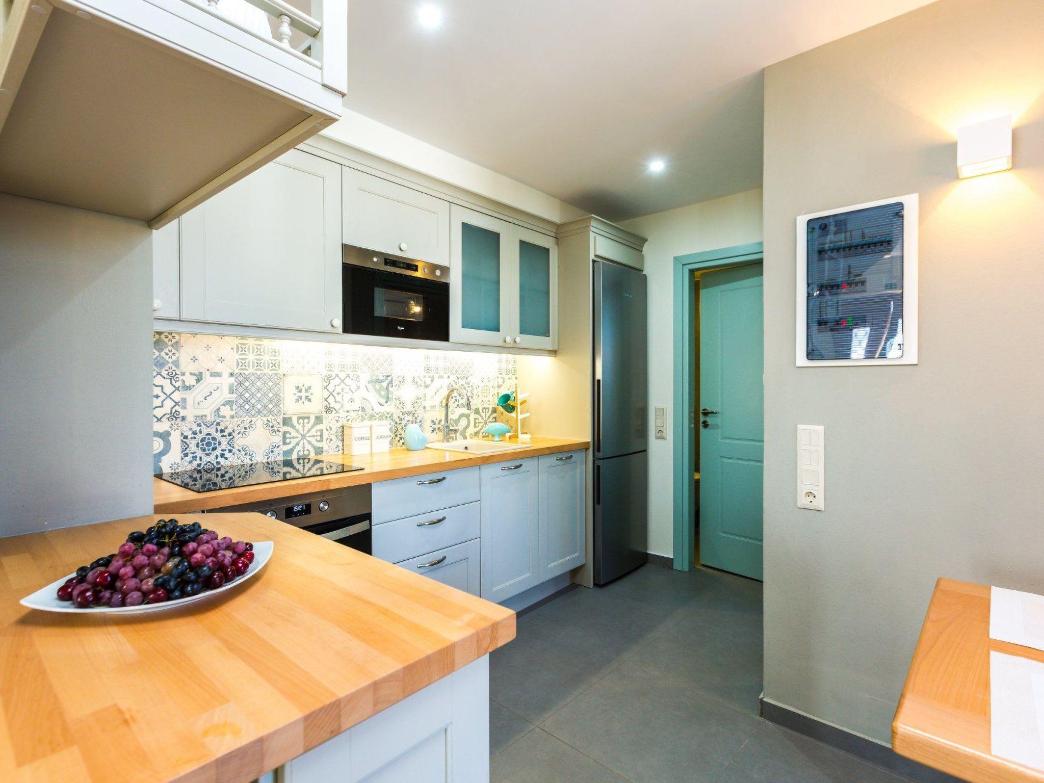 In der unteren Etage befindet sich ein Schlafzimmer mit zwei Einzelbetten und ein Badezimmer mit Dusche. Außerdem gibt es einen offenen Raum mit einer großen Küche mit allen notwendigen Elektrogeräten und einem Wohnzimmer mit Dreisitzer-Sofa (kann auch für eine Person genutzt werden), Sessel und Kamin. Die Küche ist mit allen notwendigen Geräten ausgestattet, und im Wohnzimmer befindet sich ein großer Satellitenfernseher. Auf der unteren Ebene haben Sie Zugang zu einem schönen Balkon mit Blick auf das Dorf Panormo, der mit einem Tisch und zwei Stühlen ausgestattet ist.