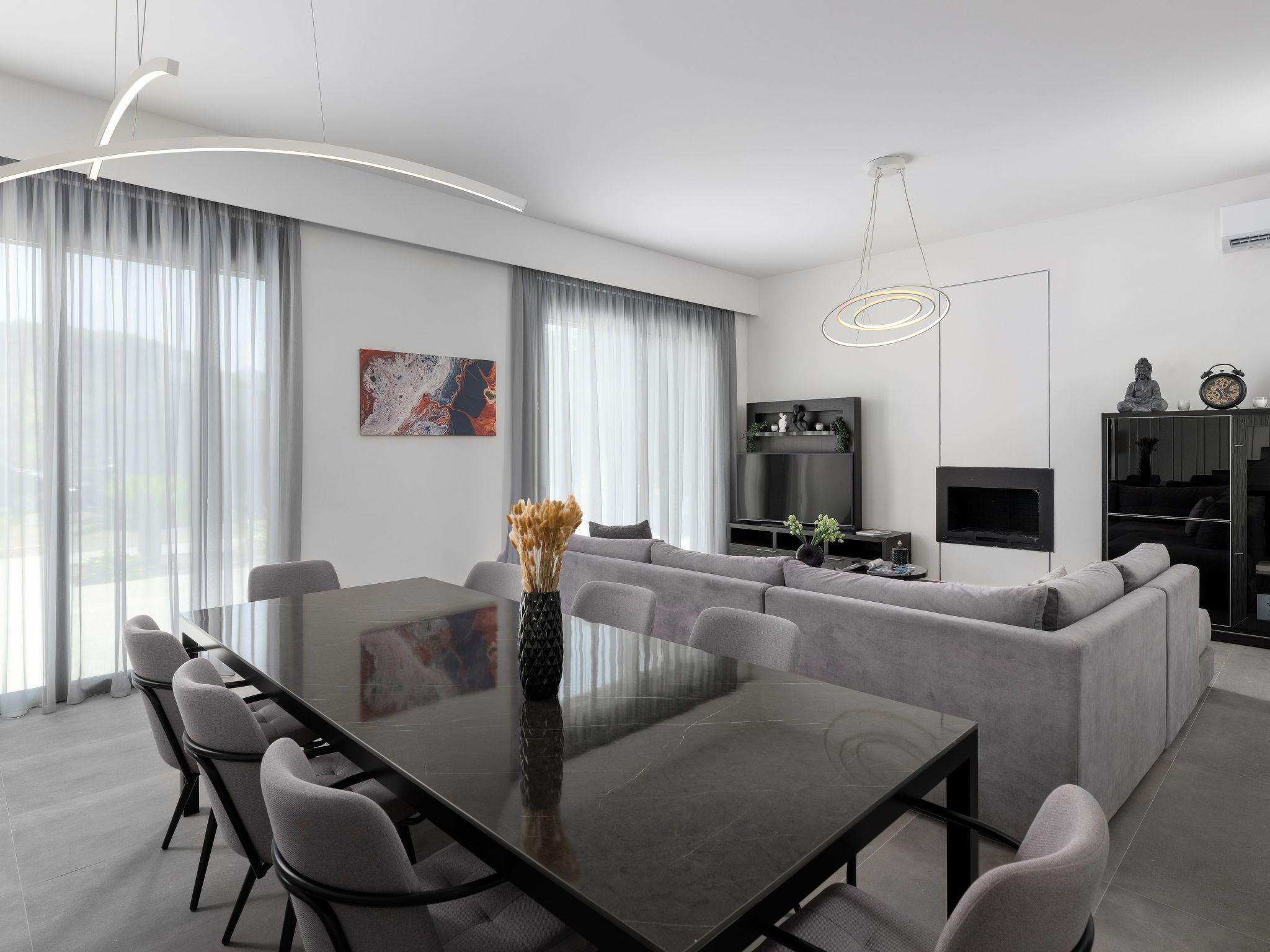 Wenn Sie das Erdgeschoss betreten, werden Sie von der Wärme der Sonne begrüßt, die durch die übergroßen Fenster fällt und den hellen und einladenden Wohnbereich erhellt. Lassen Sie sich in die bequemen Sofas am Kamin sinken, wo gemütliche Abende und Filmvorführungen auf Sie warten. Nebenan erwartet Sie ein moderner Essbereich, der für intime Zusammenkünfte von bis zu acht Gästen geeignet ist, während die voll ausgestattete Küche für kulinarische Abenteuer zur Verfügung steht und einen direkten Zugang zum Pool und Grillplatz bietet, so dass Sie das Leben drinnen und draußen nahtlos miteinander verbinden können.