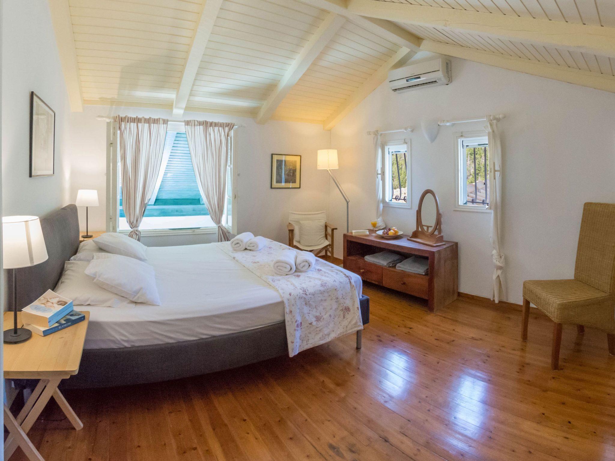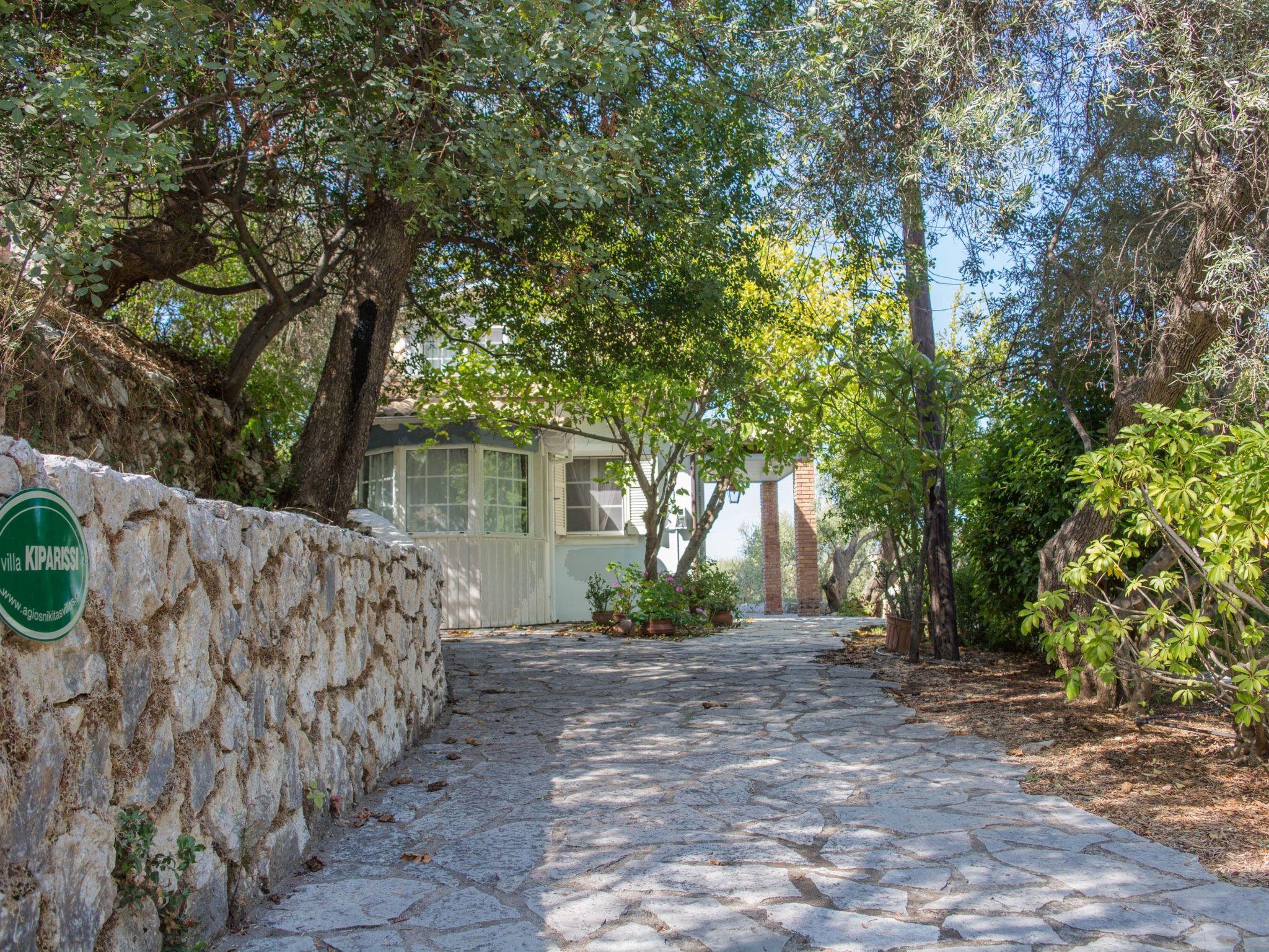 Außenbereich Eine asphaltierte Zufahrt führt vom Dorf Agios Nikitas hinauf zur Villa. Auf verschiedenen Ebenen gelegen, umgeben Natursteinmauern, Olivenbäume, Sträucher, Kletterpflanzen und Kakteen jede Villa, um Privatsphäre zu schaffen. Die Villa verfügt über einen eigenen Parkplatz, einen privaten Swimmingpool mit Terrasse und Möbeln. Die große Terrasse ist mit Terrassenmöbeln, einem Kaminofen und einem Grill ausgestattet. Die Villa befindet sich auf der höchsten der drei Ebenen. Sie hat einen ungehinderten Blick auf das Meer und den Pool und einen schattigen Sonnenschirm, unter dem man entspannt sitzen und einen frischen Kaffee zum Frühstück genießen kann, während man diese Aussicht überblickt und den Raubvögeln zuhört, die im Hintergrund über den Hügeln "miauen". Das ist perfekt! Zur Mittagszeit weht eine erfrischende, kühle Brise, die gerade abflaut, als die Sonne untergeht.