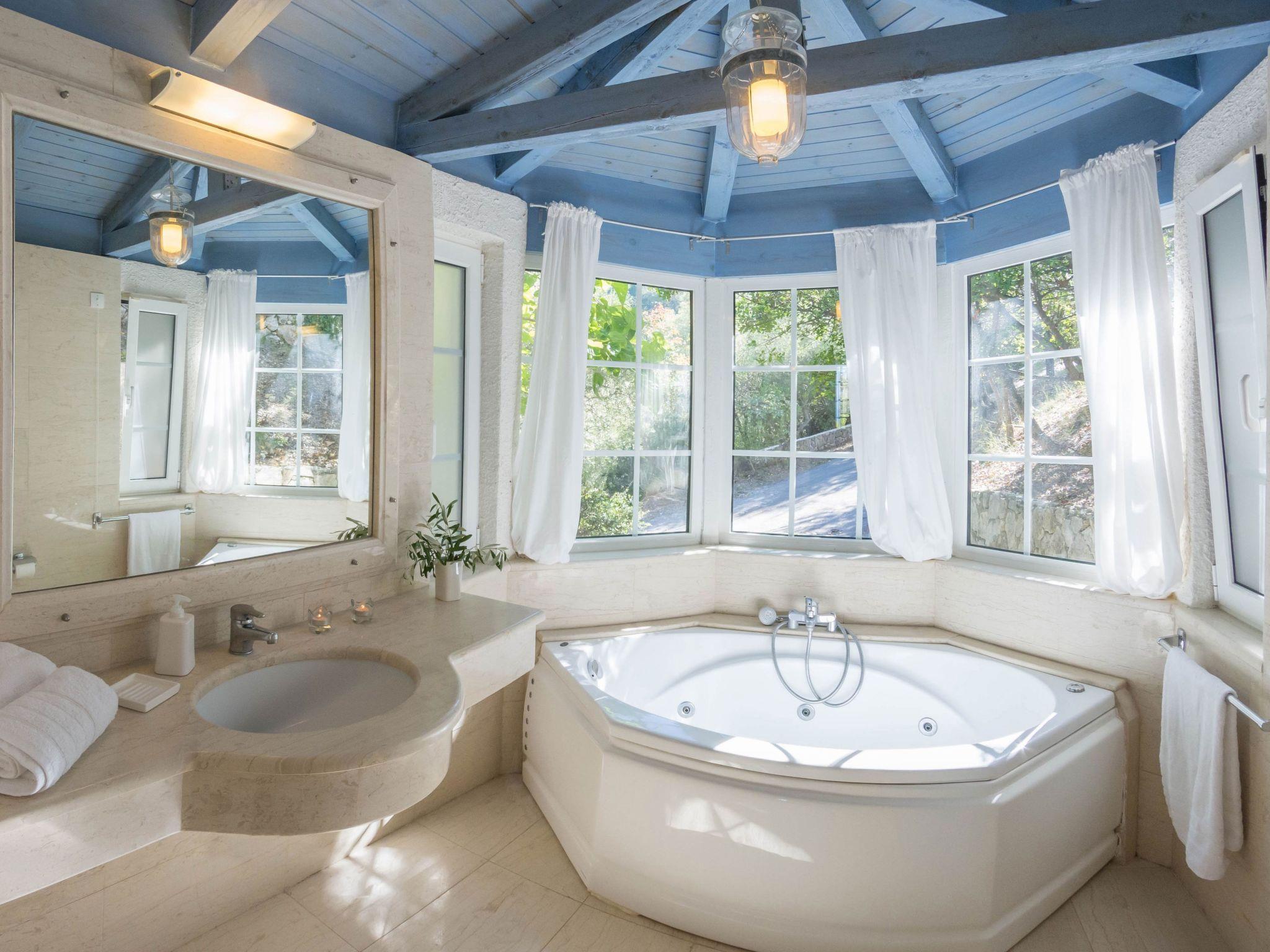 Außenbereich Eine asphaltierte Zufahrt führt vom Dorf Agios Nikitas zu den Villen hinauf. Auf verschiedenen Ebenen gelegen, umgeben Natursteinmauern, Olivenbäume, Sträucher, Kletterpflanzen und Kakteen jede Villa, um Privatsphäre zu schaffen. Die Villa verfügt über einen eigenen Parkplatz, einen privaten Swimmingpool mit Terrasse und Möbeln. Die große Terrasse ist mit Terrassenmöbeln, einem Kaminofen und einem Grill ausgestattet. Die Villa befindet sich auf der höchsten der drei Ebenen. Sie hat einen ungehinderten Blick auf das Meer und den Pool und einen schattigen Sonnenschirm, unter dem man entspannt sitzen und einen frischen Kaffee zum Frühstück genießen kann, während man diese Aussicht überblickt und den Raubvögeln zuhört, die im Hintergrund über den Hügeln "miauen". Das ist perfekt! Zur Mittagszeit weht eine erfrischende, kühle Brise, die gerade abflaut, als die Sonne untergeht.