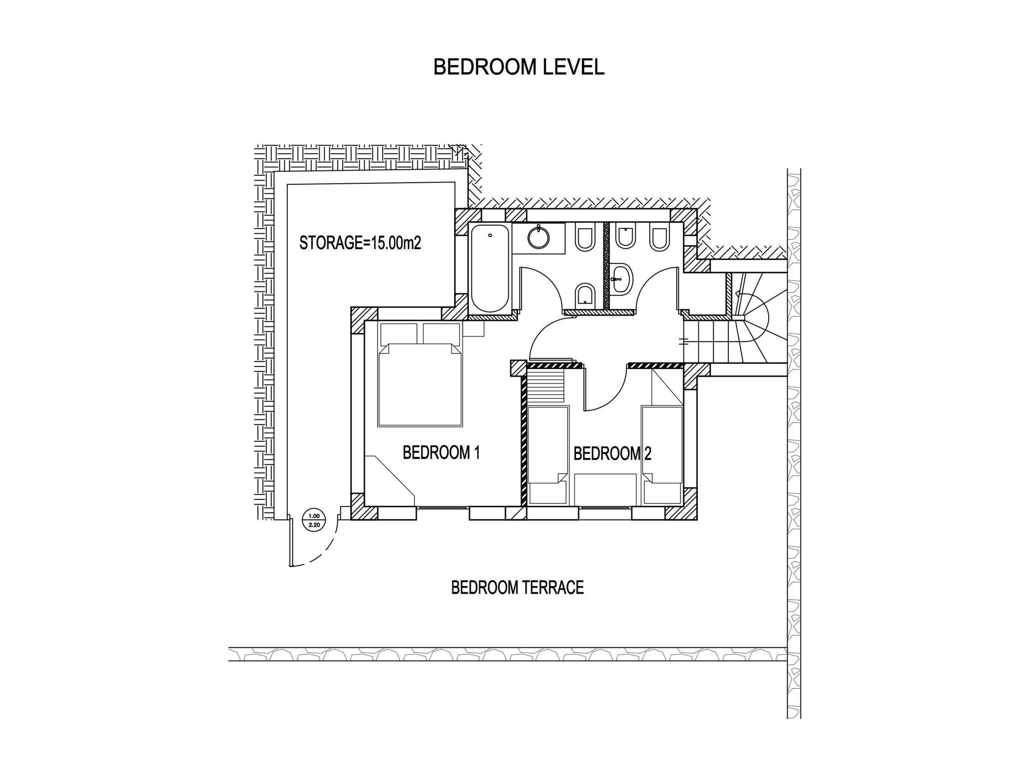 Die Villa ist ca. 100 m² groß, aufgeteilt in zwei Hauptebenen und ein Dachgeschoss, mit 2 Schlafzimmern, 2 Bädern und 1 WC mit Dusche, plus das Dachgeschoss als drittes Schlafzimmer. Beim Betreten der Villa befindet sich auf der Haupteingangsebene ein offener Wohn-/Ess-/Küchenbereich. Der Wohnbereich verfügt über einen Kamin und Fenstertüren, die auf einen großen, überdachten Balkon mit Blick auf das Meer führen. Der Essbereich hat französische Fenster, die auf die große Poolterrasse führen. Neben der Küche führt eine Treppe hinauf zum Dachboden und hinunter zu den Schlafzimmern, sowie zu einem Badezimmer mit Dusche, das für diese Etage und den Dachboden gemeinsam genutzt wird. Eine Treppe führt hinunter zu einem Doppelschlafzimmer mit eigenem geräumigen Bad, das auf eine große offene Terrasse führt, und zu einem Zweibettzimmer, das auf dieselbe offene Terrasse führt, neben einem weiteren Bad mit Dusche. Von der Hauptebene führt eine offene Treppe hinauf zum Dachboden, wo sich ein drittes Schlafzimmer mit zwei Einzelbetten befindet.