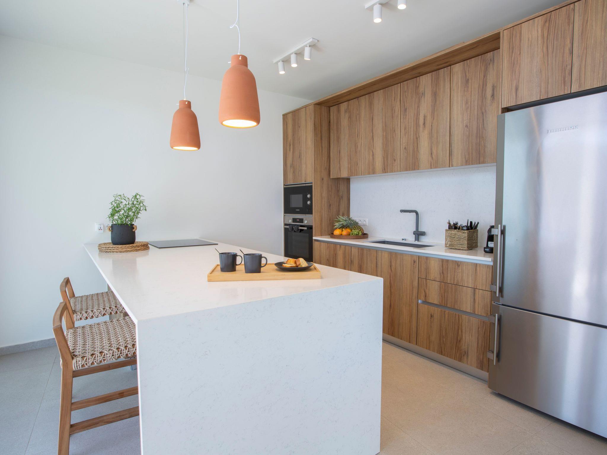 Die voll ausgestattete Küche verfügt über hochwertige Geräte wie Kühlschrank, Backofen, Herd, Mikrowelle und Geschirrspüler. Ein stilvoller Essbereich mit einem großen Tisch lädt die Gäste ein, die Mahlzeiten gemeinsam zu genießen.