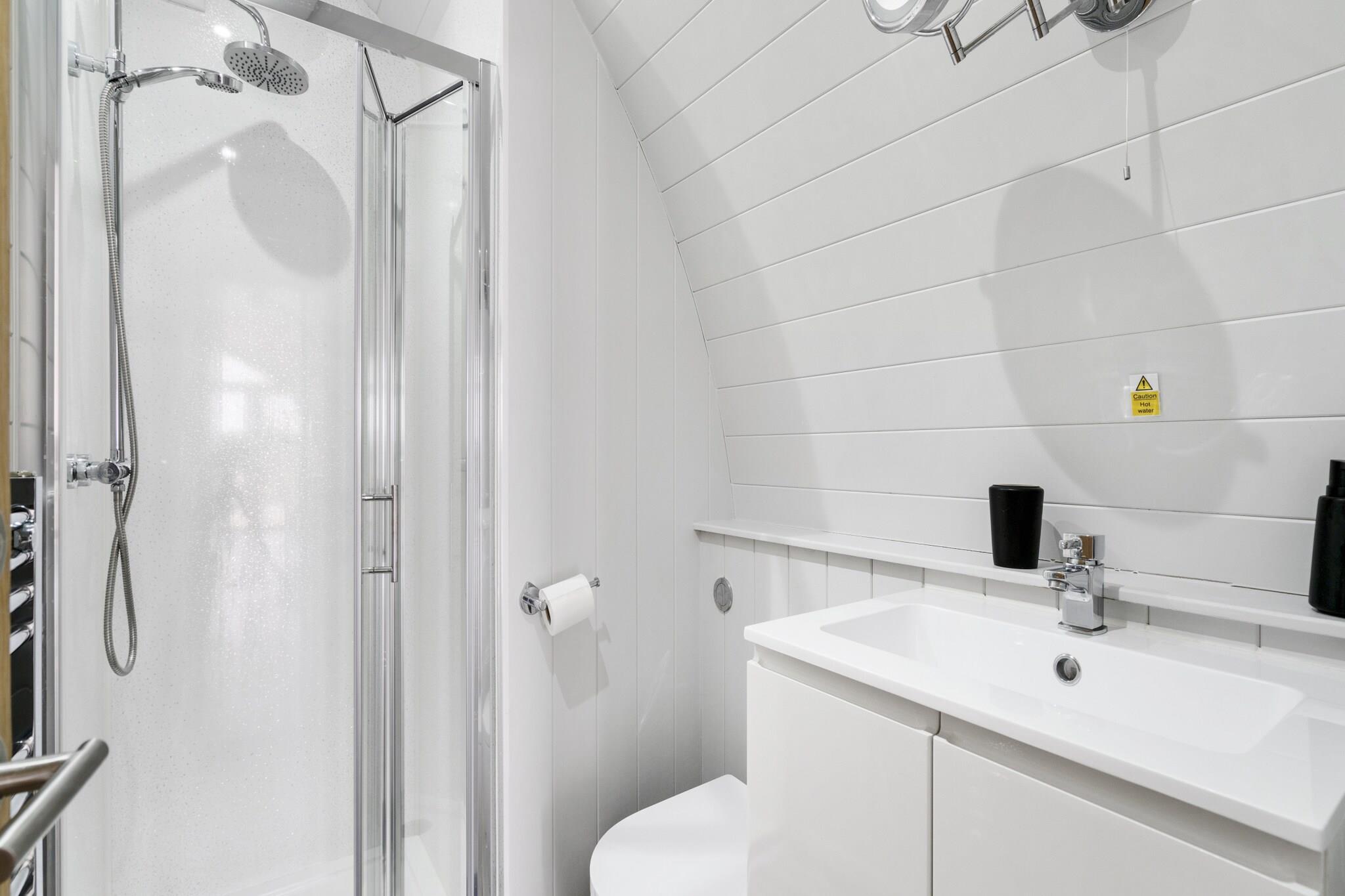 Dieses gemütliche Chalet bietet Platz für bis zu sechs Gäste und verfügt über zwei Schlafzimmer – eines mit einem Doppelbett und das andere mit zwei Einzelbetten – und ein Doppelschlafsofa im Wohnzimmer. Die Unterkunft eignet sich ideal für Familien und Paare und ist haustierfreundlich für bis zu zwei wohlerzogene Haustiere (gegen eine Gebühr pro Nacht). Ein privater, mit Holz befeuerter Whirlpool bietet einen ruhigen Blick auf den See und der Aufenthalt beinhaltet freien Zugang zu einem hauseigenen Bauernhofpark, wo Gäste Tiere wie Alpakas und Lämmer treffen können. An warmen Sommerabenden steht Ihnen ein Grill zur Verfügung. Darüber hinaus erhalten Sie Ermäßigungen im Laden mit regionalen Produkten auf dem Bauernhof. Dieses Chalet liegt nur wenige Autominuten vom Zentrum von Hertford und der A10 entfernt und bietet die perfekte Balance zwischen ländlicher Ruhe und städtischem Komfort. Zu den Sehenswürdigkeiten in der Nähe zählen das Hertford Castle mit seinen öffentlichen Gärten und der Chadwell Way Sculpture Trail – eine malerische, fünf Meilen lange Wanderroute durch Hertford, Ware und Great Amwell. Lokale Pubs, Cafés und Einkaufsmöglichkeiten sind leicht erreichbar und machen es zu einem gut vernetzten und dennoch ruhigen Rückzugsort. Im Inneren finden die Gäste eine offene Küche, einen Ess- und Wohnbereich sowie ein eigenes Duschbad. Die Küche ist mit allem Nötigen ausgestattet, darunter ein Herd, ein Kühlschrank, ein Wasserkocher und ein Essbereich. Heizung, Bettwäsche, Handtücher und die Endreinigung sind im Aufenthalt inbegriffen. Es gelten zusätzliche Regeln, wie zum Beispiel Badeverbot im See und Beschränkungen für offenes Feuer im Innenbereich. Der Check-in ist an ausgewählten Tagen von 15:00 bis 18:00 Uhr möglich.