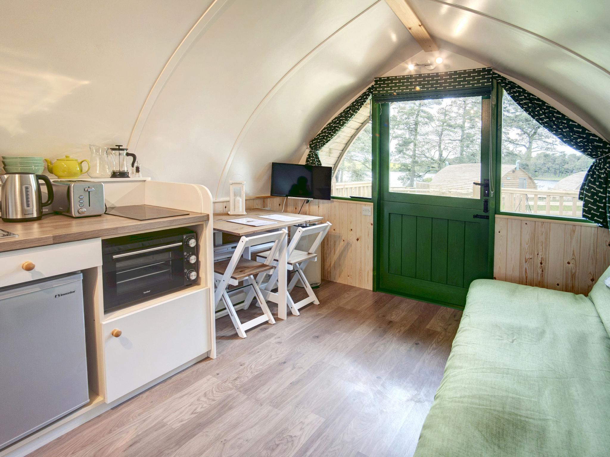 "Barebones Glamping", 2-Zimmer-Chalet 20 m2, im Erdgeschoss. Objekt geeignet für 4 Erwachsene + 1 Kind. Wohnzimmer mit 1 Diwanbett und 1 Ausziehbett. 1 Zimmer mit 1 Bett und 1 Doppelbett. Küche (Backofen, Toaster, Wasserkocher). Dusche/WC. Terrasse. Gartengrill. Zur Verfügung: Internet (WLAN, gratis). Parkplatz (2 Autos). Bitte beachten: Nichtraucher-Unterkunft.