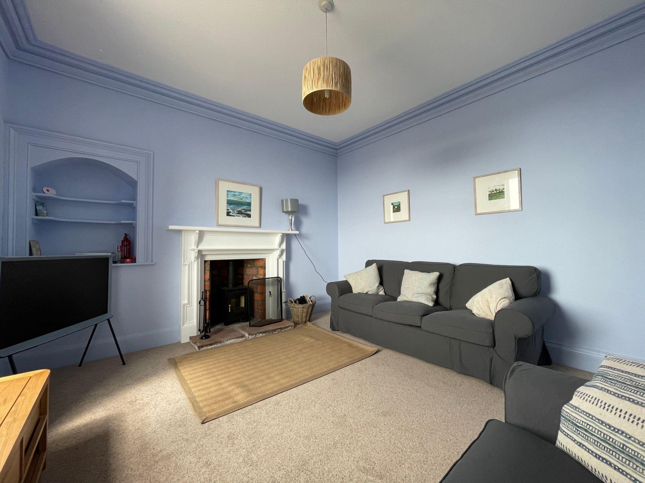 Wohnzimmer mit Holzbrenner und Smart-TV