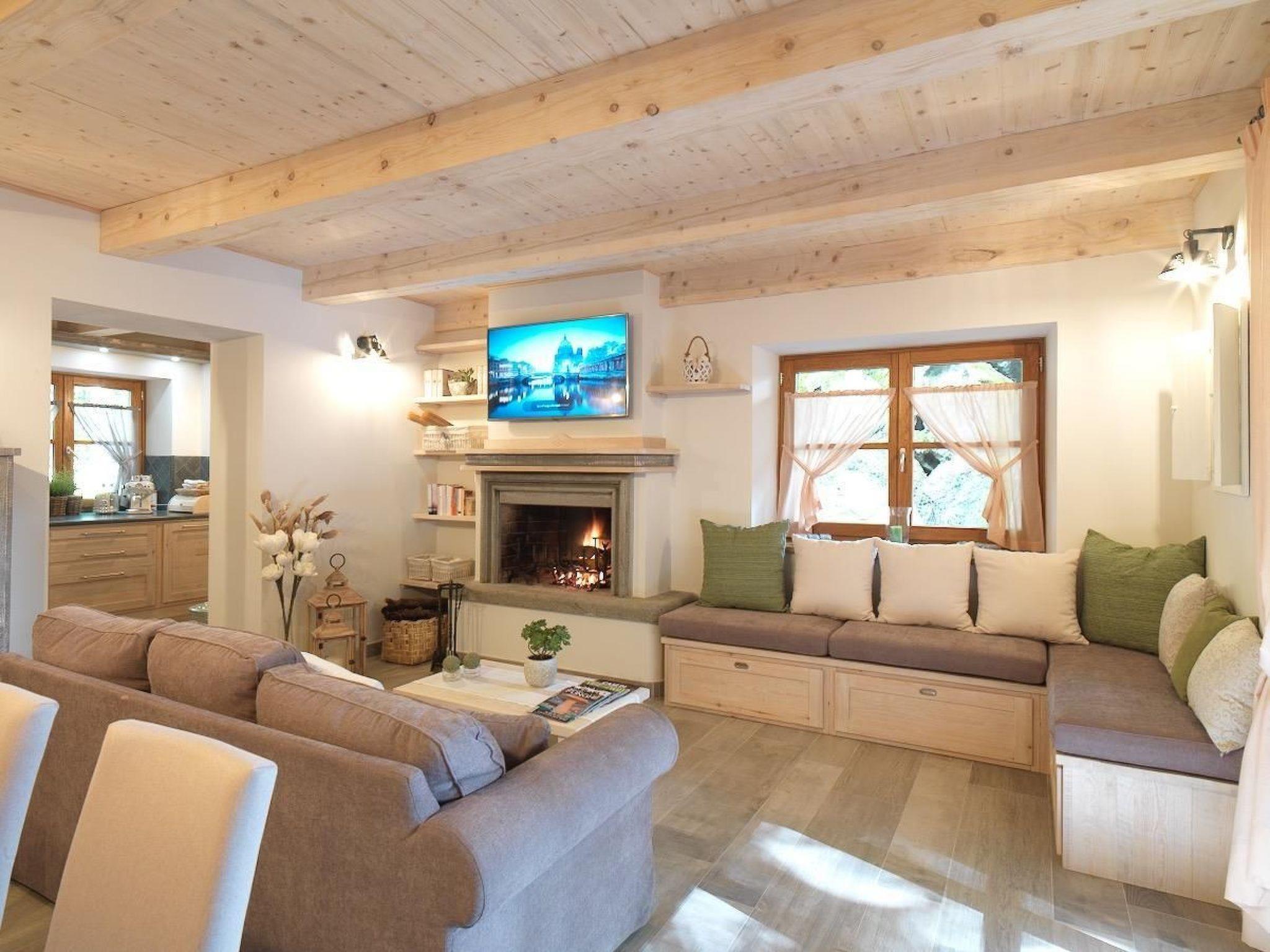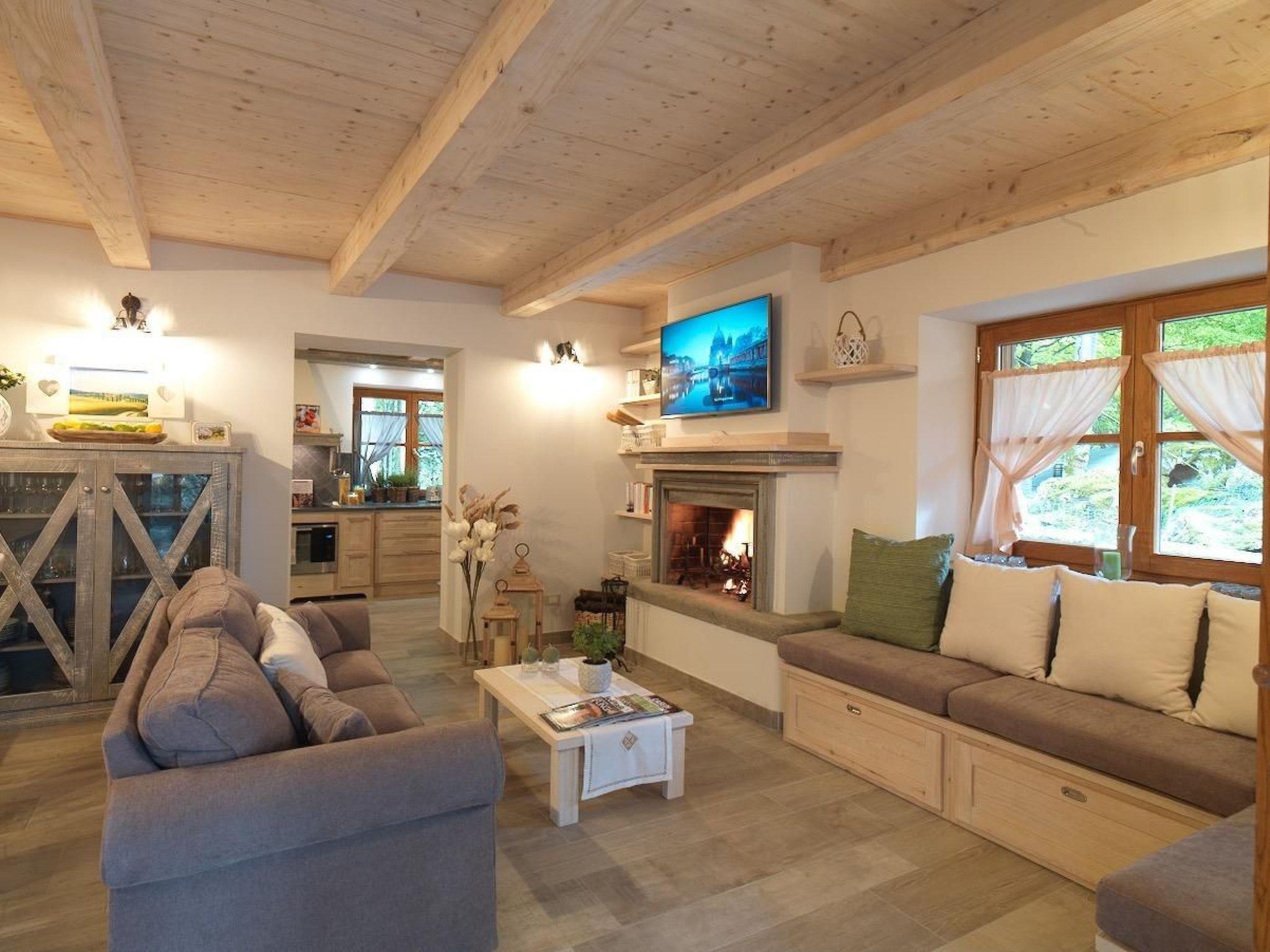 Ausstattung des Wohnzimmers: Wohnzimmer mit Kamin, Loungesofa, großem Tisch für gemütliche Abendessen, schickem LED-Satelliten-TV, Dolby-Surround-Sound und DVD, Bücher und Spiele