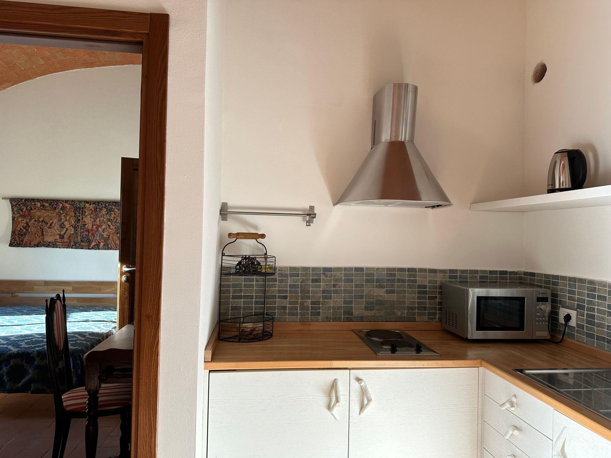 Das Apartment Vigneto befindet sich auf einer Ebene im Erdgeschoss der Villa und ist durch breite Türen und ein großzügiges Bad mit ebenerdiger Dusche auch für einen Rollstuhl oder Rollator geeignet. Es verfügt über eine Wohnküche und ein Schlafzimmer mit Doppelbett, bei Bedarf kann ein Zustellbett ergänzt werden.