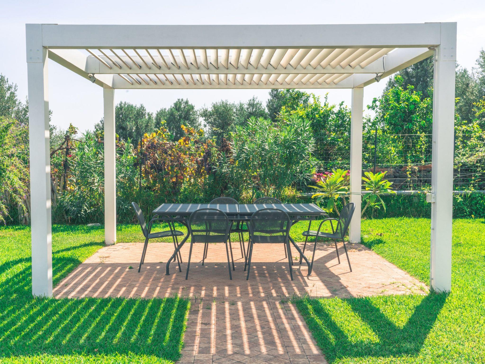 Die Villa befindet sich inmitten eines Zitronengartens. Auf dem Grundstück gibt es typisch sizilianische Obstbäume, die die Eigentümer gerne den Touristen anbieten. Das Haus ist von einem gepflegten Rasen umgeben, der mit Tischen, Stühlen und einem Grill ausgestattet ist.