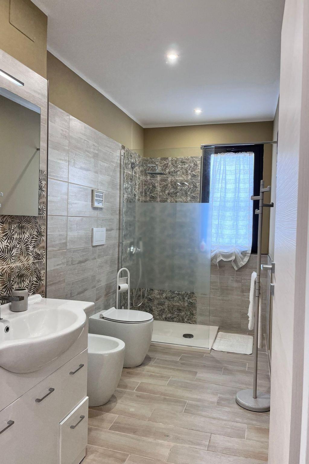 Das moderne und stilvolle Badezimmer ist mit allen notwendigen Annehmlichkeiten ausgestattet, einschließlich einer geräumigen Dusche, weichen Handtüchern und kostenlosen Toilettenartikeln, um Ihnen einen angenehmen Aufenthalt zu garantieren.