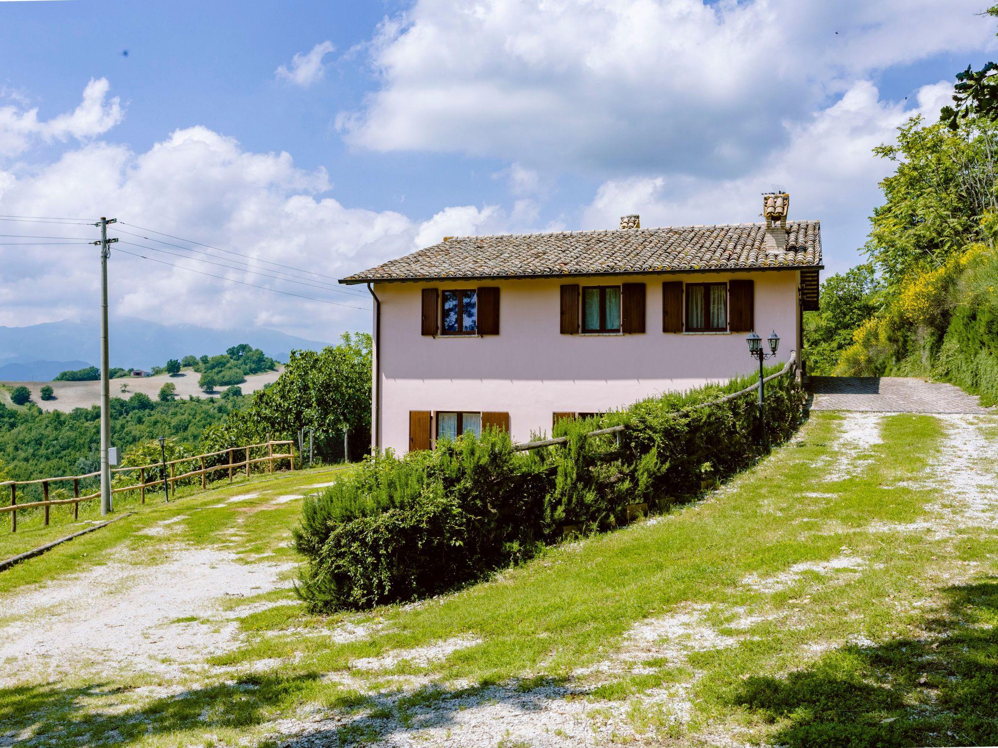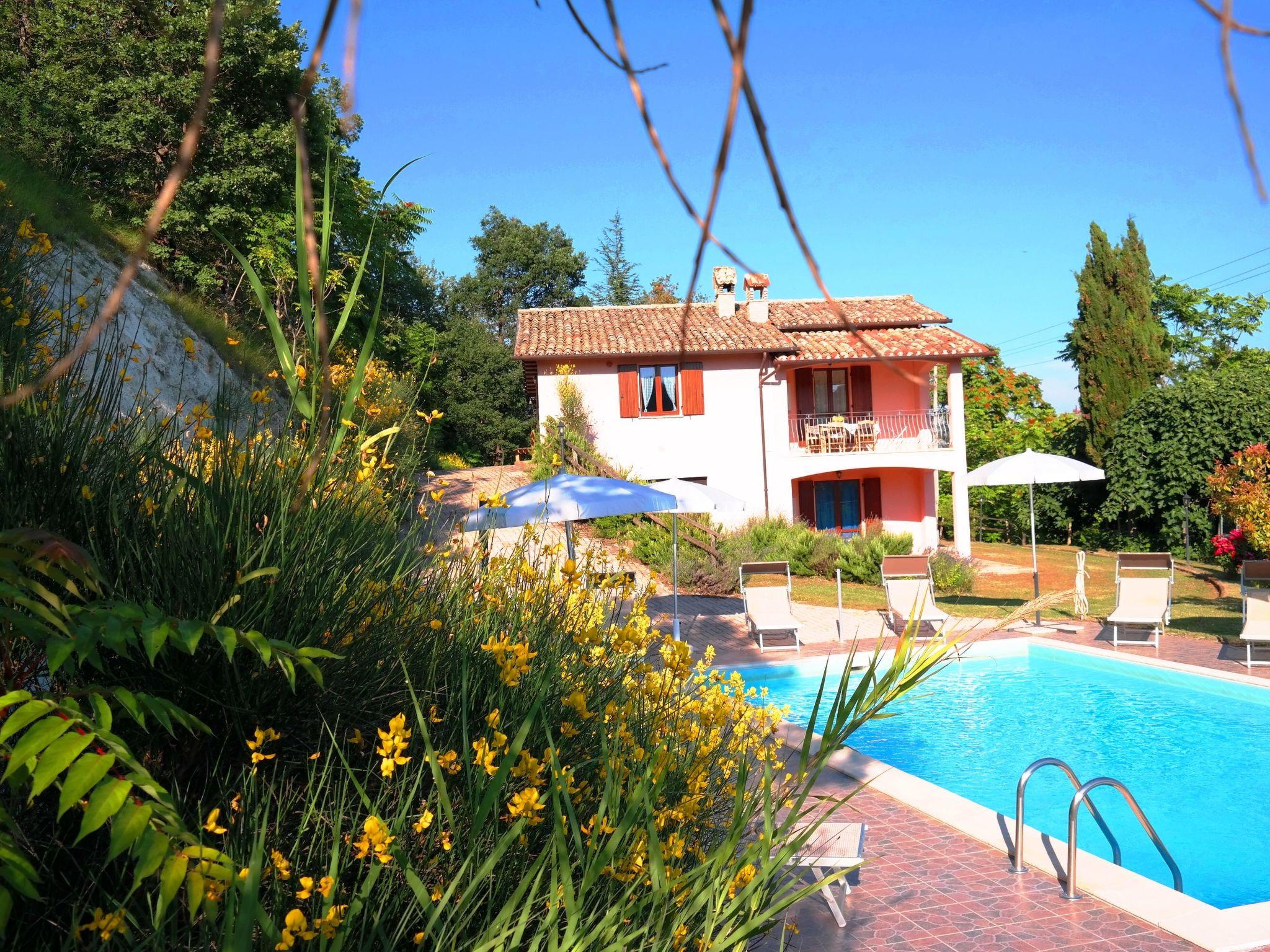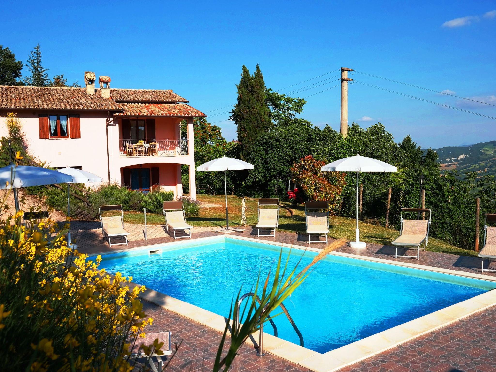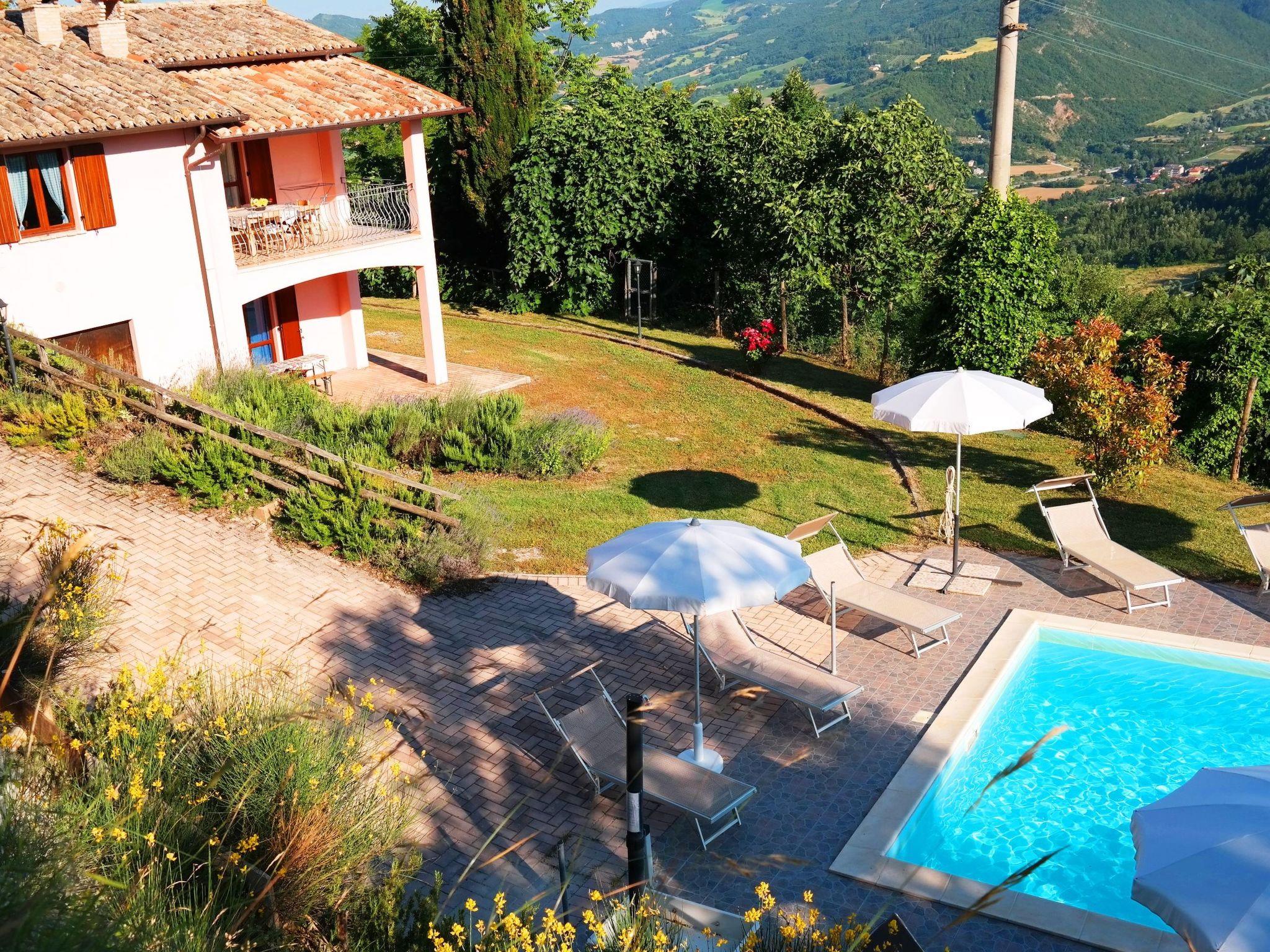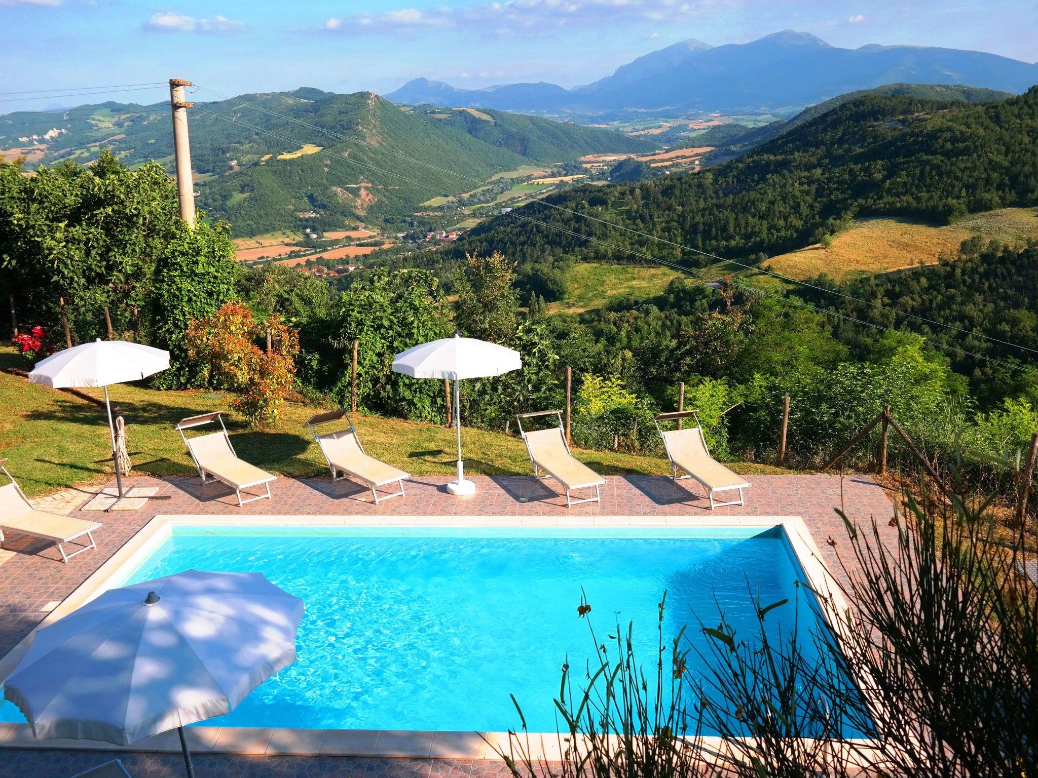 Das unabhängige Ferienhaus befindet sich in sehr sonniger Lage mit Panoramablick auf das Flusstal von Candigliano. Gleichzeitig können Sie das Panorama der Furlo-Schlucht und der drei Apenninenberge, Monte Catria, Petrano und Nero, bewundern.