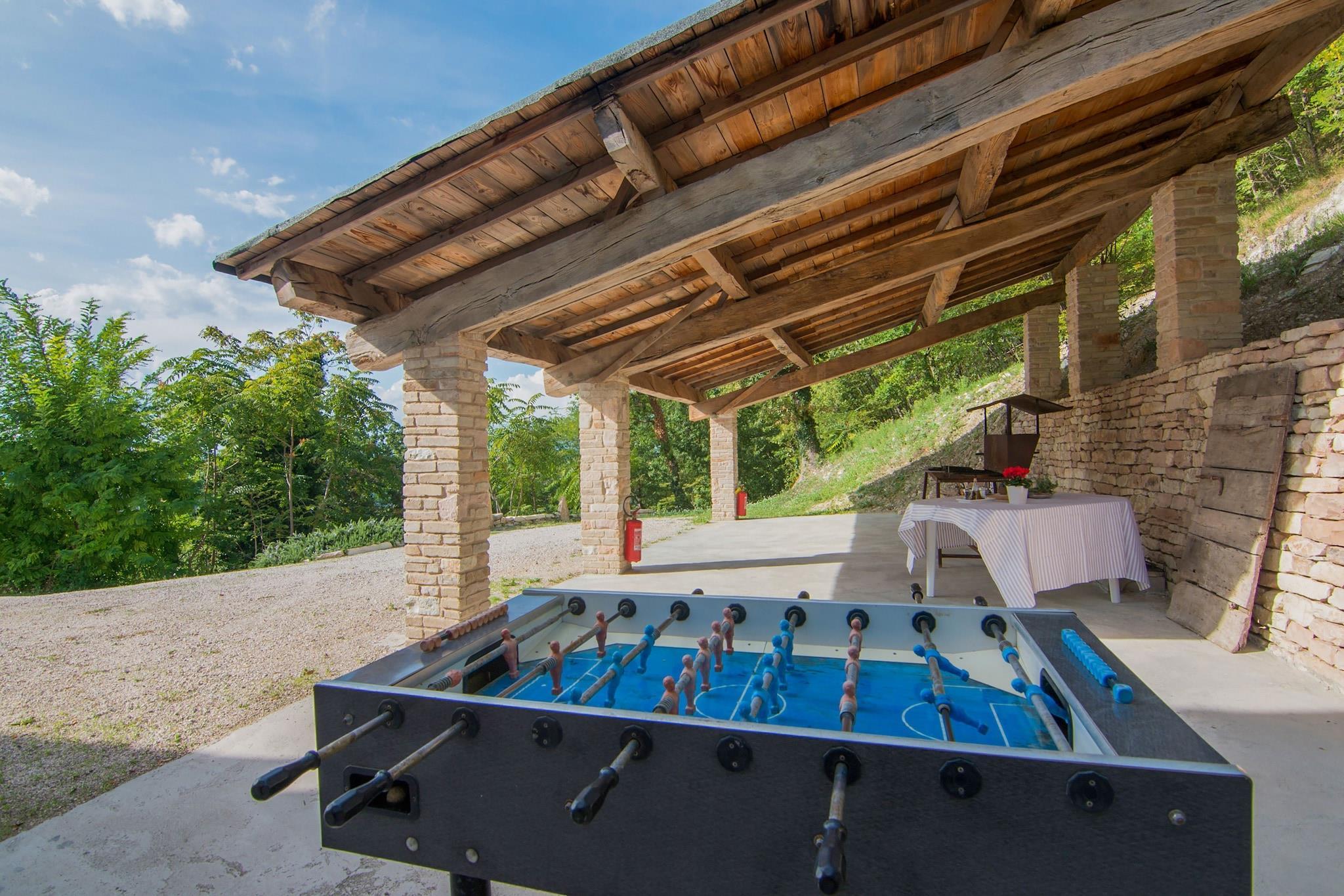 Diese geräumige, haustierfreundliche Villa, umgeben von üppigem Grün und nur 50 km vom Meer entfernt, bietet einen luxuriösen Rückzugsort für bis zu 10 Gäste. Mit einem Haupthaus und einem separaten Gästehaus ist sie ideal für große Familien oder Gruppen. Das helle Wohnzimmer, die voll ausgestattete Küche, die klimatisierten Schlafzimmer und mehrere Badezimmer sorgen für Komfort, während die überdachte Veranda mit Sitzgelegenheiten und großem Esstisch zum Essen im Freien einlädt. Entspannen Sie im Außensprudelbad, schwimmen Sie im privaten Pool mit flachem Kinderbereich oder befeuern Sie die Außenküche und den Grill für entspannte Abende. Fußbodenheizung und kostenloses WLAN sorgen für zusätzlichen Komfort und machen die Villa zu einem ganzjährigen Paradies. In der Nähe können Sie mittelalterliche Dörfer, malerische Wanderwege und lokale Weingüter erkunden. Ob Sie am Pool entspannen oder die Region erkunden - diese Villa ist der perfekte Ausgangspunkt für einen unvergesslichen Urlaub. Hinweis: Der Pool ist vom 1. Juni bis 30. September geöffnet.