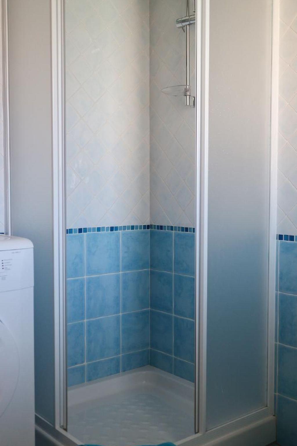 Im Inneren empfängt Sie das Ferienhaus mit einer voll ausgestatteten Küche mit Kühlschrank mit Gefrierfach, Backofen, Mikrowelle, Wasserkocher und Kaffeemaschine sowie einem kleinen Wohnbereich, in dem Sie sich entspannen können. Eine gemütliche Essecke mit Tisch und Stühlen flankiert das Sofa und schafft ein perfektes Ambiente für Ihre entspannten Momente. Am Ende des Korridors befinden sich zwei Schlafzimmer, eines mit Doppelbett und eines mit zwei Einzelbetten, sowie ein Badezimmer mit Dusche und Waschmaschine, das Ihnen allen Komfort bietet, den Sie brauchen.