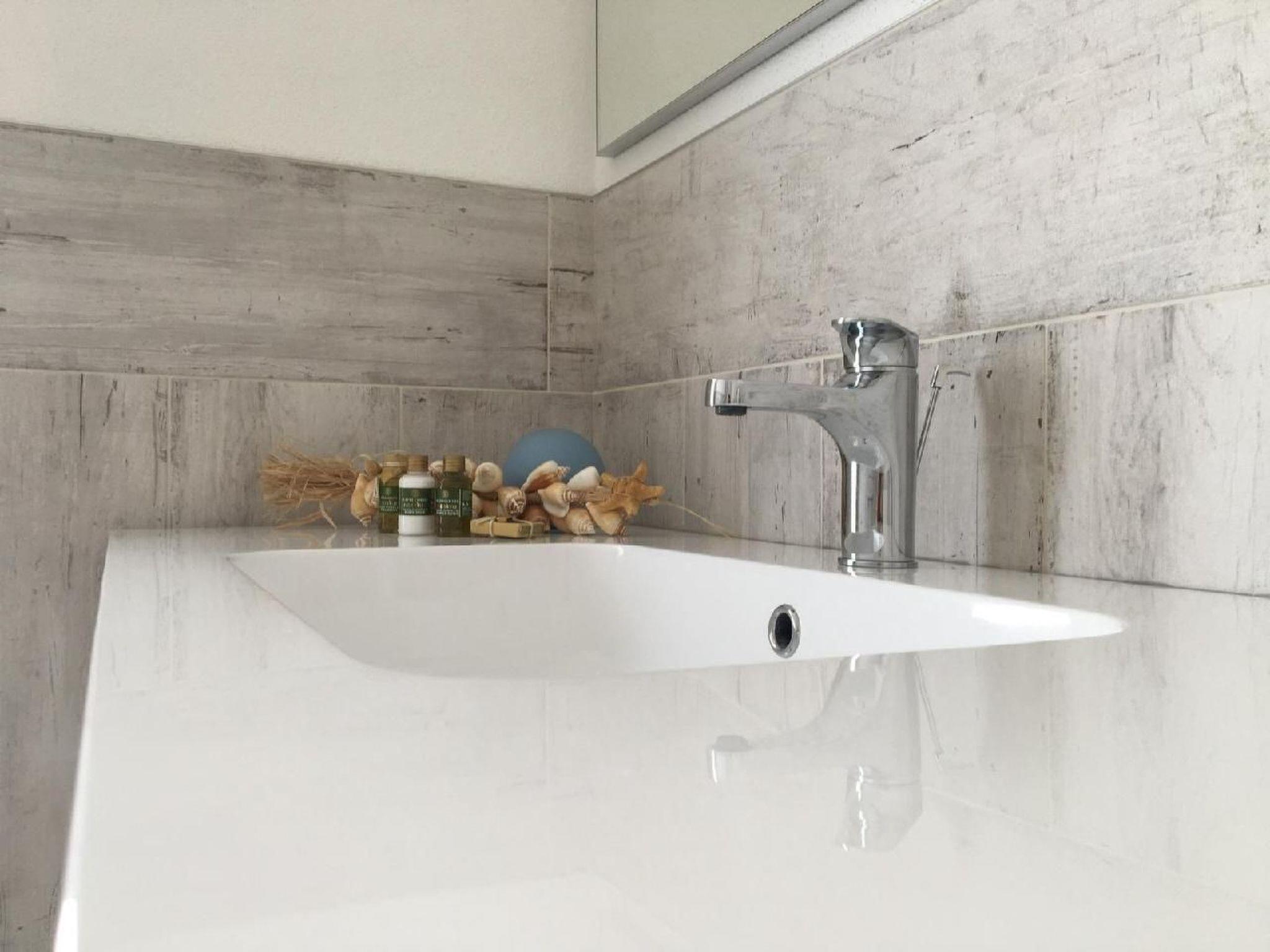 Das Innere des Hauses verfügt über eine offene Küche, die sich harmonisch in den gemütlichen Wohnbereich mit Sofa und Fernseher einfügt. Die Küche ist mit modernen Geräten wie Kühl-Gefrierschrank, Mikrowelle, Backofen, Geschirrspüler und Induktionskochfeld ausgestattet. Ein Korridor führt zu den beiden geräumigen Schlafzimmern, von denen eines ein Doppelbett hat und das andere flexibel ist - es kann je nach Bedarf als Doppelbett oder mit zwei Einzelbetten eingerichtet werden. Ein modernes Bad mit Dusche und ein bequemer direkter Zugang zum Garten vervollständigen die Einrichtung.