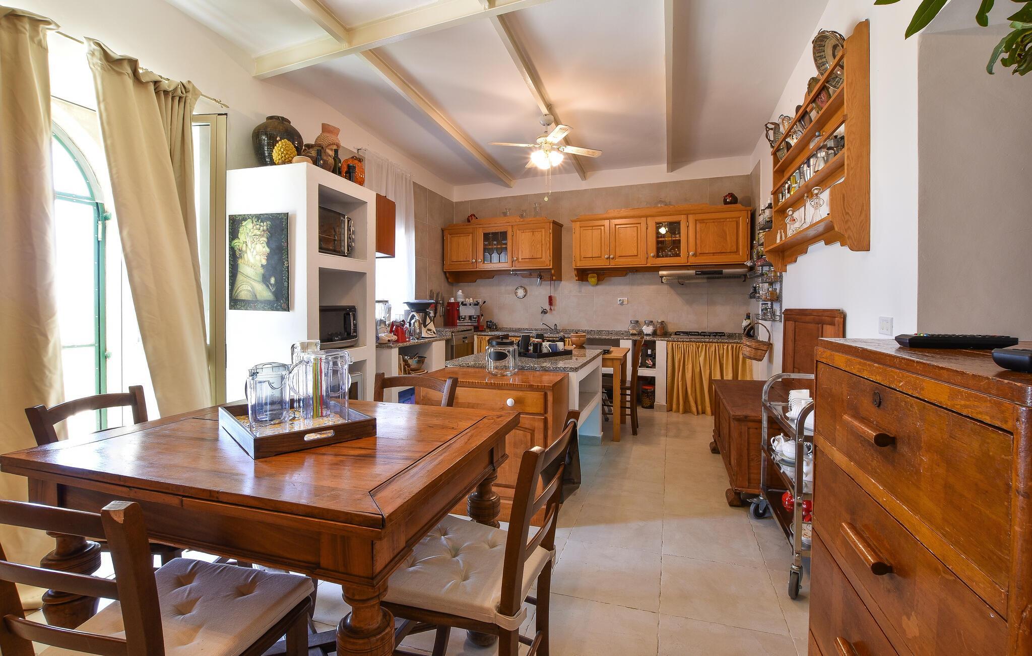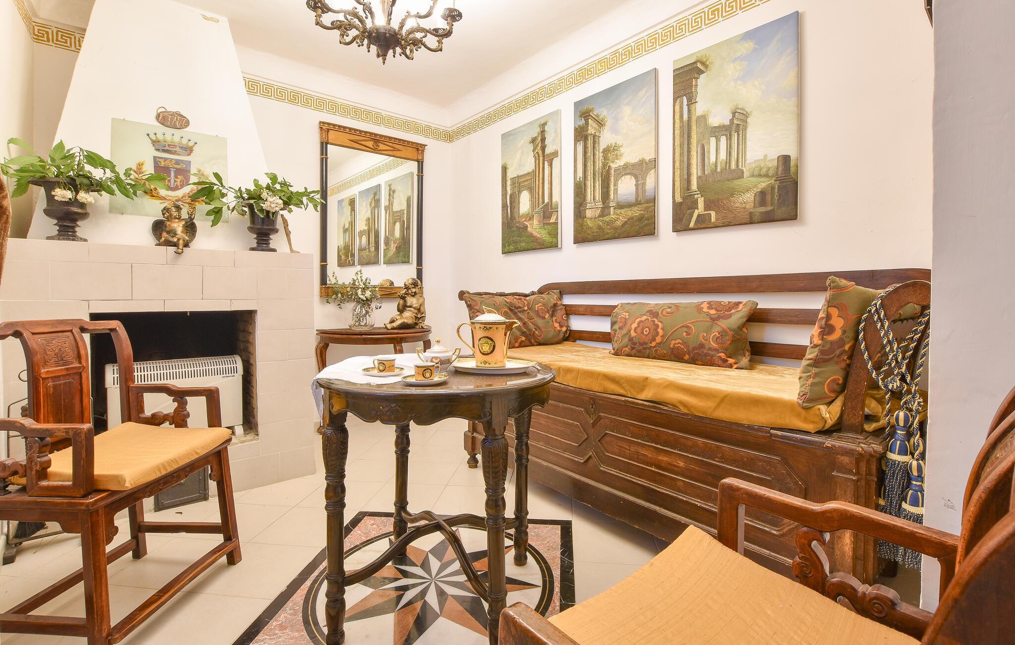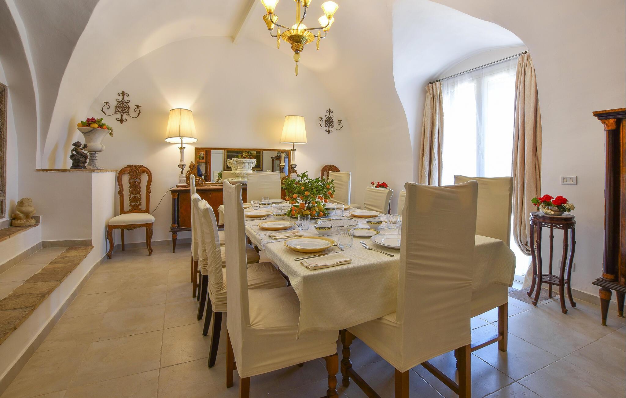 Im Inneren des herrschaftlich anmutenden Hauses erwartet Sie ein elegantes Ambiente mit antiken Möbeln und charmanten Details, die den Stil der Region widerspiegeln. Der lange Esstisch lädt zu kulinarischen Kreationen ein, der gemütliche Wohnbereich mit seinen bequemen Sofas zu entspannten Abenden.