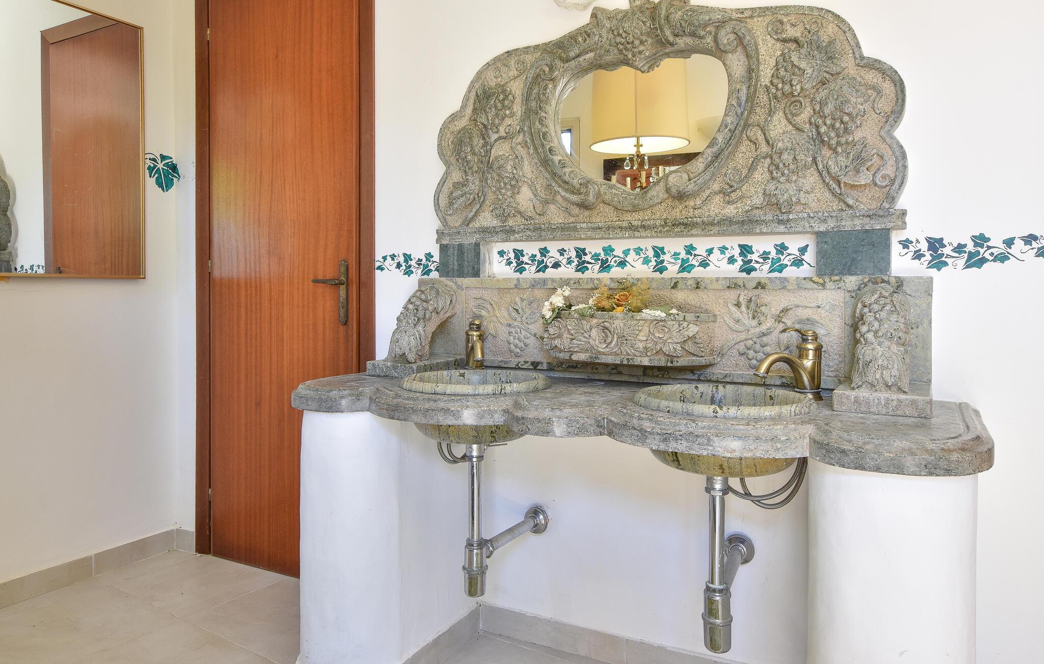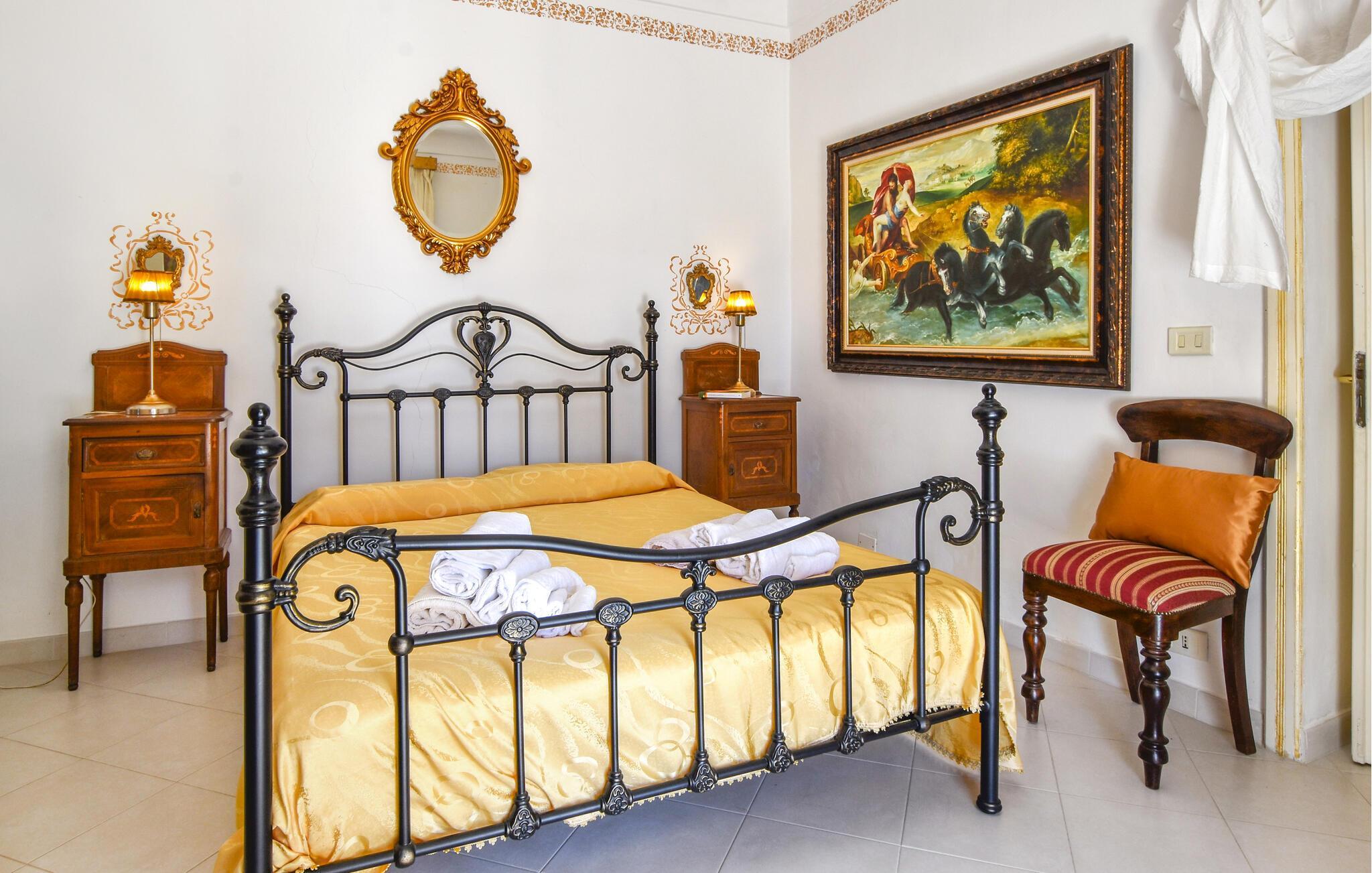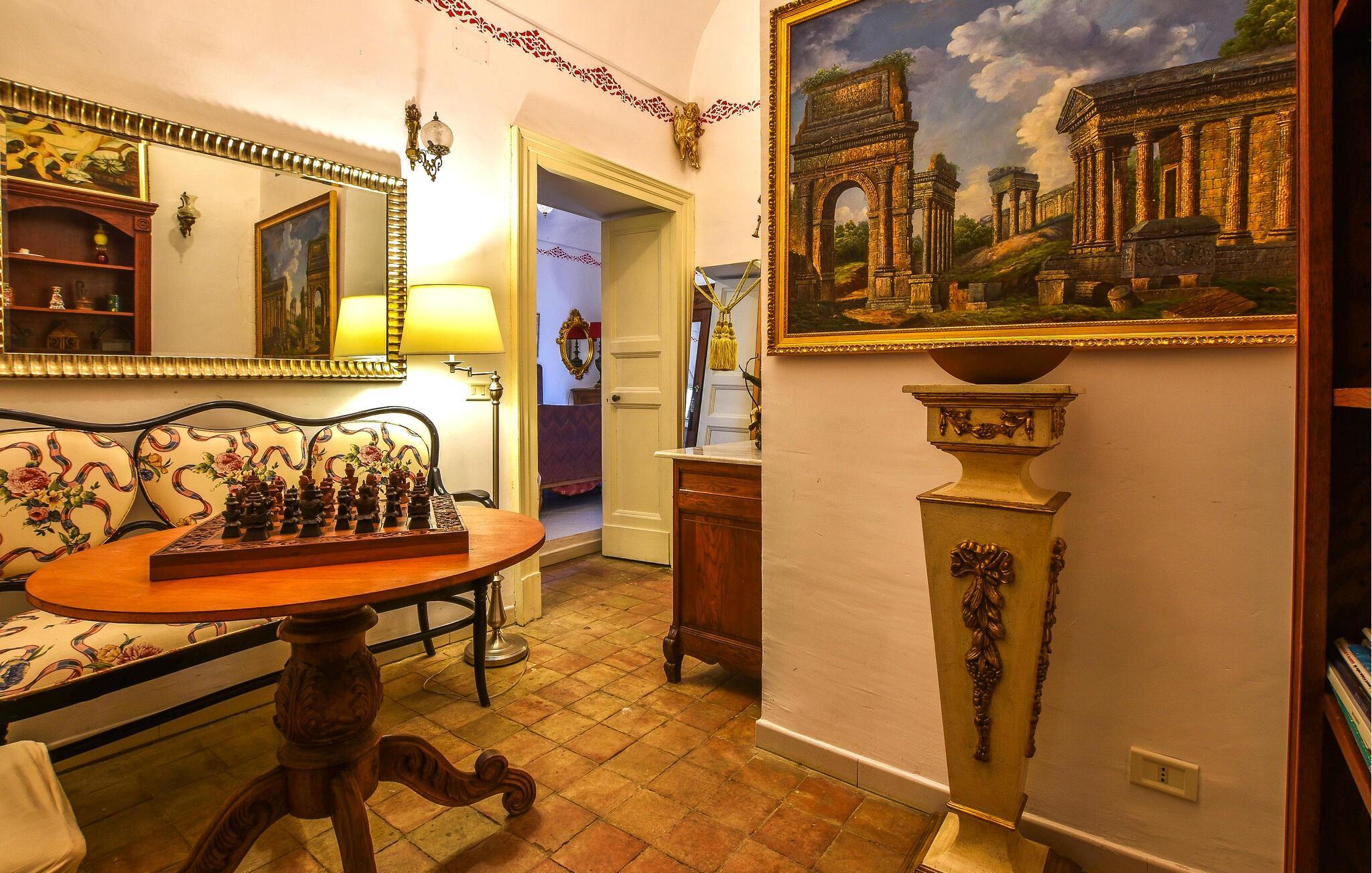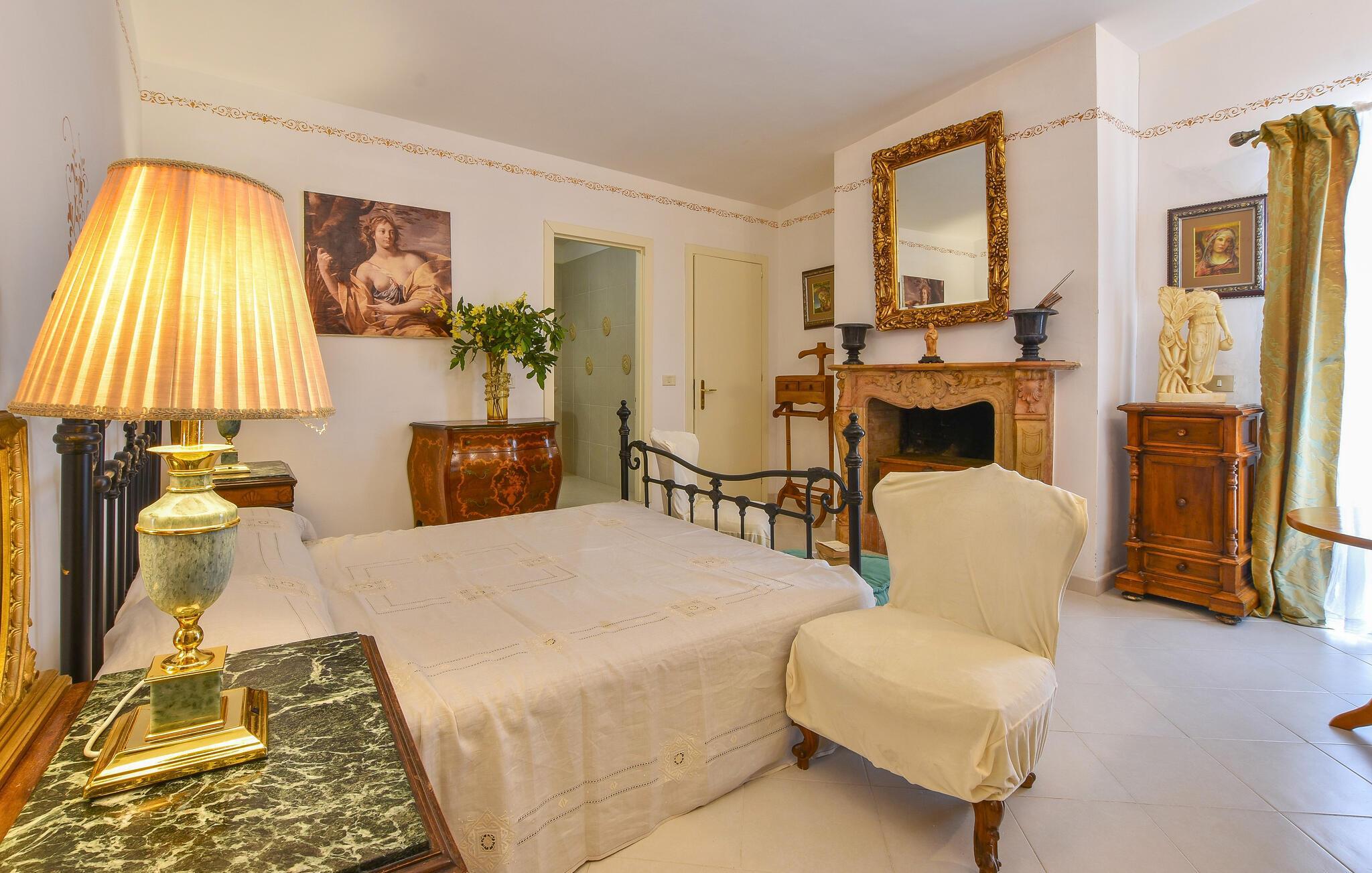 Im Inneren des herrschaftlich anmutenden Hauses erwartet Sie ein elegantes Ambiente mit antiken Möbeln und charmanten Details, die den Stil der Region widerspiegeln. Der lange Esstisch lädt zu kulinarischen Kreationen ein, der gemütliche Wohnbereich mit seinen bequemen Sofas zu entspannten Abenden.