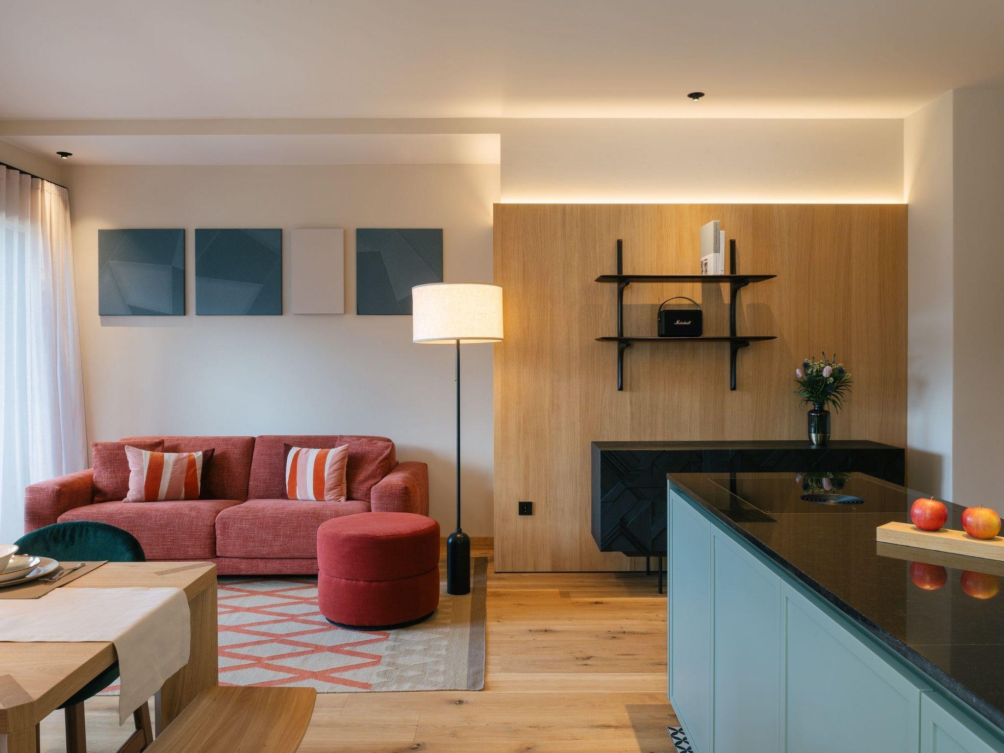 Das Apartment Euphoria befindet sich im Obergeschoss des Gästehauses ANTON und bietet einen zusätzlichen Luxus an Wohnfläche. Auf 75 m² Wohlfühlfläche befinden sich zwei Schlafzimmer, zwei Badezimmer, eine Wohnküche mit Couch und Sitzecke und eine 25 m² große Loggia mit Berg- und Talblick.