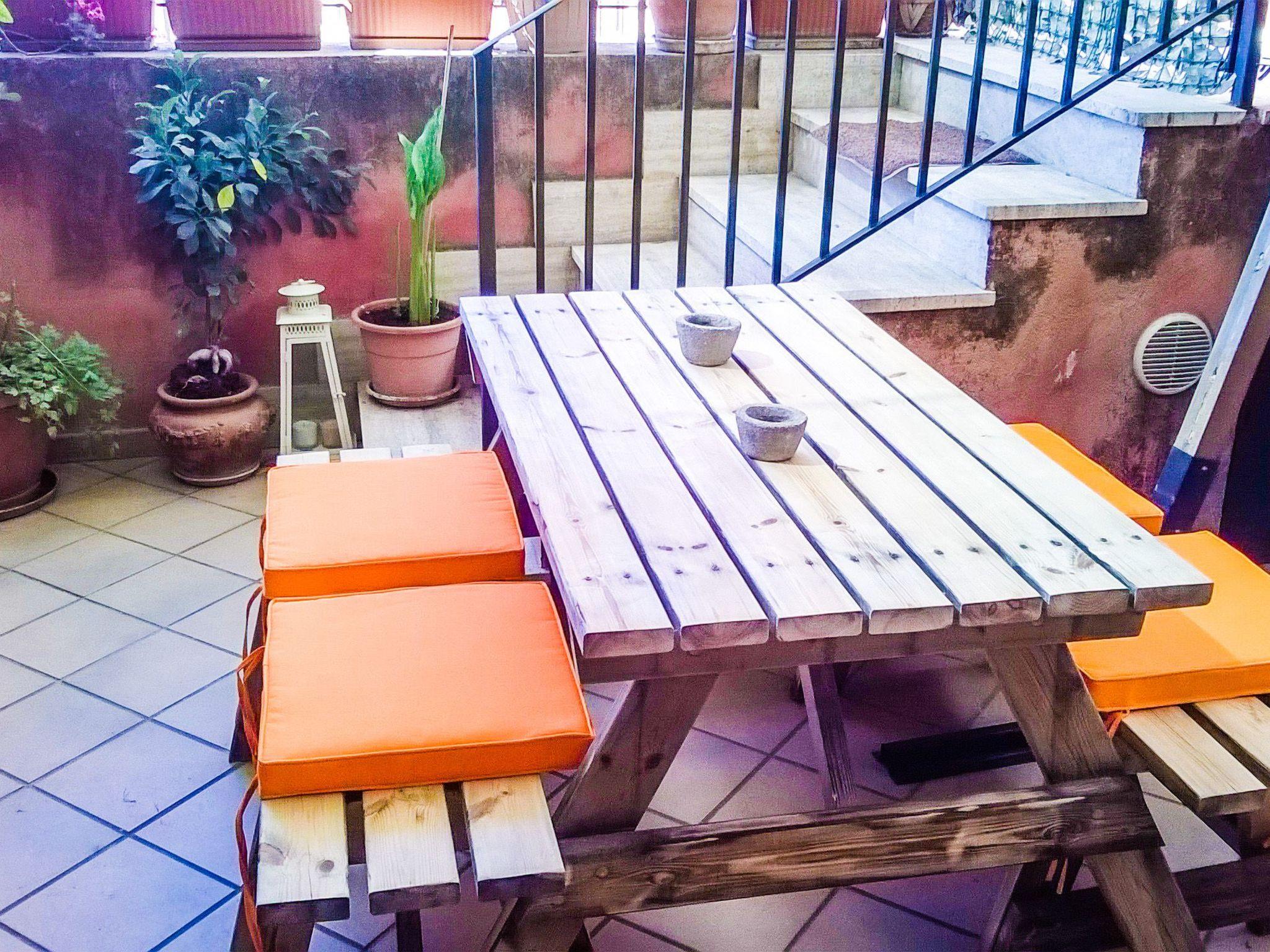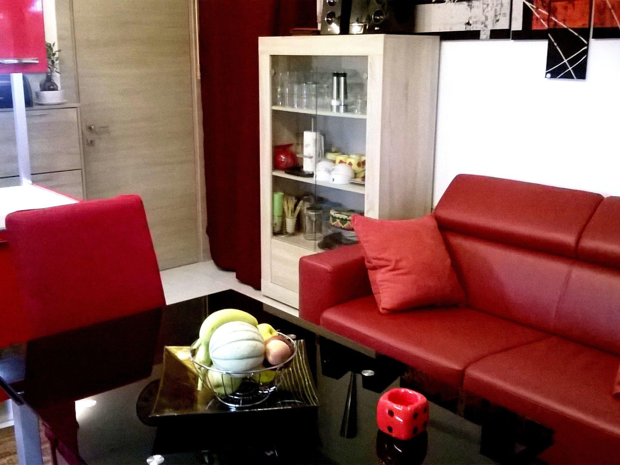 Draußen gibt es eine 16 m² große Terrasse, die mit einer Plane überdacht und mit Gartenmöbeln und einem Grill ausgestattet ist. Der Appartementkomplex verfügt über ein Gemeinschaftsschwimmbad (geöffnet von Ende Juni bis Anfang September). Um den Pool herum befindet sich ein bewaldeter Park mit Blumenbeeten. Für die Gäste steht ein Parkplatz auf dem Gemeinschaftsparkplatz zur Verfügung. Auf Anfrage ist es möglich, zwei Fahrräder für Erwachsene und eines für Kinder direkt beim Eigentümer zu mieten.