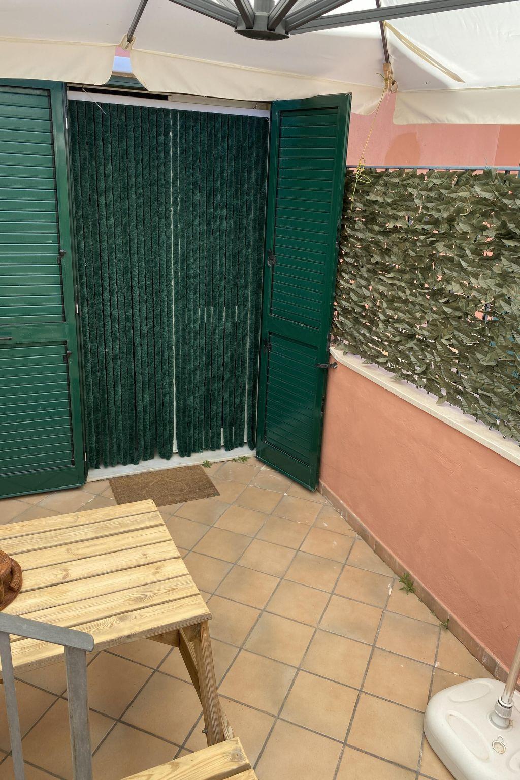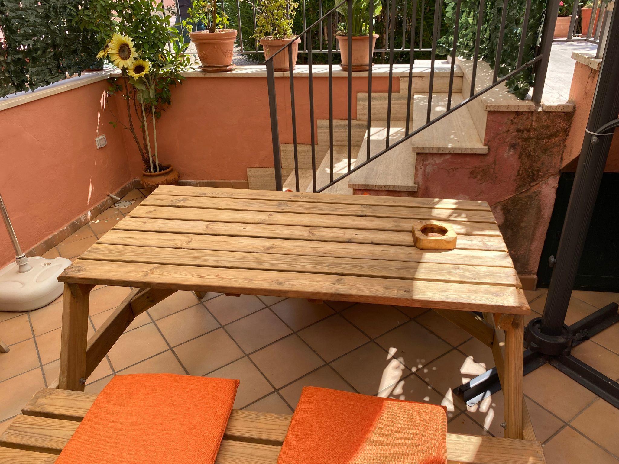 Draußen gibt es eine 16 m² große Terrasse mit Sonnenschirm, Sitzgelegenheiten und einem Grill. Der Komplex verfügt über einen Gemeinschaftspool (geöffnet von Ende Juni bis Anfang September). Ein Garten mit Bäumen und Blumenbeeten umgibt den Pool. Parkmöglichkeiten gibt es auf dem zentralen Parkplatz der Anlage. Zwei Fahrräder für Erwachsene und eines für ein Kind können direkt beim Eigentümer gemietet werden.